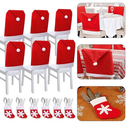 Festive Christmas Dining Table Decor: The Christmas Chair Cover And Sock Cutlery Sleeve Set Will Instantly Transform Your Dining Table Into A Festive Wonderland. With Chair Cover Set Of 6 Designed As Christmas Hats And 6Pcs Of Cutlery Sleeves Featuring Ch