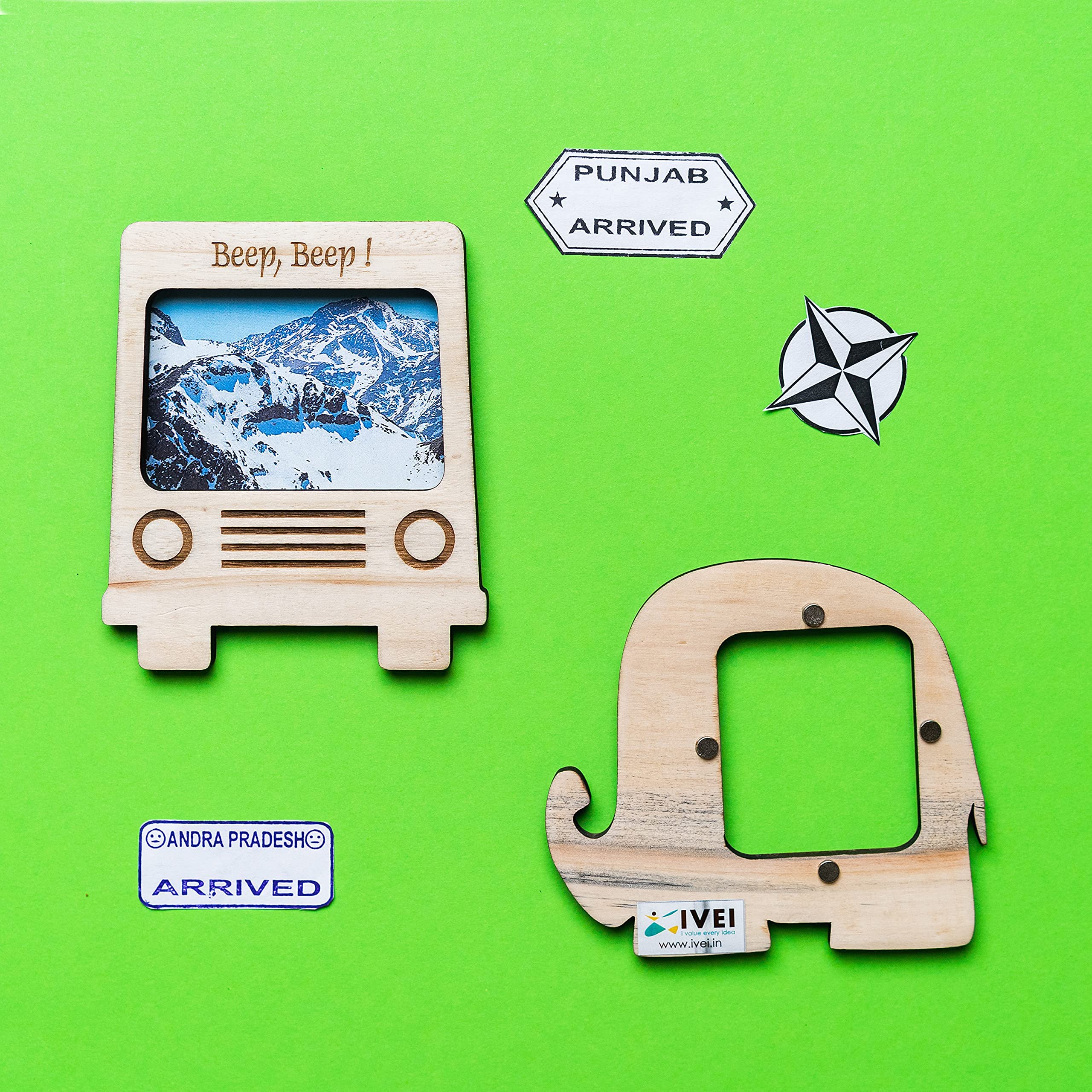 BUS & ELEPHANT PHOTO MAGNET: Fun shaped wood magnets for fridge to stick your favorite memories to your fridge or other magnetic surfaces.