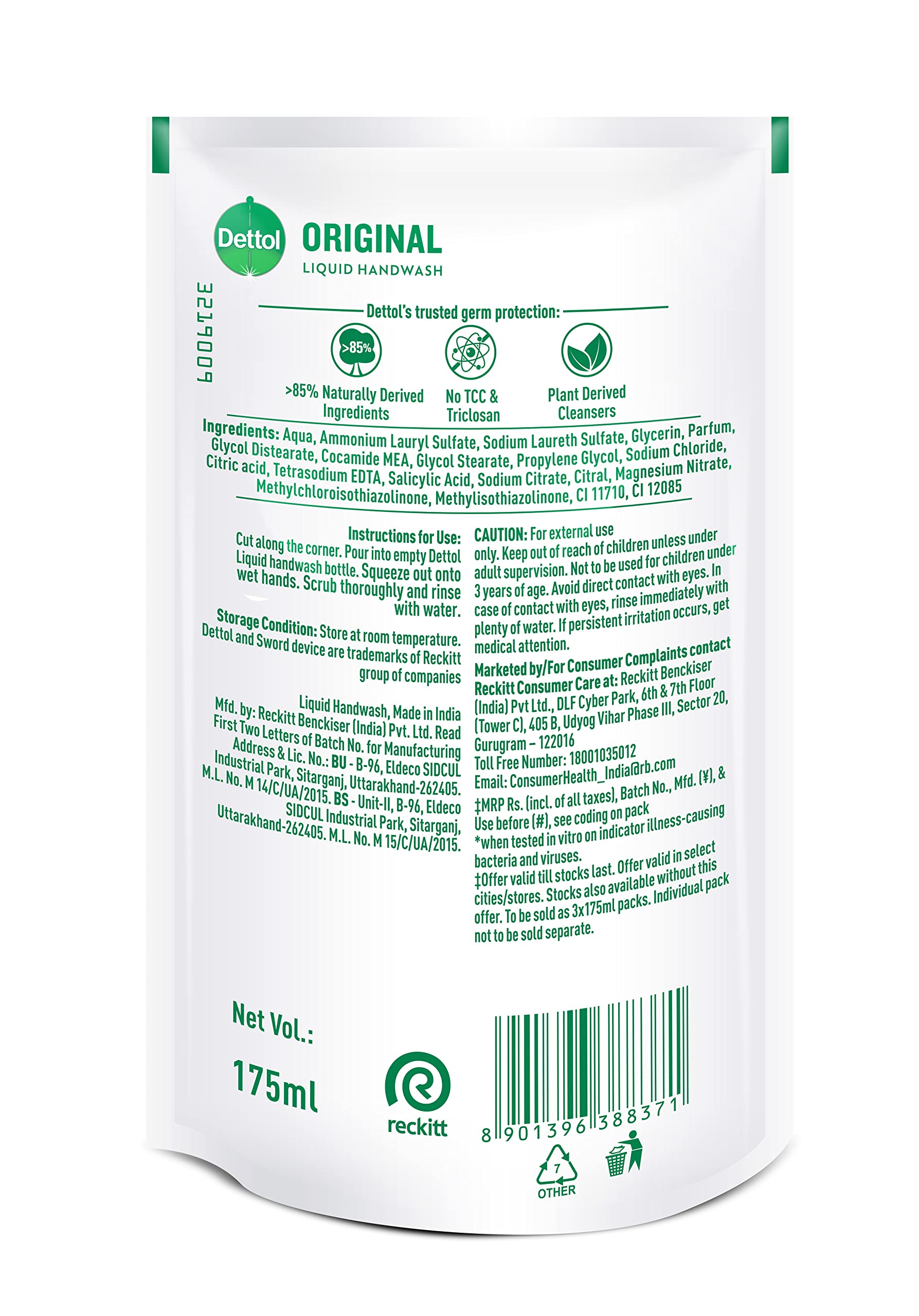 Dettol Liquid Hand Soap 175ml Original Refill (Package May Vary) Pack of 3
