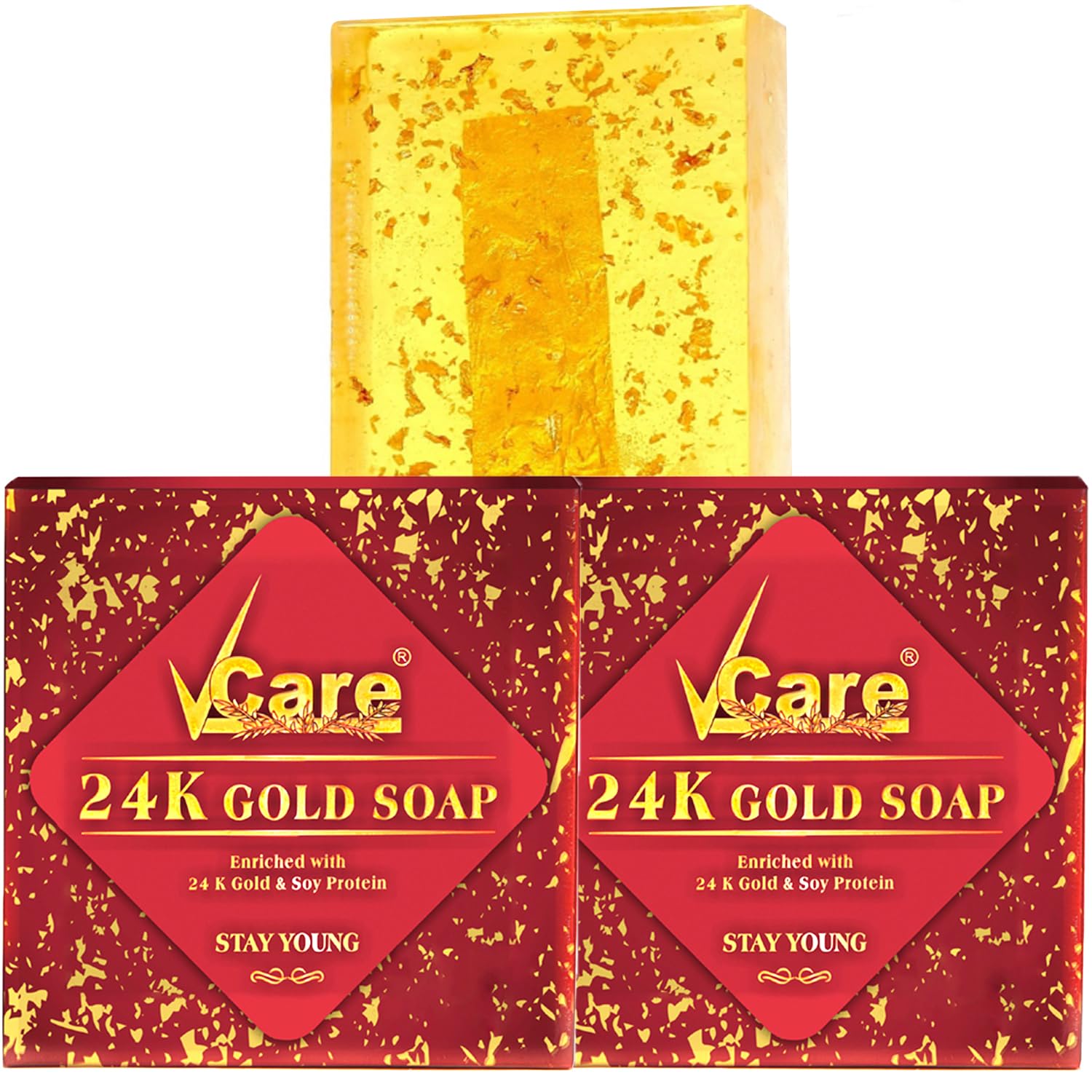 HomeBeautyBodyBath & ShowerSoapsVCare 24K Gold bath Soaps for women| Skincare Moisturizing Beauty Bathing Soap Bar | With 24K Gold & Soy Protein | Softer Skin | All Skin Types (Pack of 2) 125 g