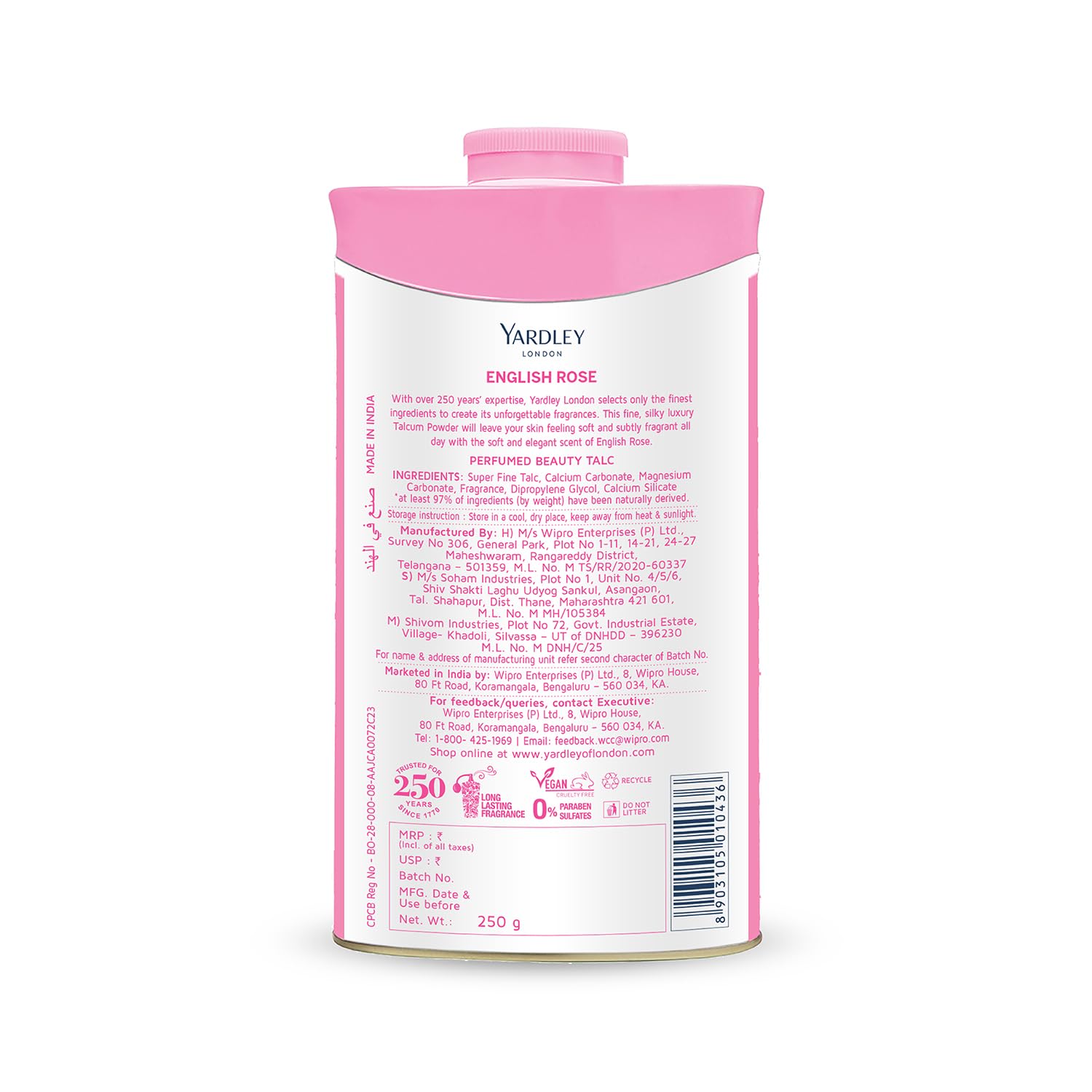 HomeBeautyBodyBody CareTalcum PowderYardley London English Rose Perfumed Talc Spray for Women with Super Fine Talc Calcium Carbonate Magnisum Carbonate Fragrance Dipropylene Glycol Calcium Silicate Triclosan Pack of 1 250g