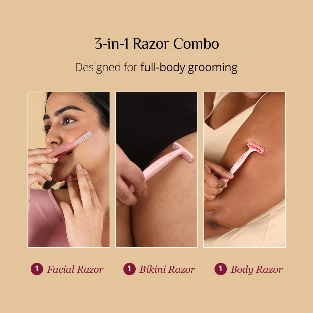 PACK OF 3 RAZORS: This combo contains 1 Facial Razor 1 Bikini Razor and 1 Body Razor.