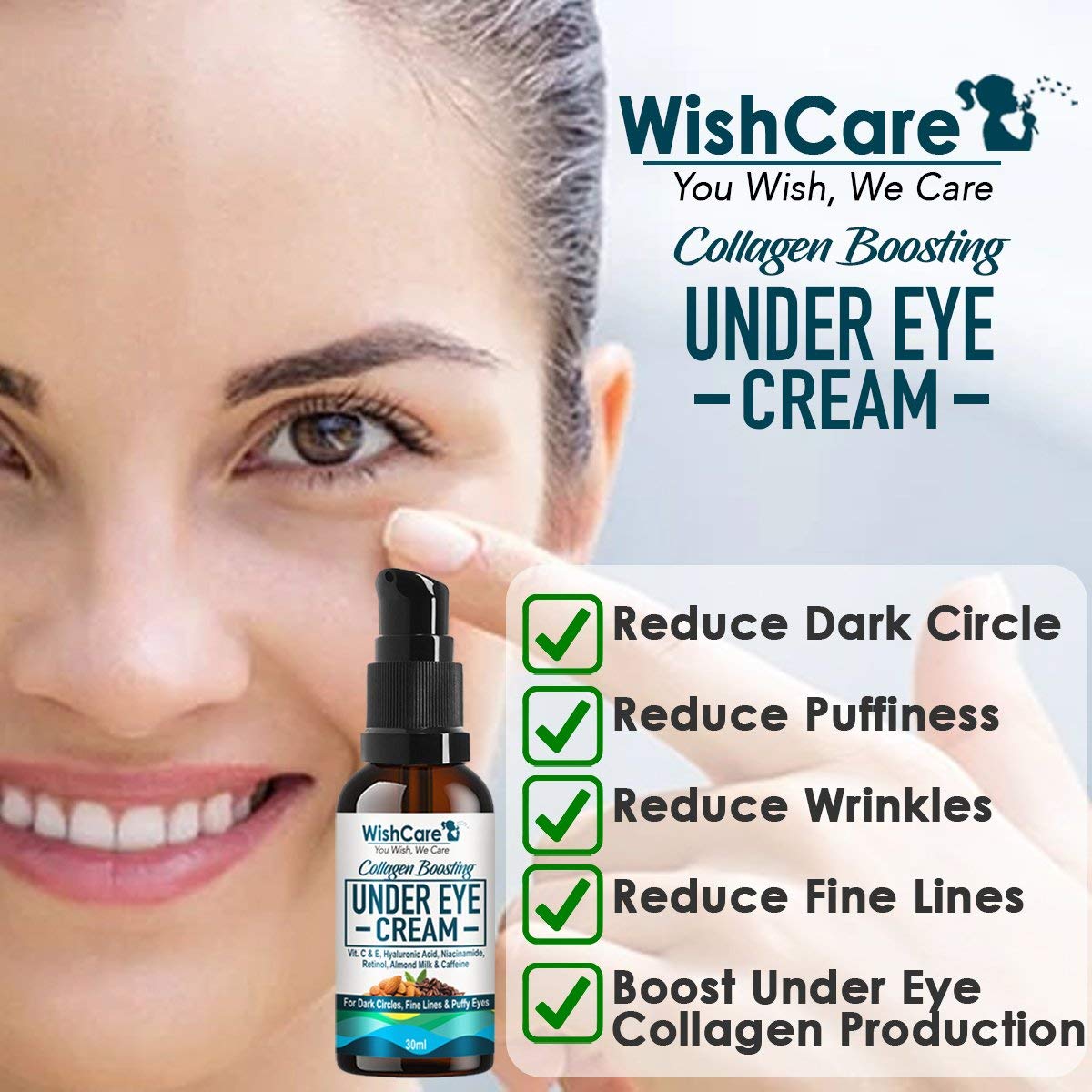 WishCare Under Eye Cream will reignite the sparkle in your tired and puffy looking eyes with a gentle but powerful Collagen Boosting formulation with Coffee Almond Milk Hyaluronic Acid Retinol & Vitamin C. Its Long-lasting actives release throughout all h