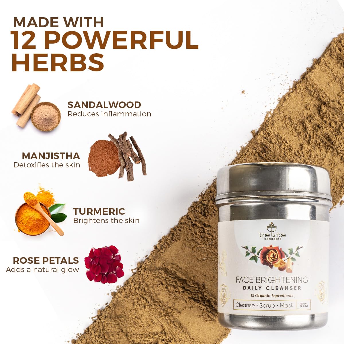 INSTANT BRIGHTENING GLOW Reveal a radiant complexion with every use. The Tribe Concept face mask for glowing skin unique blend of Rose Petals Organic Sandalwood Neem Leaves and Wild Turmeric works together to brighten and even out your skin tone giving yo