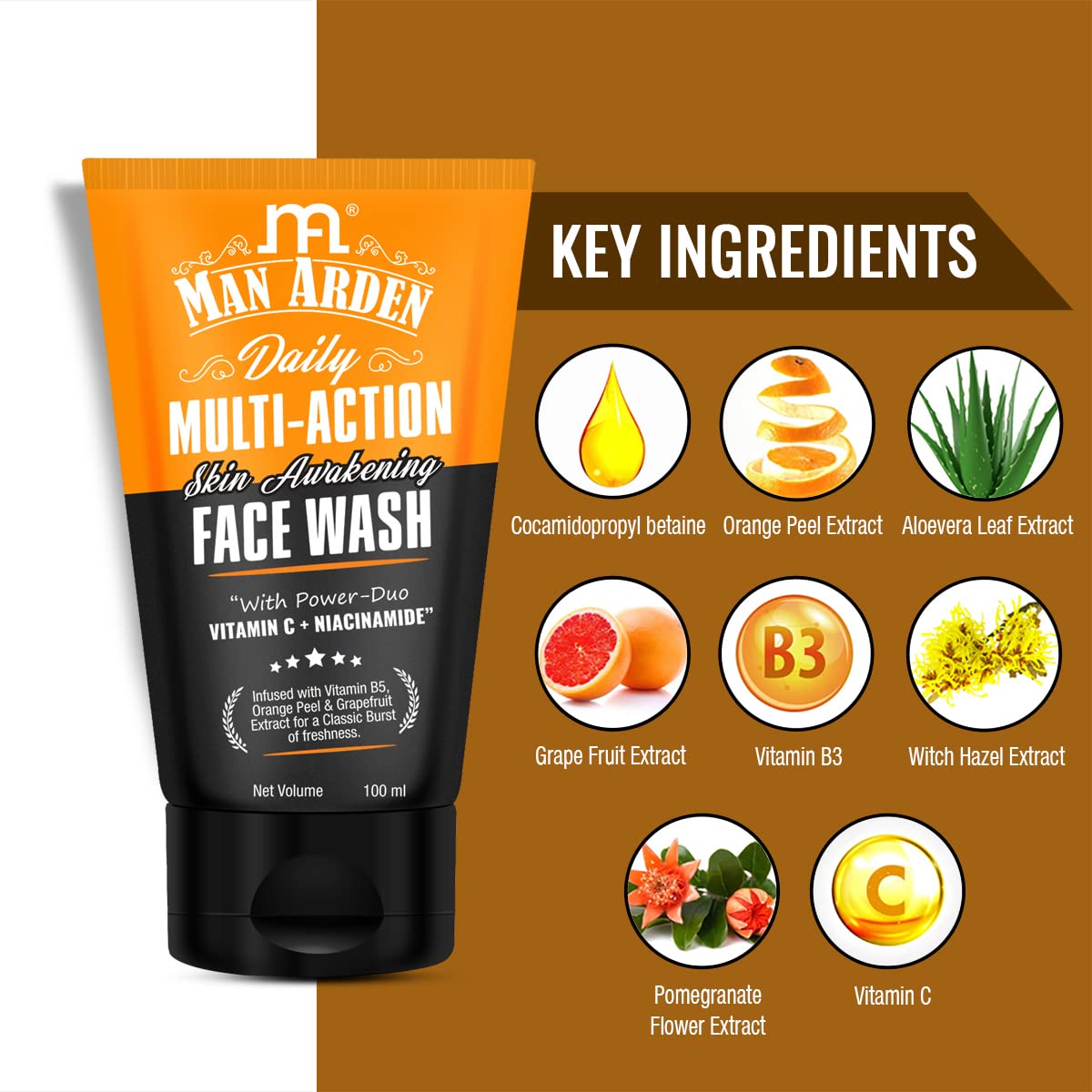 The goodness of natural ingredients: The orange peel and grapefruit extract perfectly blend with the other ingredients of the Man Arden Multi-Action Skin Awakening Face Wash and enhance its functionality. Together they cleanse your skin and prevent aging