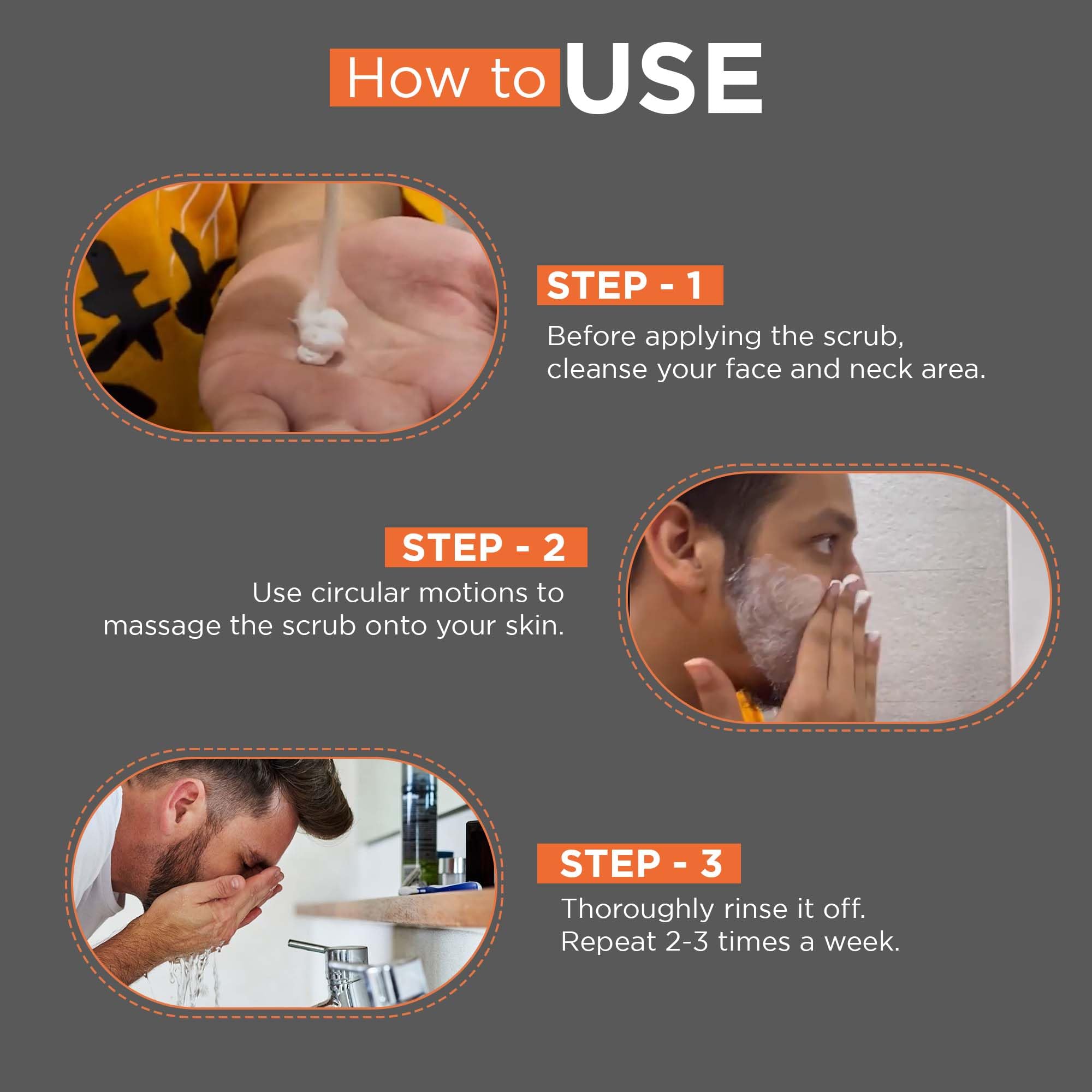 Cleanse your face & neck area gently and pat dry. Apply the detan scrub on your face and neck be careful around the eye area. Gently massage with steady circular motions to exfoliate. Now rinse the scrub off your face thoroughly
