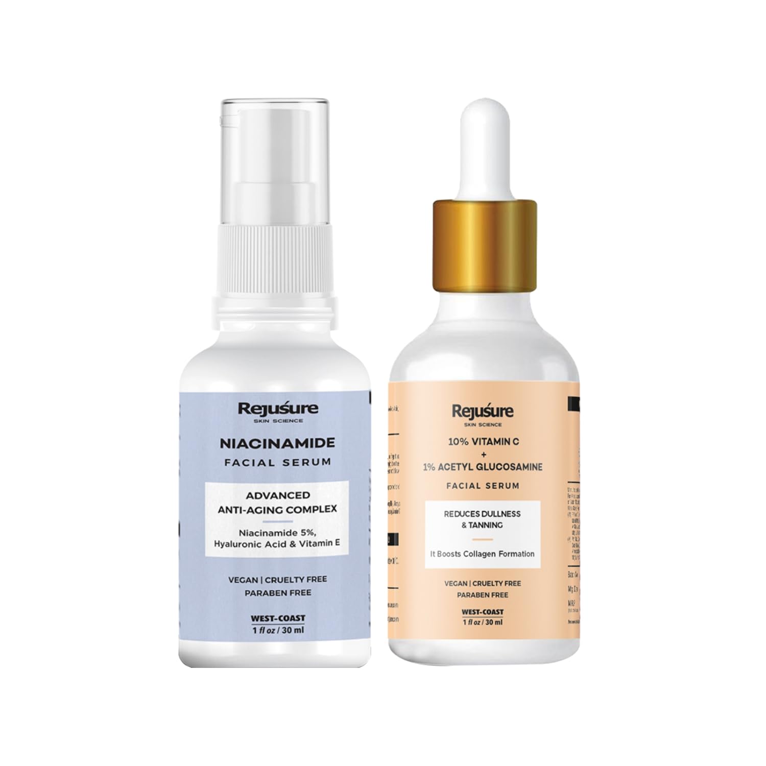 Rejusure Skin Brightening Duo | 5% Niacinamide Facial Serum (30ml) & 10% Vitamin C + 1% Acetyl Glucosamine Facial Serum (30ml) - Radiant Complexion and Even Skin Tone