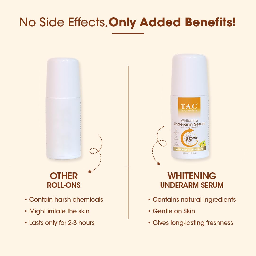 AYURVEDIC UNDERARM ROLL ON FOR WOMEN: Say goodbye to dark underarms and nasty odours with the T.A.C Whitening Underarm Serum Roll-On. It helps keep your underarms skin even tone without any blemishes & dark patches.