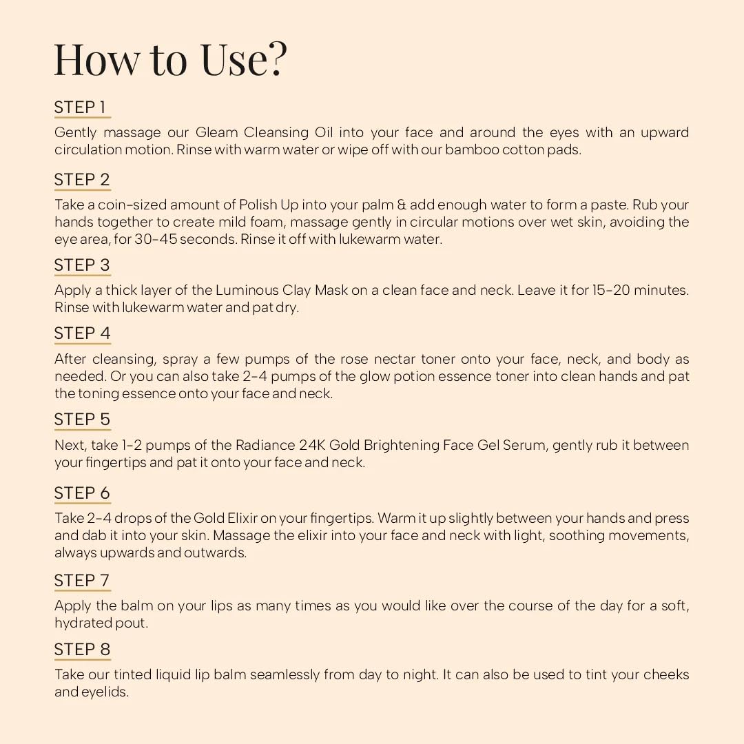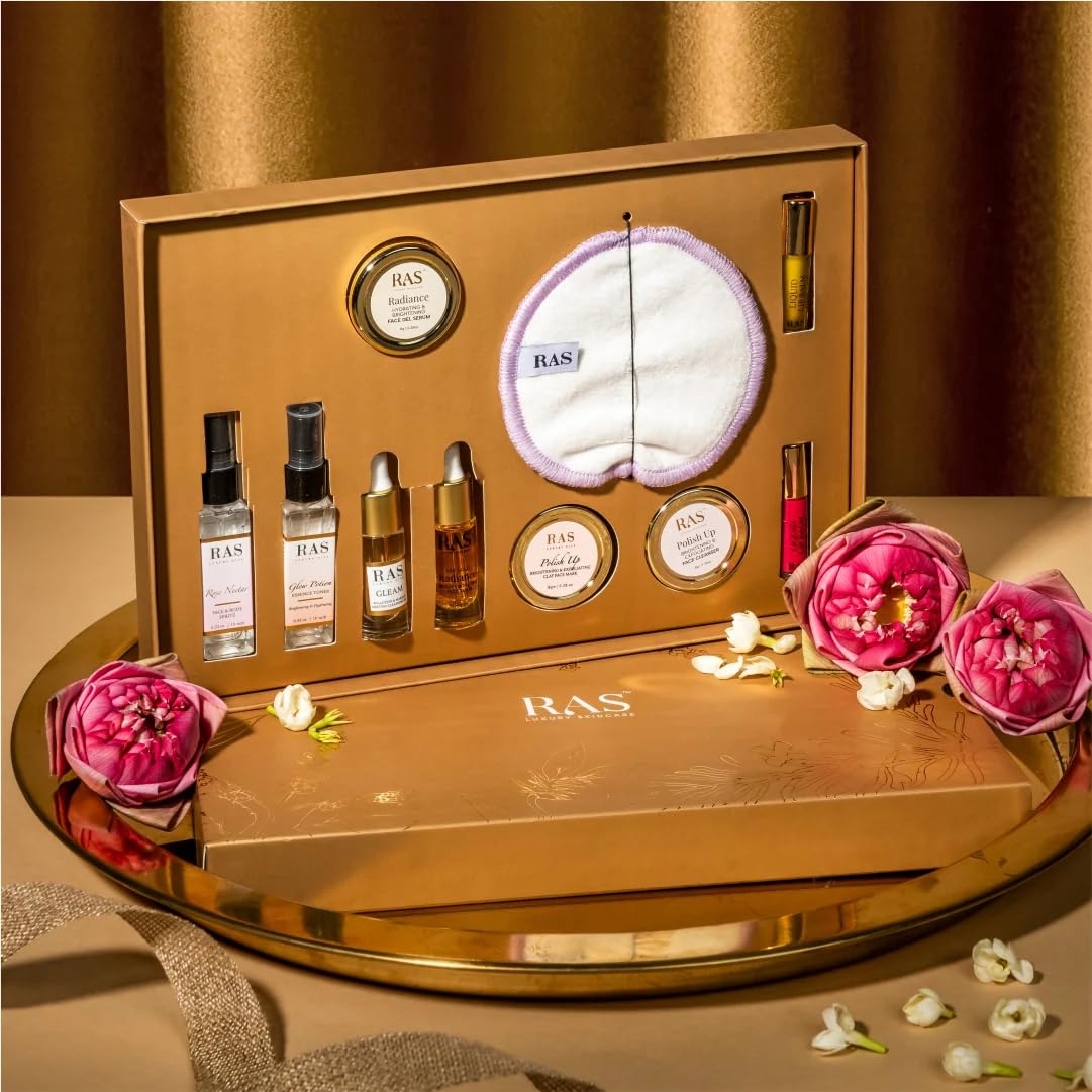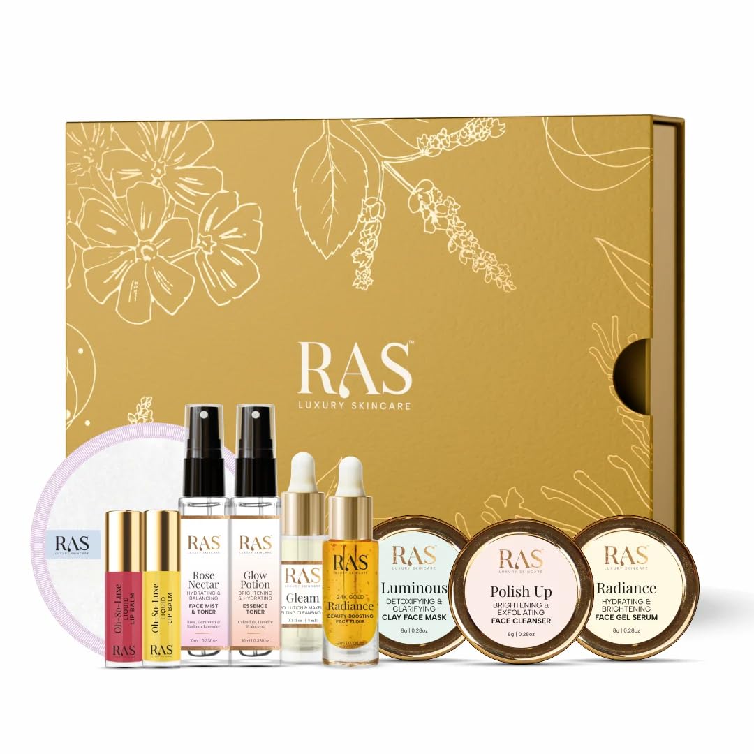 RAS Luxury Oils 10-piece Glow Essentials Miniature Set | Helps Cleanse, Brighten & Calms Skin | Keeps Skin Nourished & Hydrated | Contains Rice Powder, 24-K Gold, Aloe & Niacinamide, Pack of 10