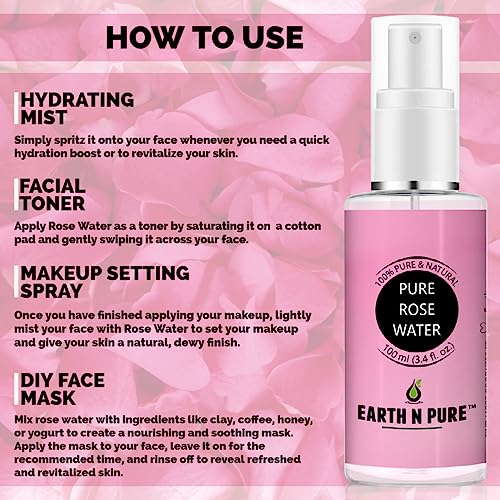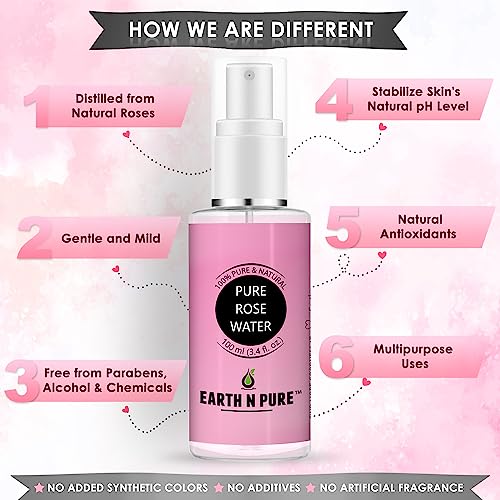 HomeBeautyFace CareTonersToners & MistsEarth N Pure Natural Rose Water 100Ml | Distilled from Roses with Nothing Artificial, Ideal for Oil Control, Balancing Skin pH level, Glowing Skin, Face mist & Tonner.