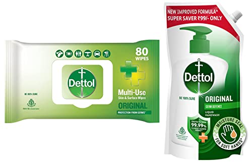 Dettol Disinfectant Sanitizer Wet Wipes for Skin & Surfaces, Original – 80 Count & Dettol Liquid Handwash Refill - Original Germ Protection Hand Wash- 750ml