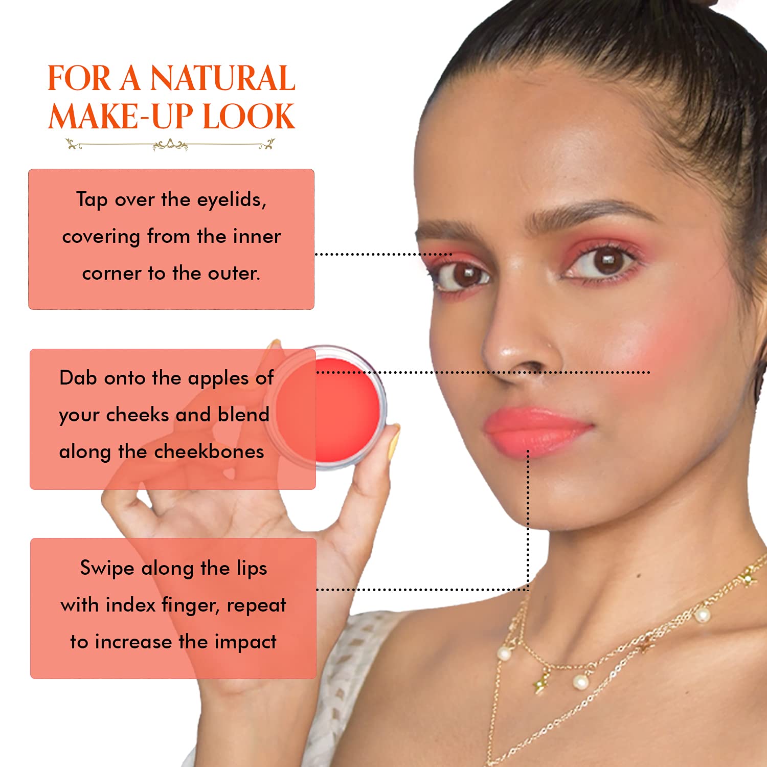 SOFT & DEWY LOOK: The Peach tint gives a gentle soft look on the lips and cheeks leaving a dewy effect. The Peach lip and cheek tint do not just add colour to your lips and cheeks but also to your eyelids. The creamy texture glides smoothly on the area gi
