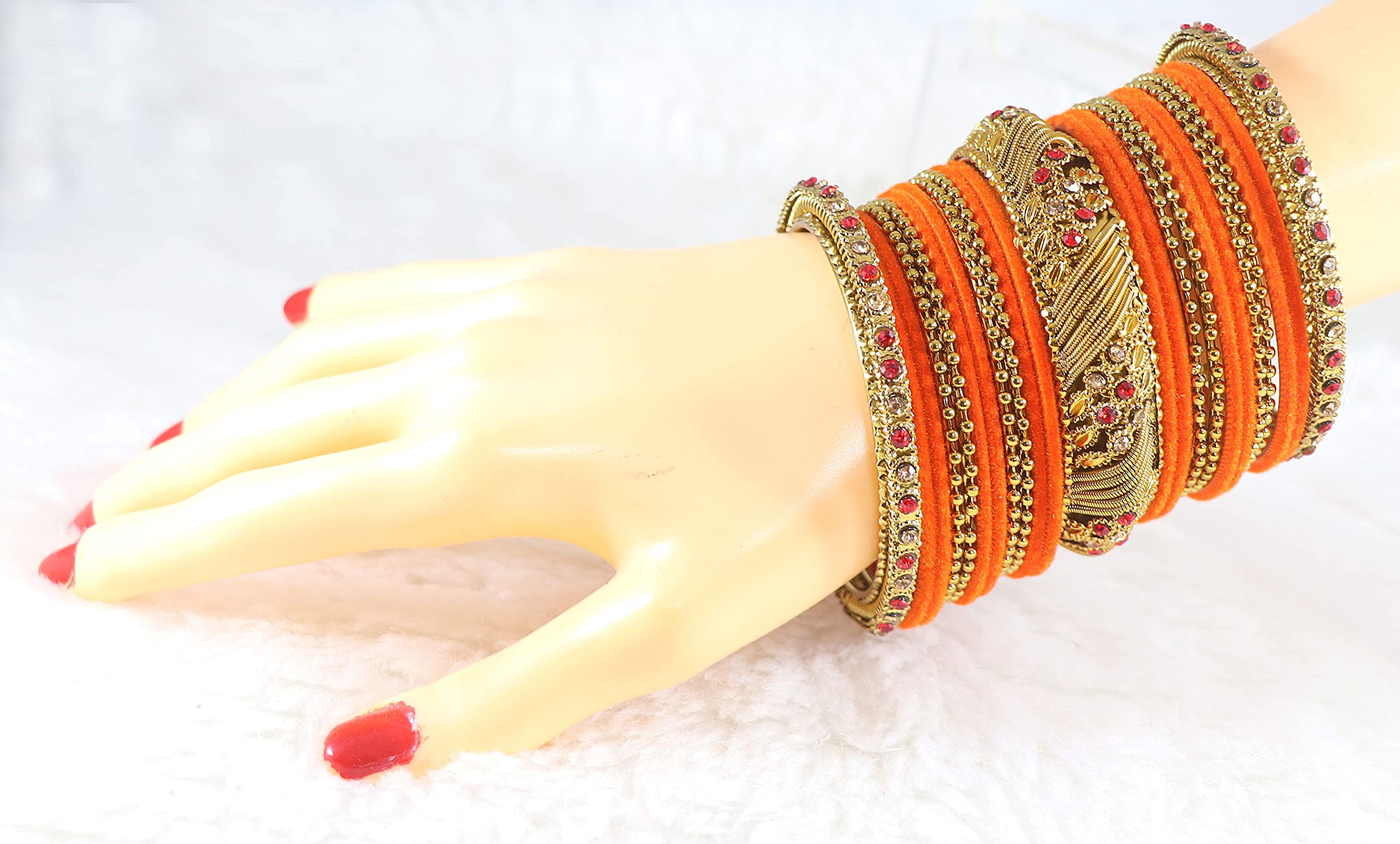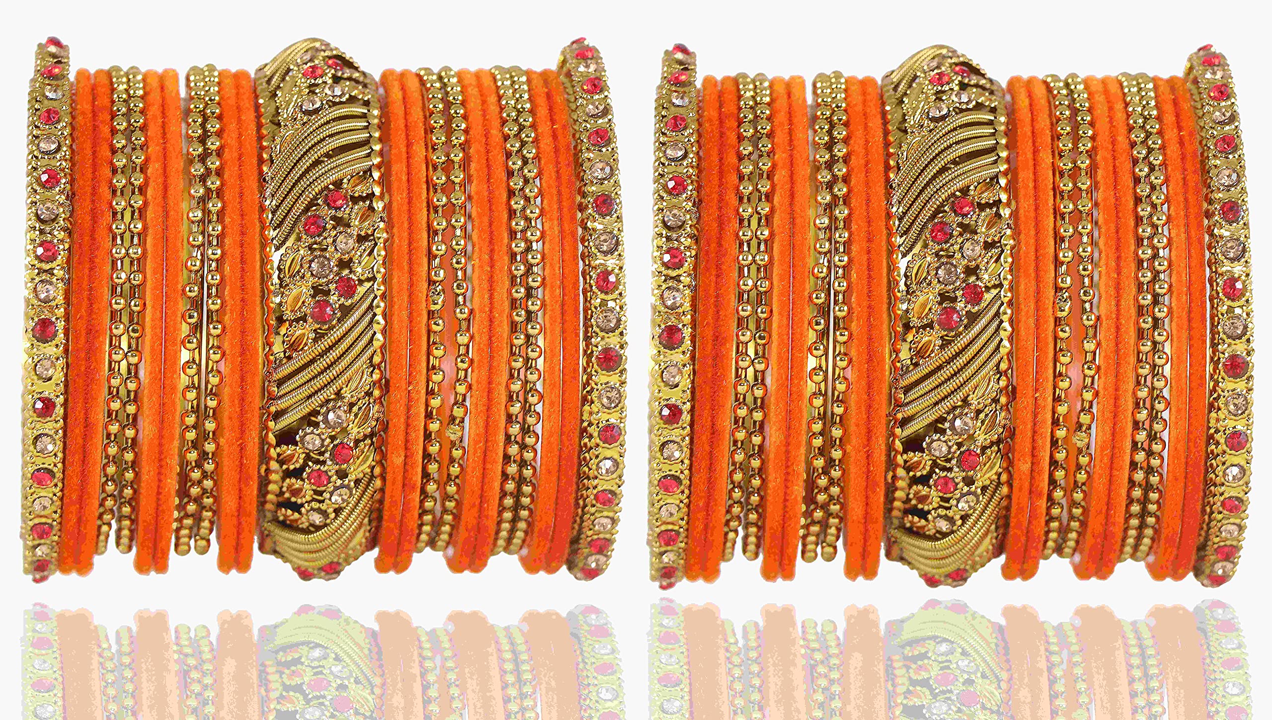 NMII Metal with Zircon Gemstone and Beads Studded Ball Chain Linked Glossy Finished Velvet Bangles Chuda set for Women and Girls