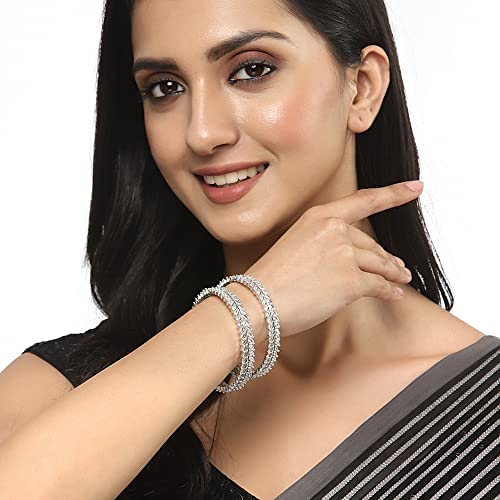 Women's Rhodium-Plated Silver Toned White American Diamond Studded Lead Shape Bangle Jewelry Set (Set Of 2)
