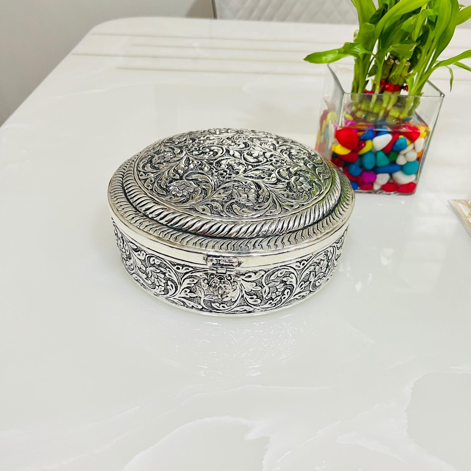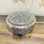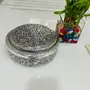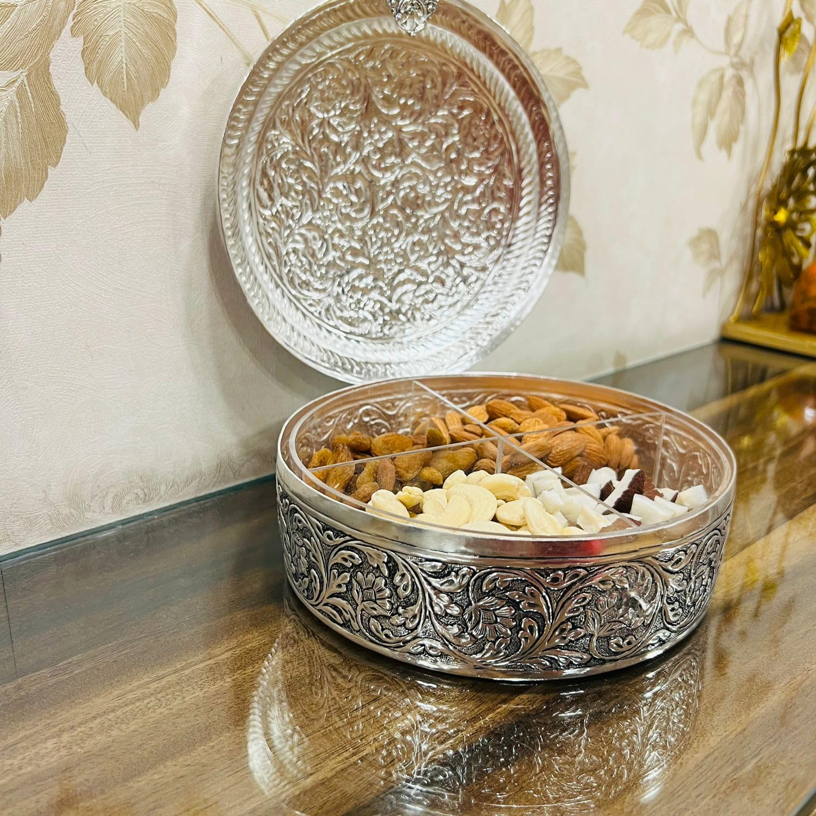 HomeFashionBoxes & HoldersTIBETAN SILVER ENGRAVING PRODUCTS German Silver Handengraved Dryfruit Box with 4 Partition Acrylic Compartment for Serving Snacks - Dimension (L x B x H) :- 8 x 8 x 3.5 Inch