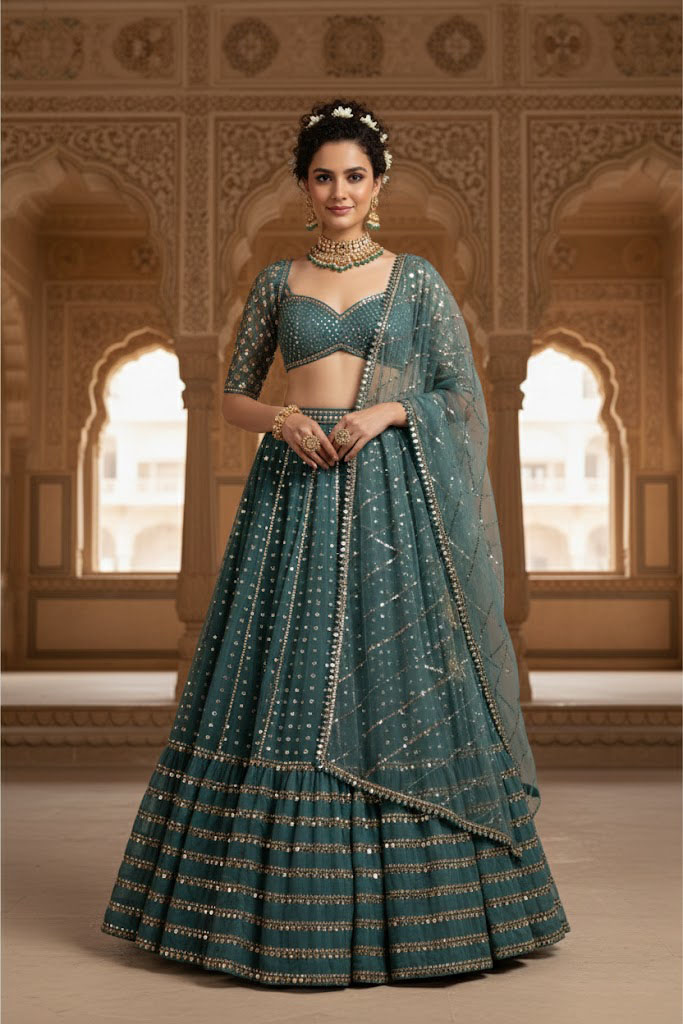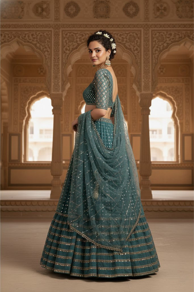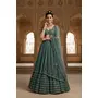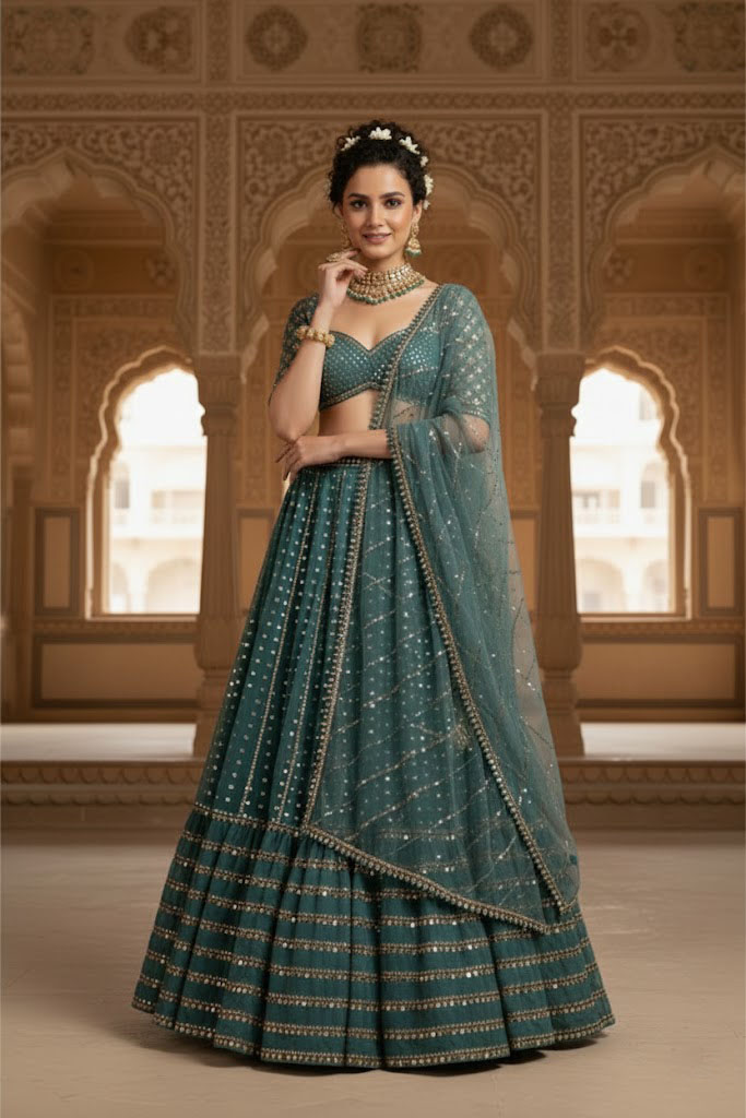 Green Sequin Embroidered Faux Georgette Lehenga Set