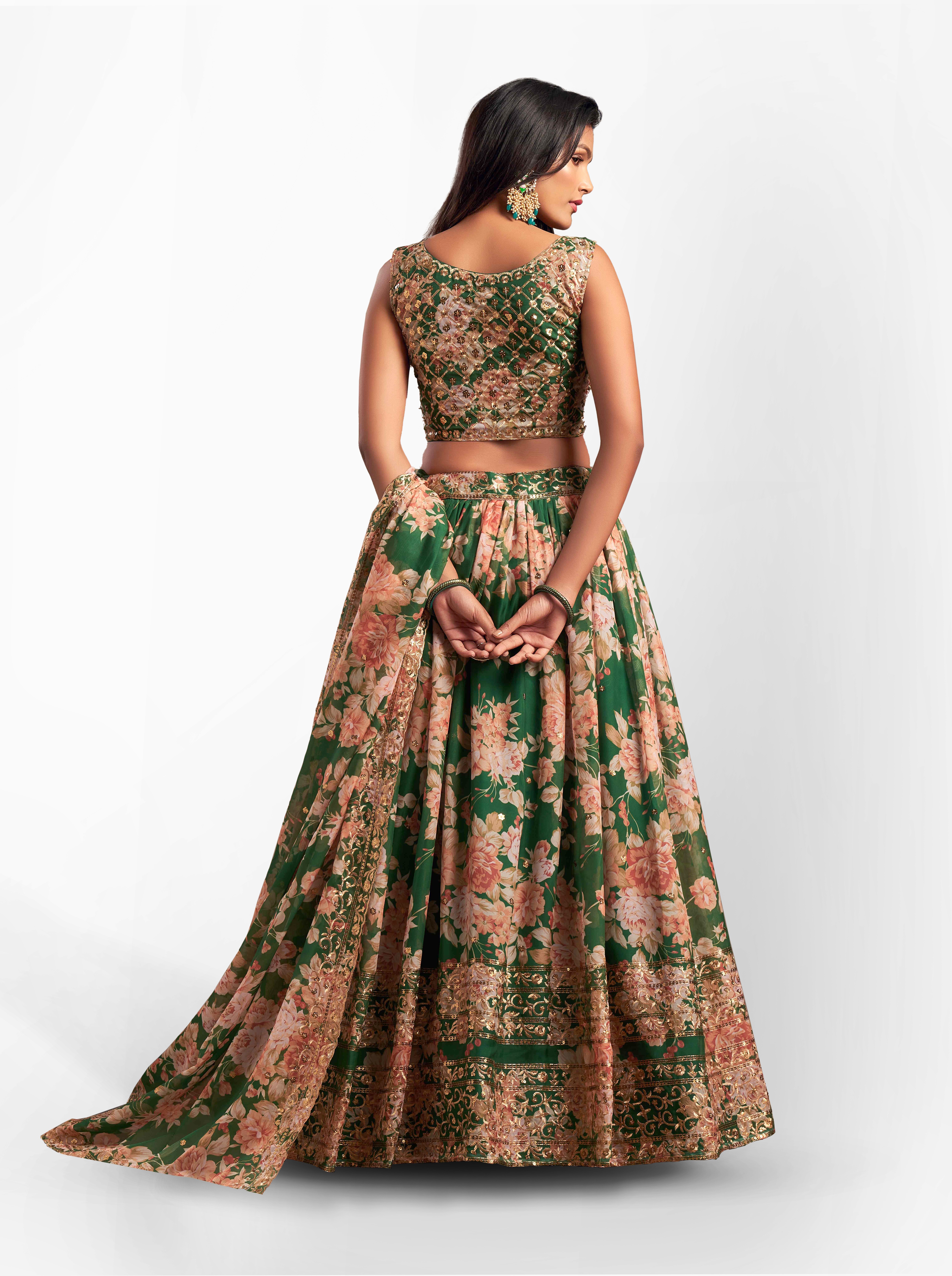 Womens Green Organza Sequence Work,Floral Work Embroidery Lehenga Set