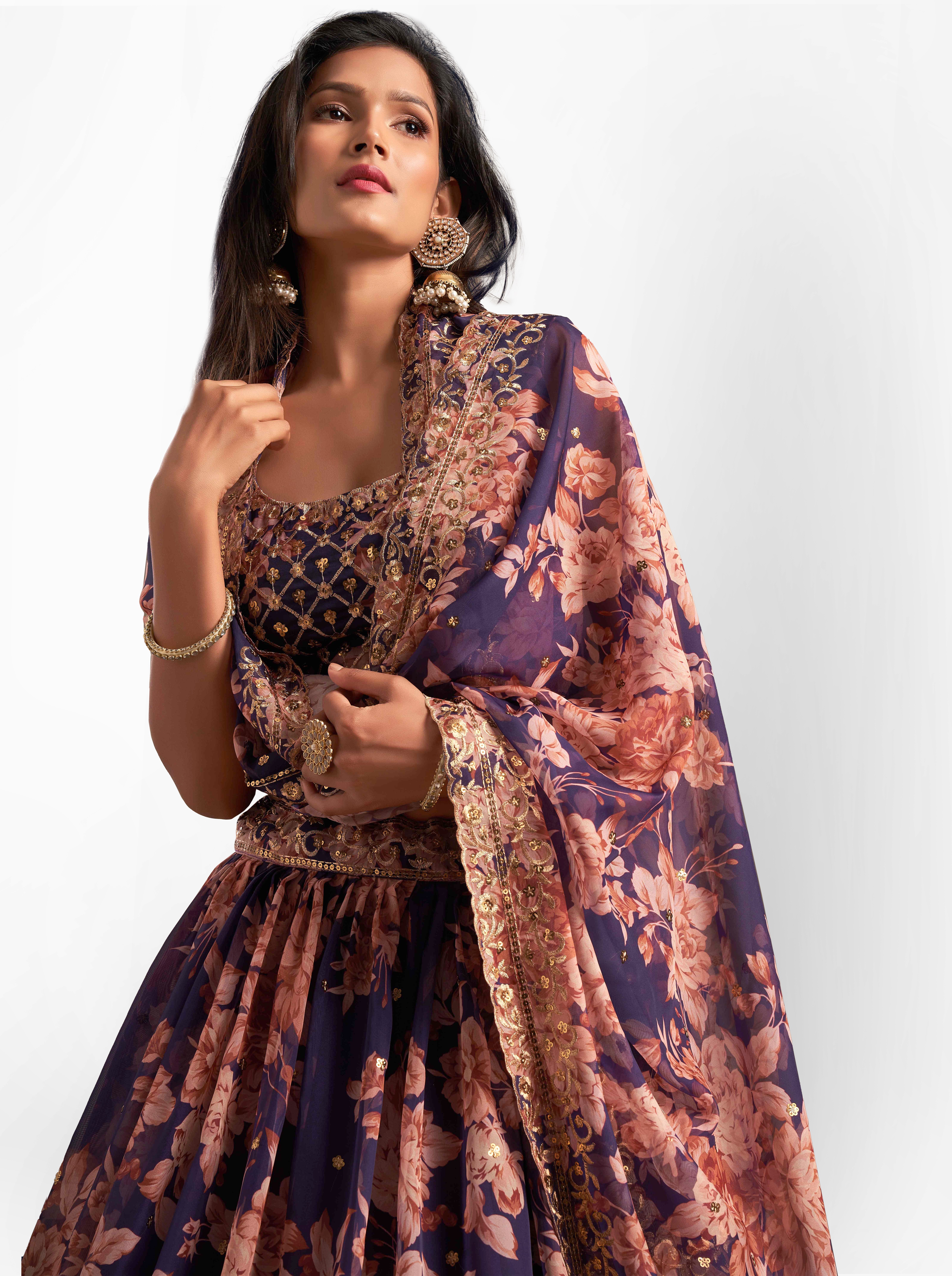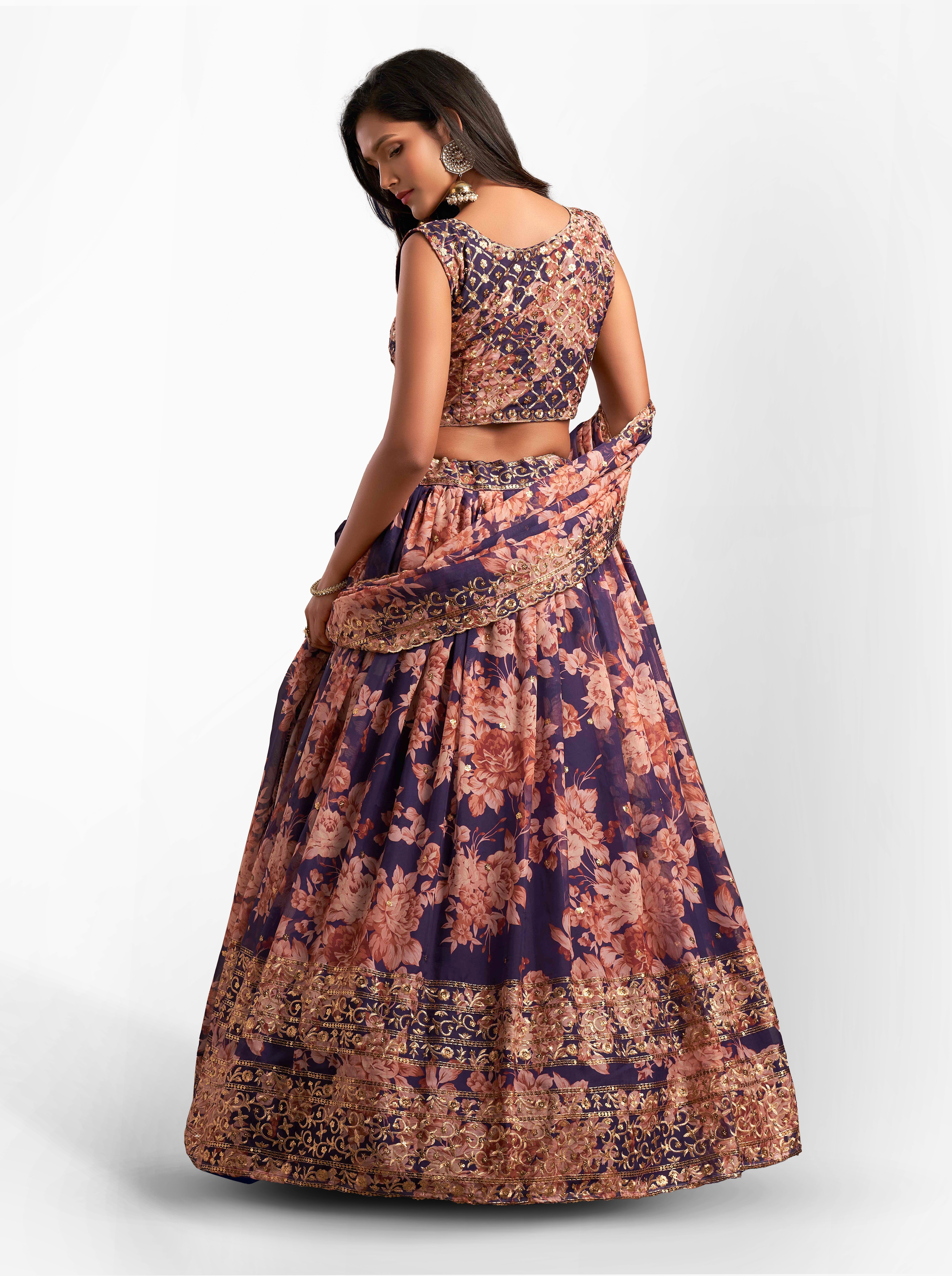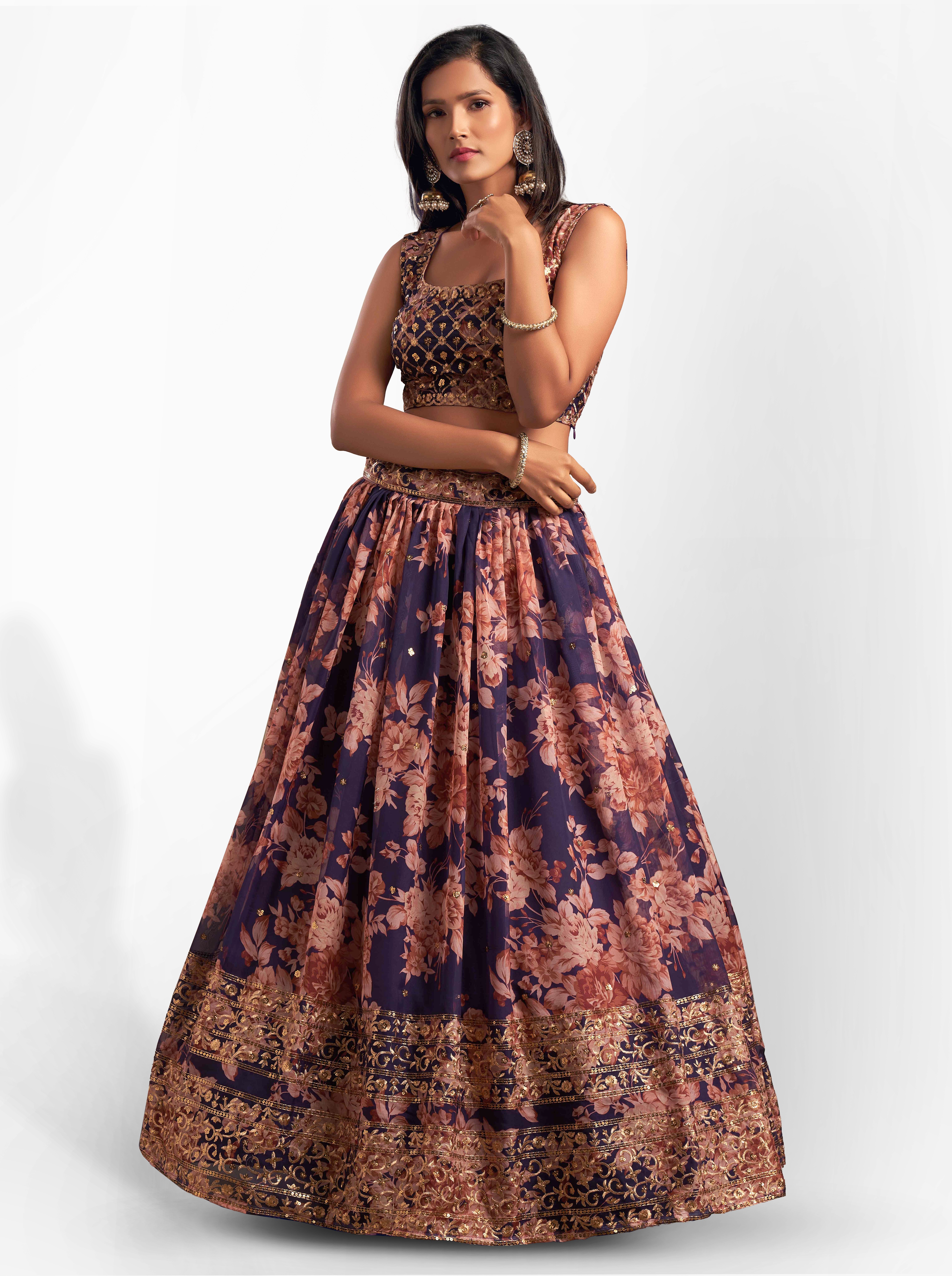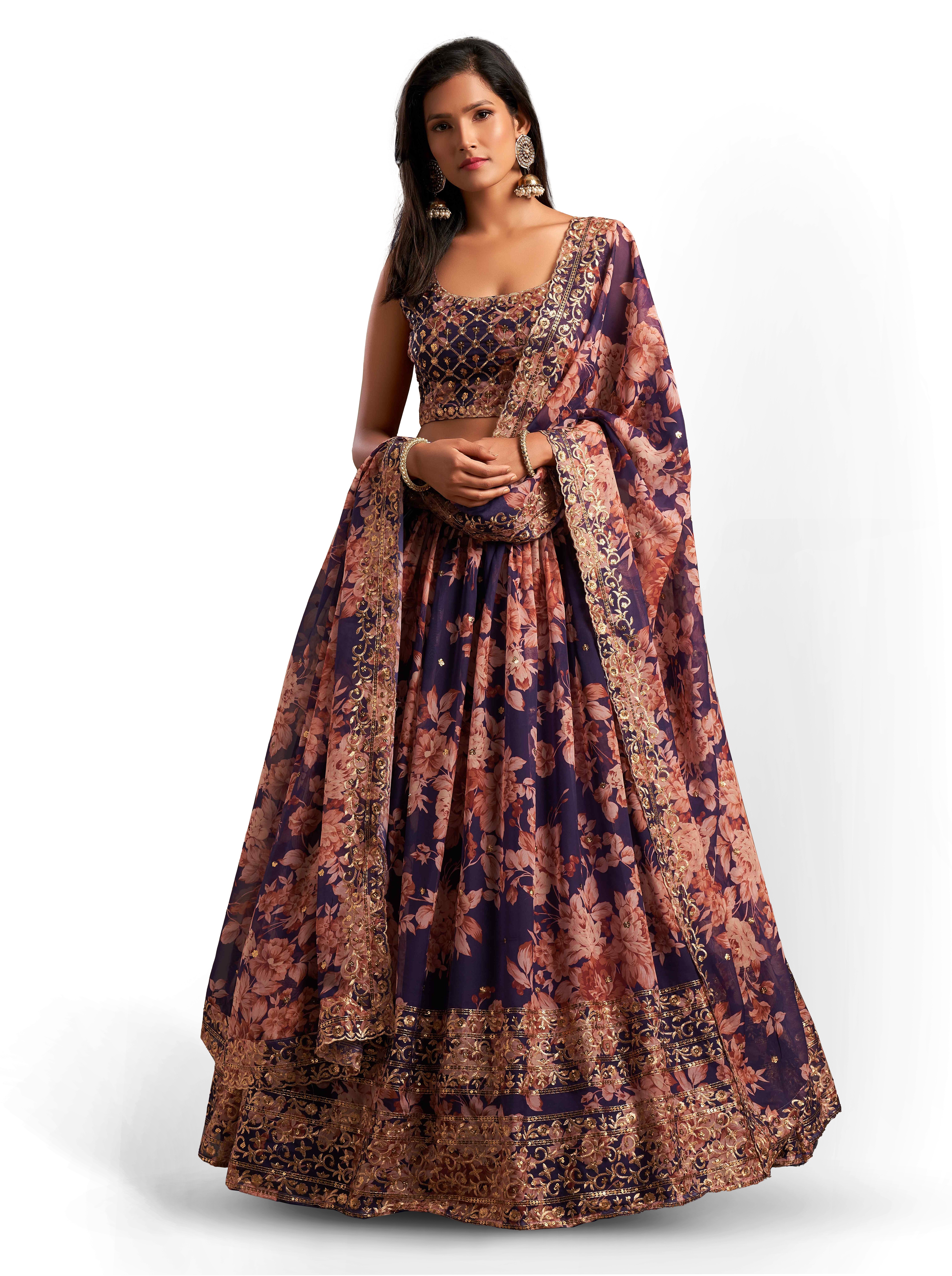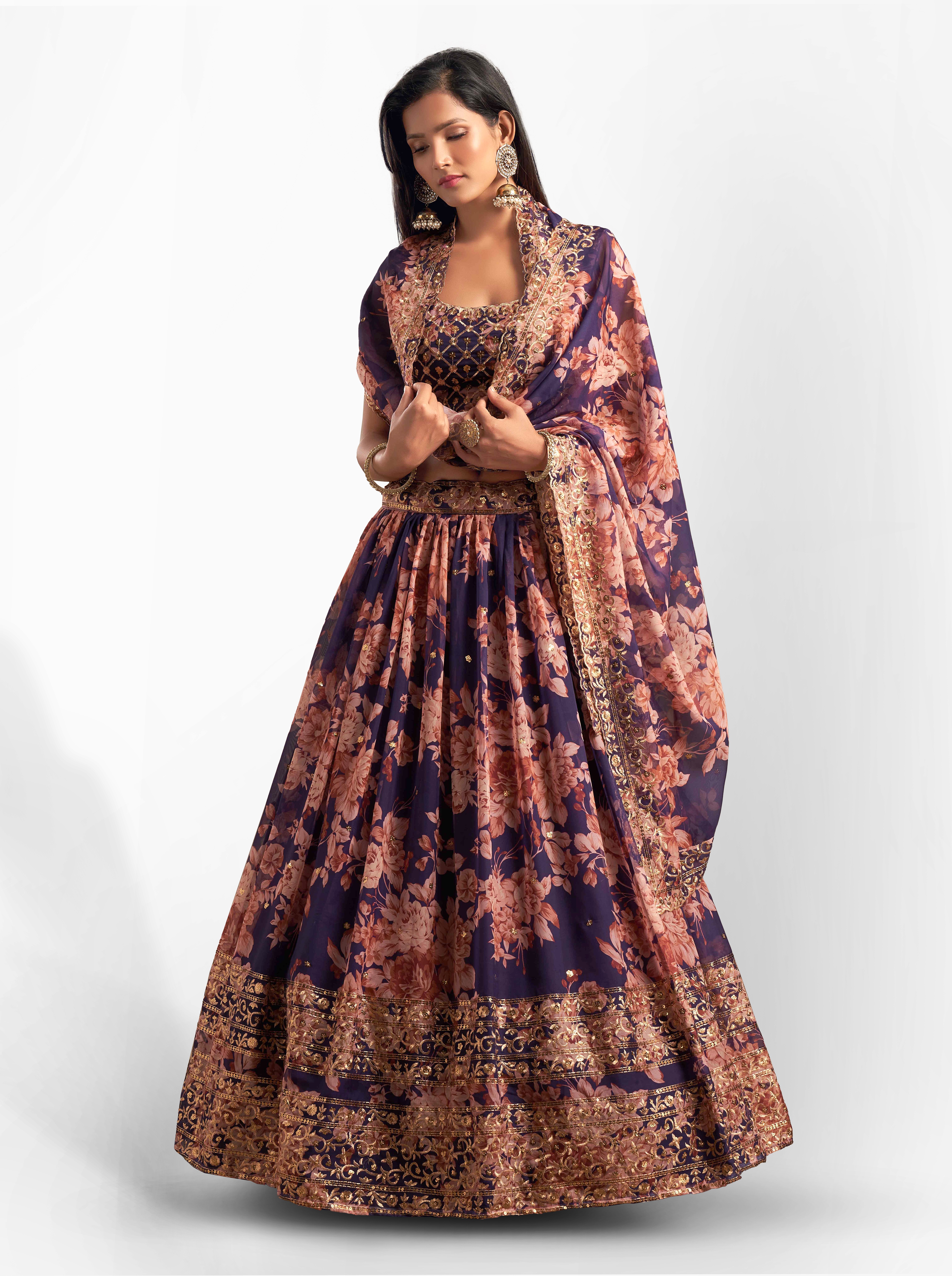 Womens Purple Organza Sequence Work,Floral Work Embroidery Lehenga Set