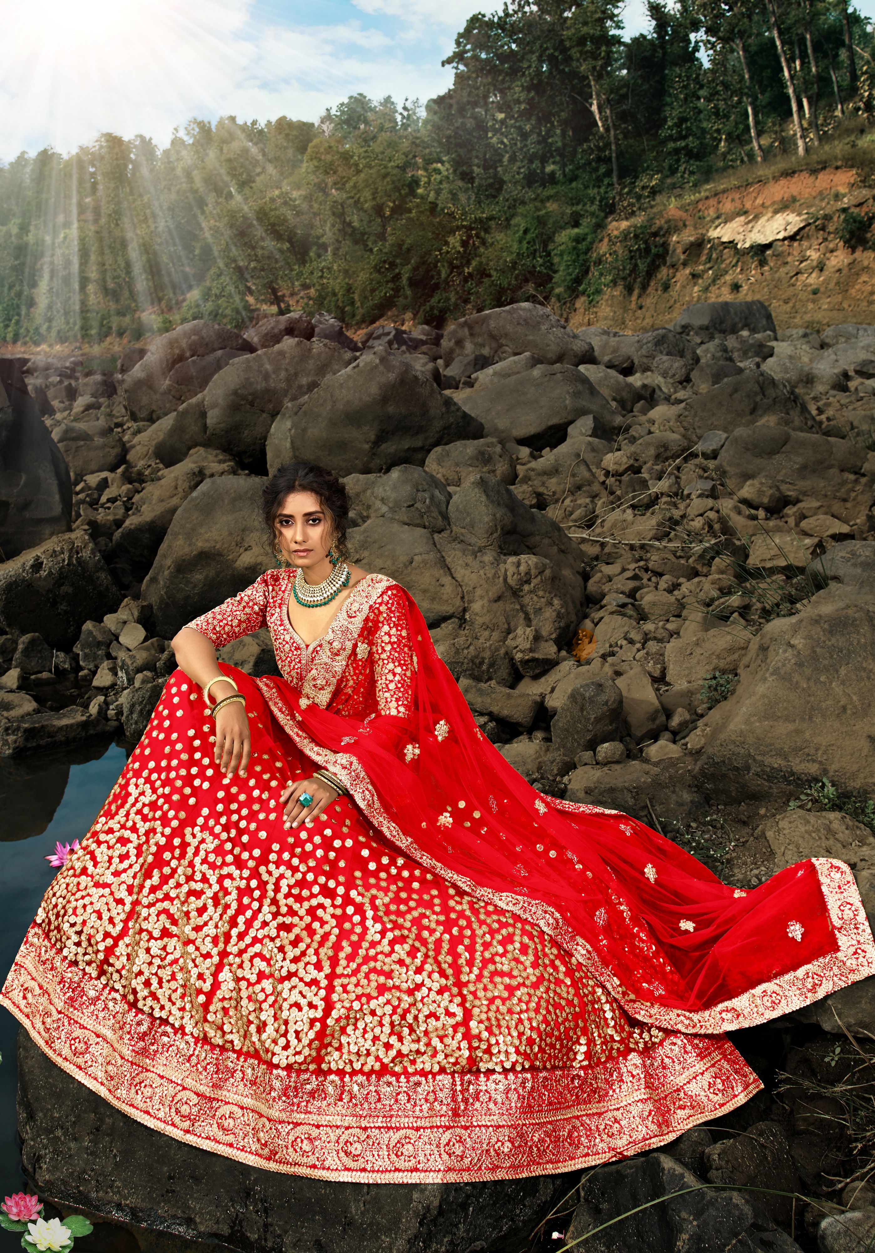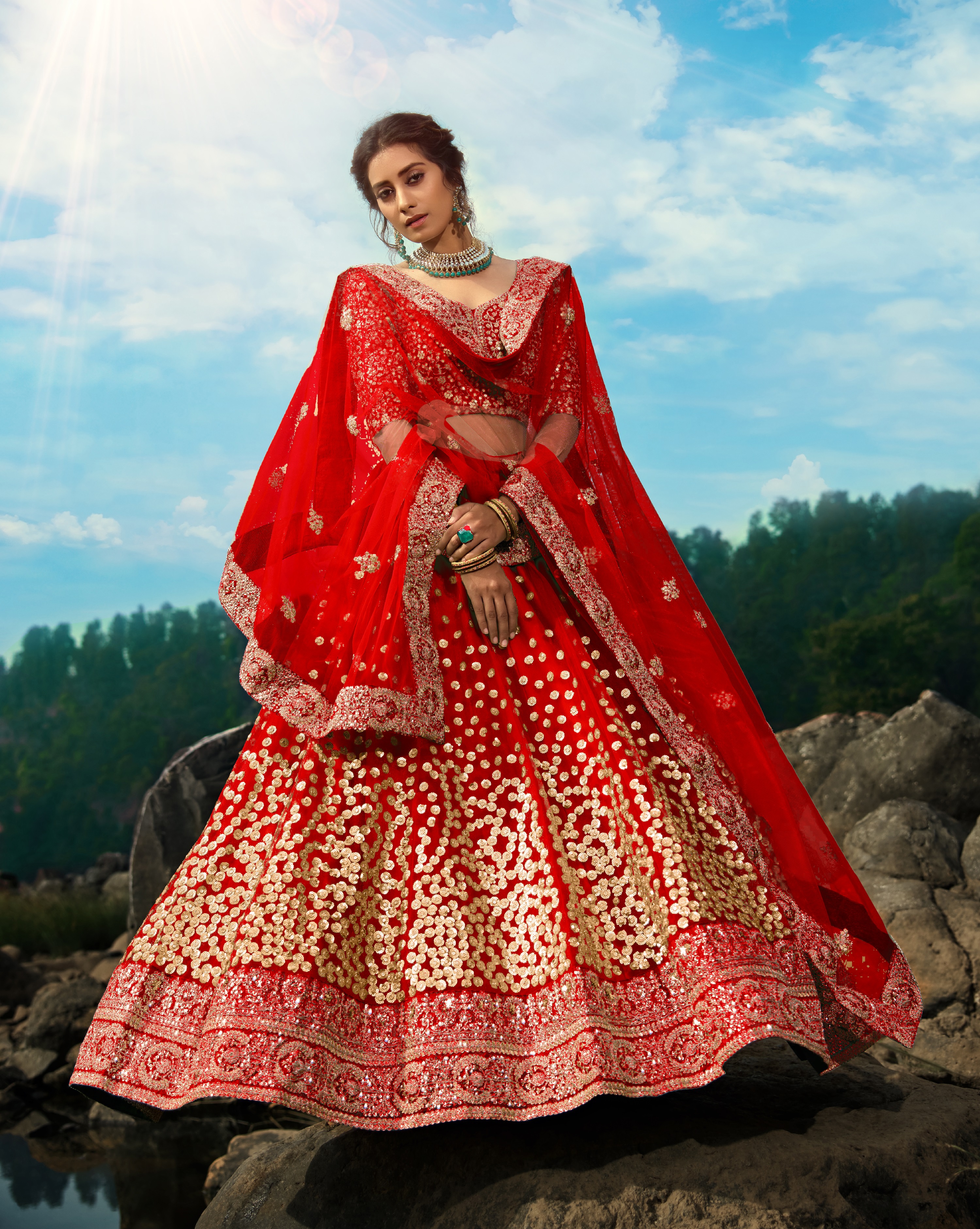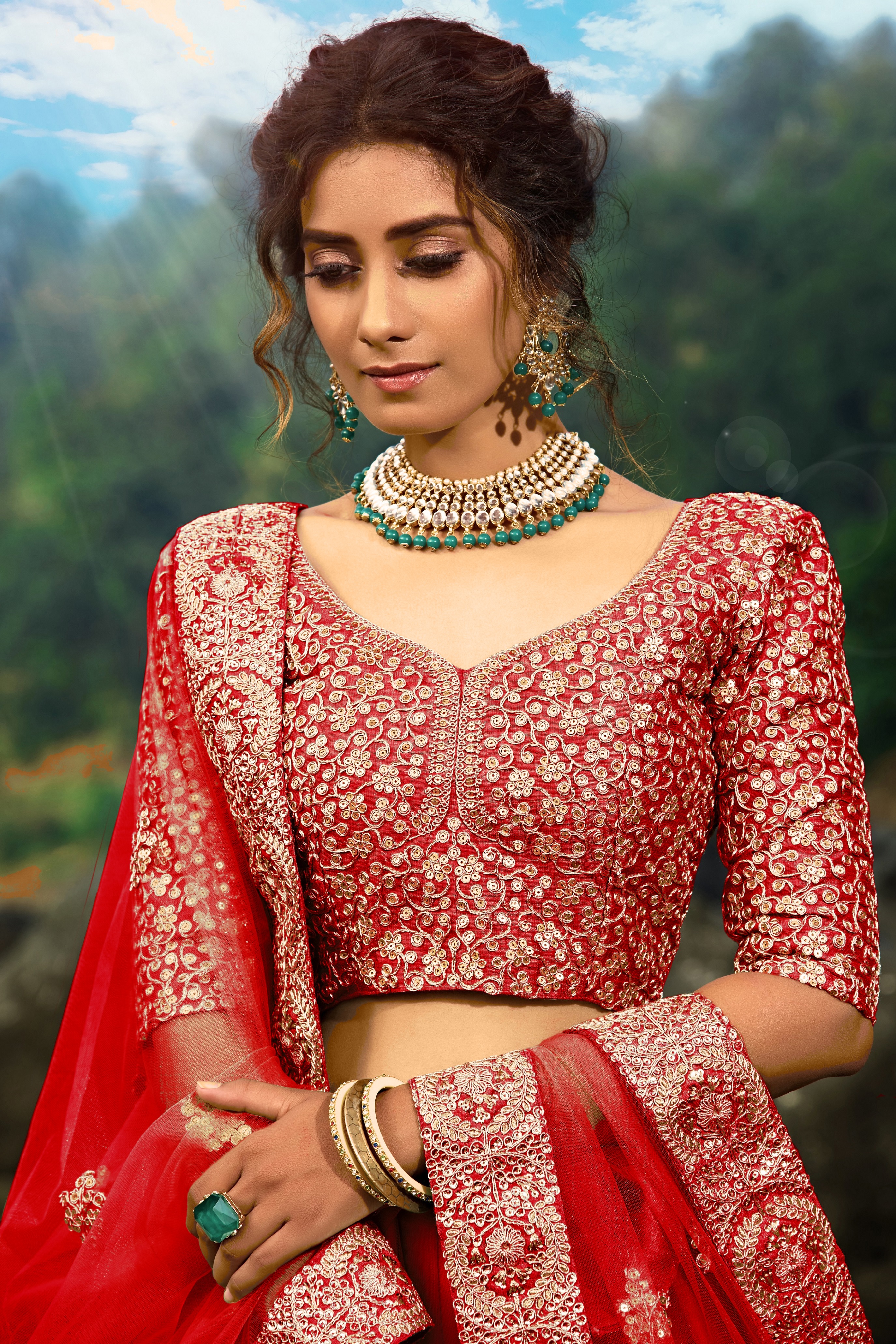 Womens Red Net Sequience Work Lehenga Set
