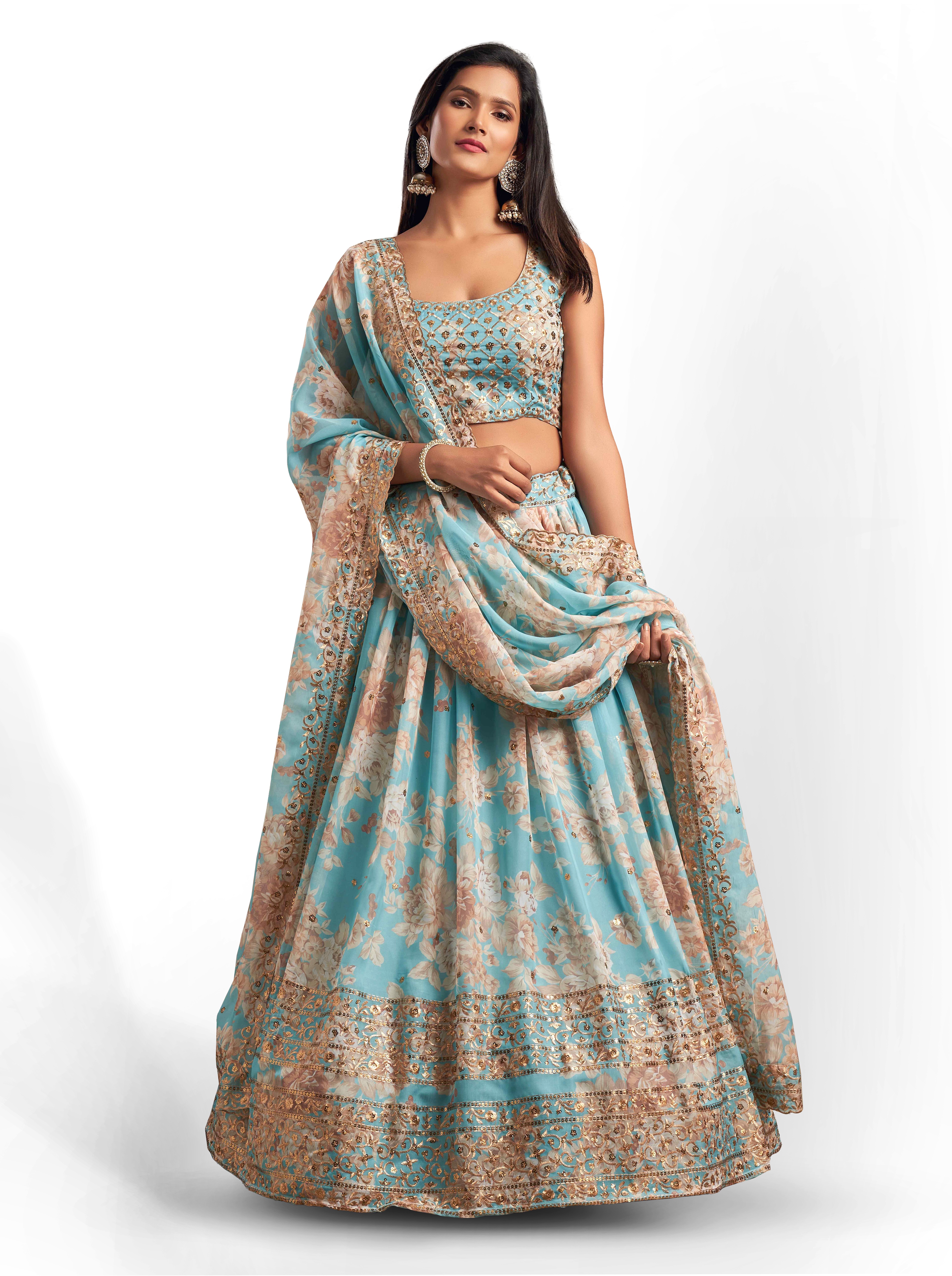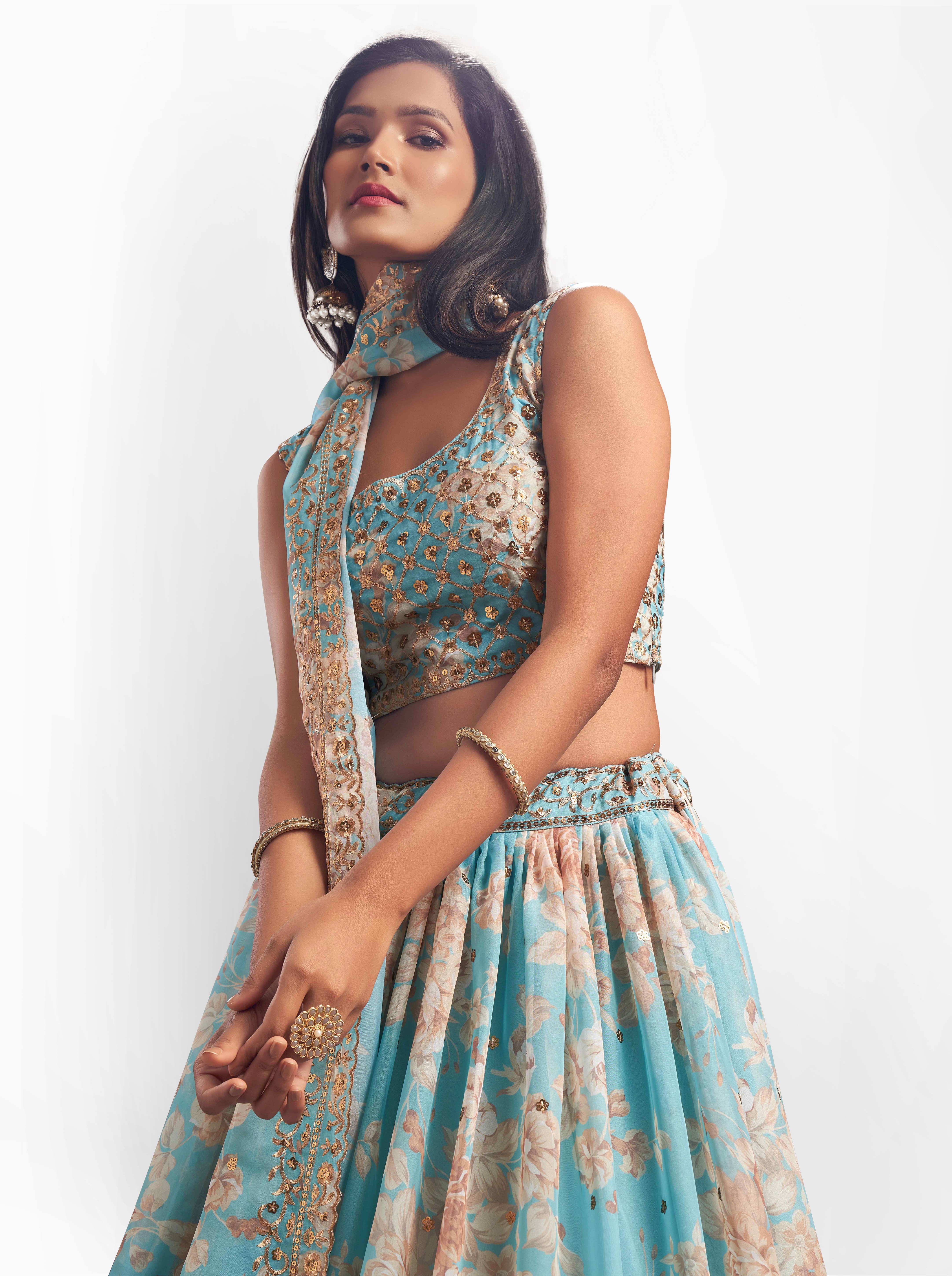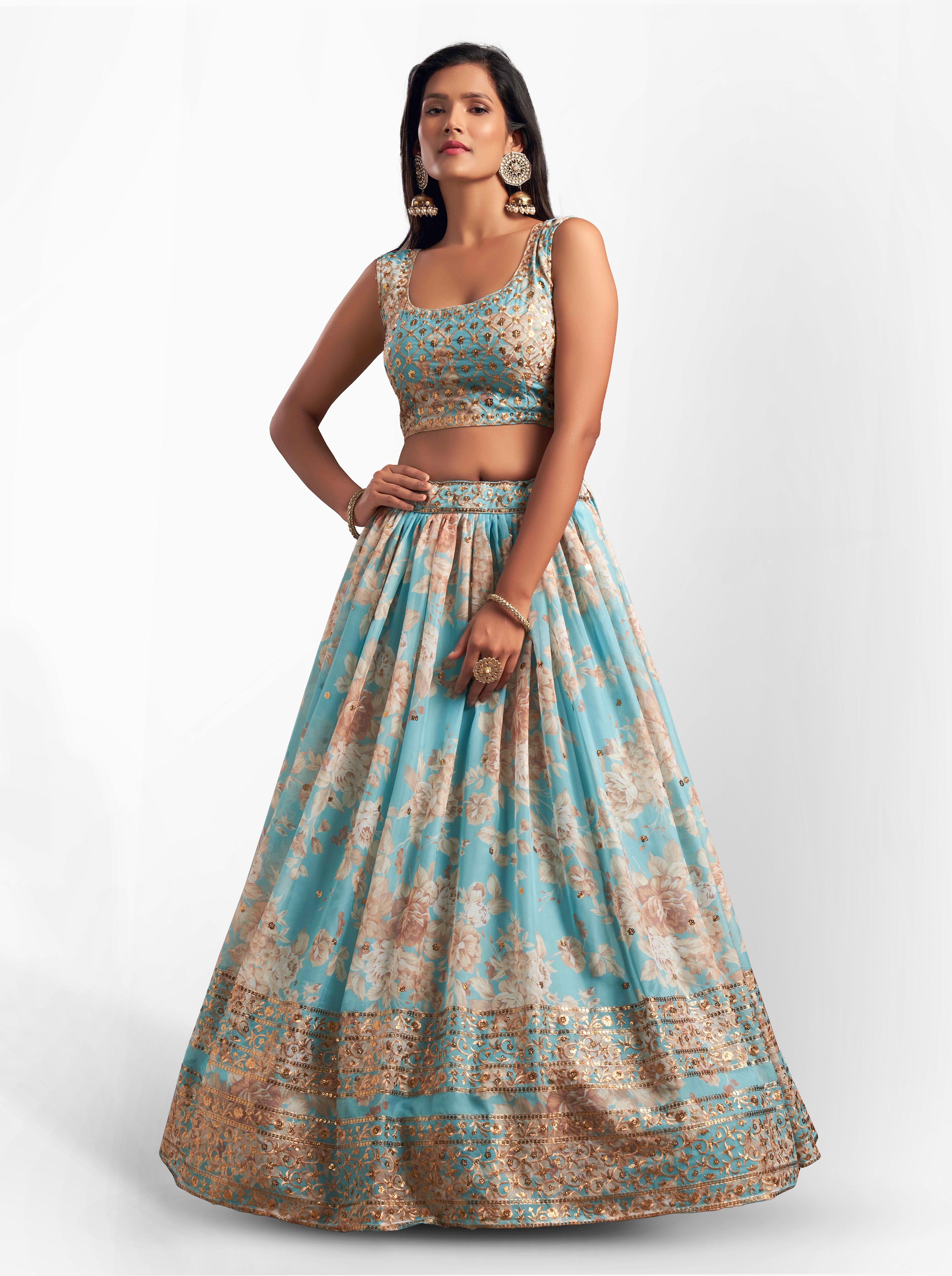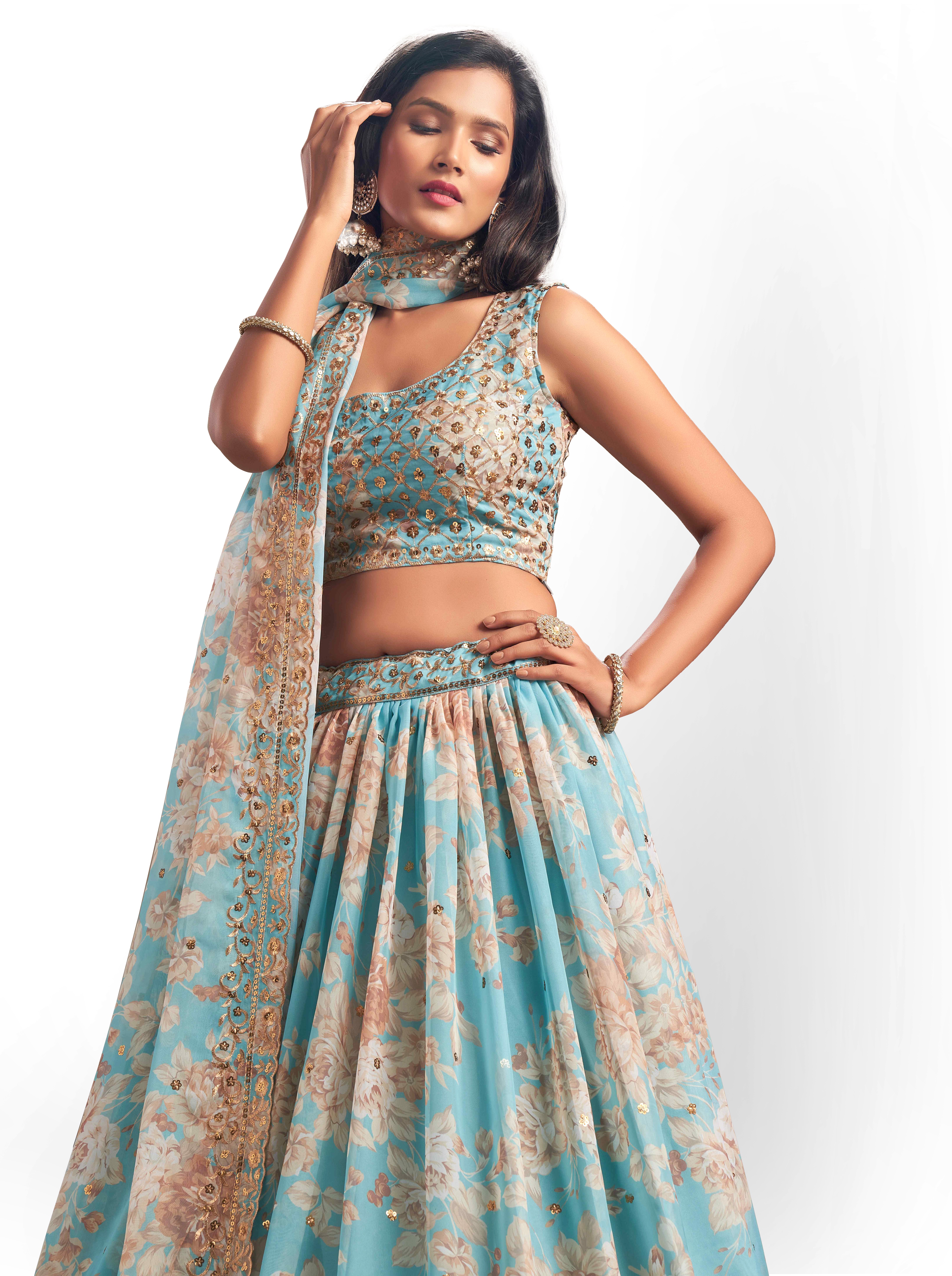 Womens Sky Blue Organza Sequence Work,Floral Work Embroidery Lehenga Set