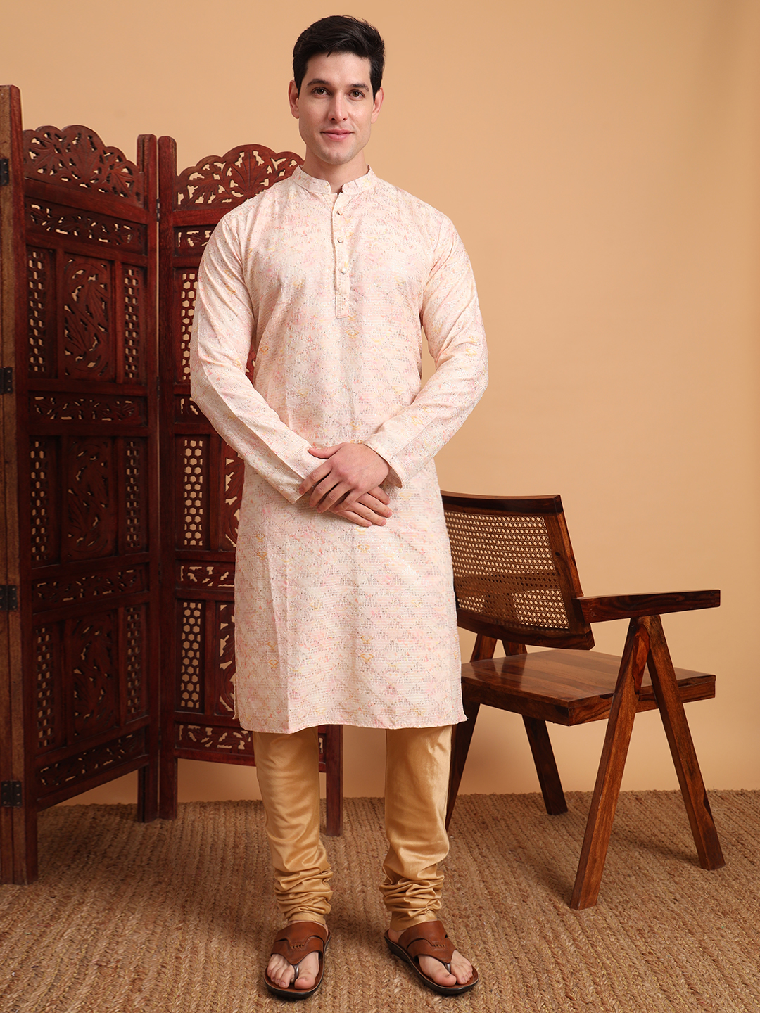 Beautiful Peach Color Smart Printed Men's Festive Wear Kurta