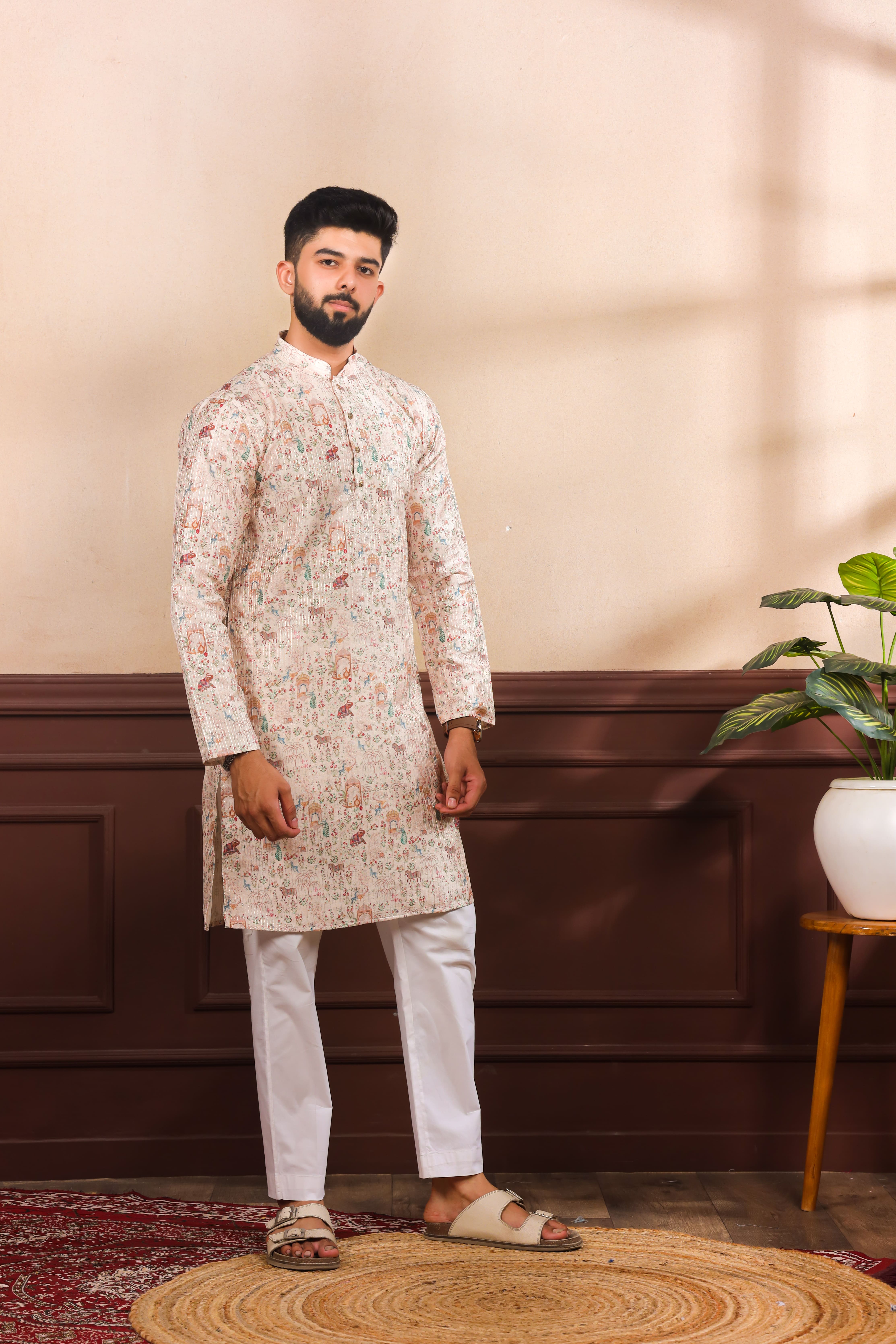 Beige Color Beautiful Art Silk Fabric Smart Print Designer Kurta Payjama
