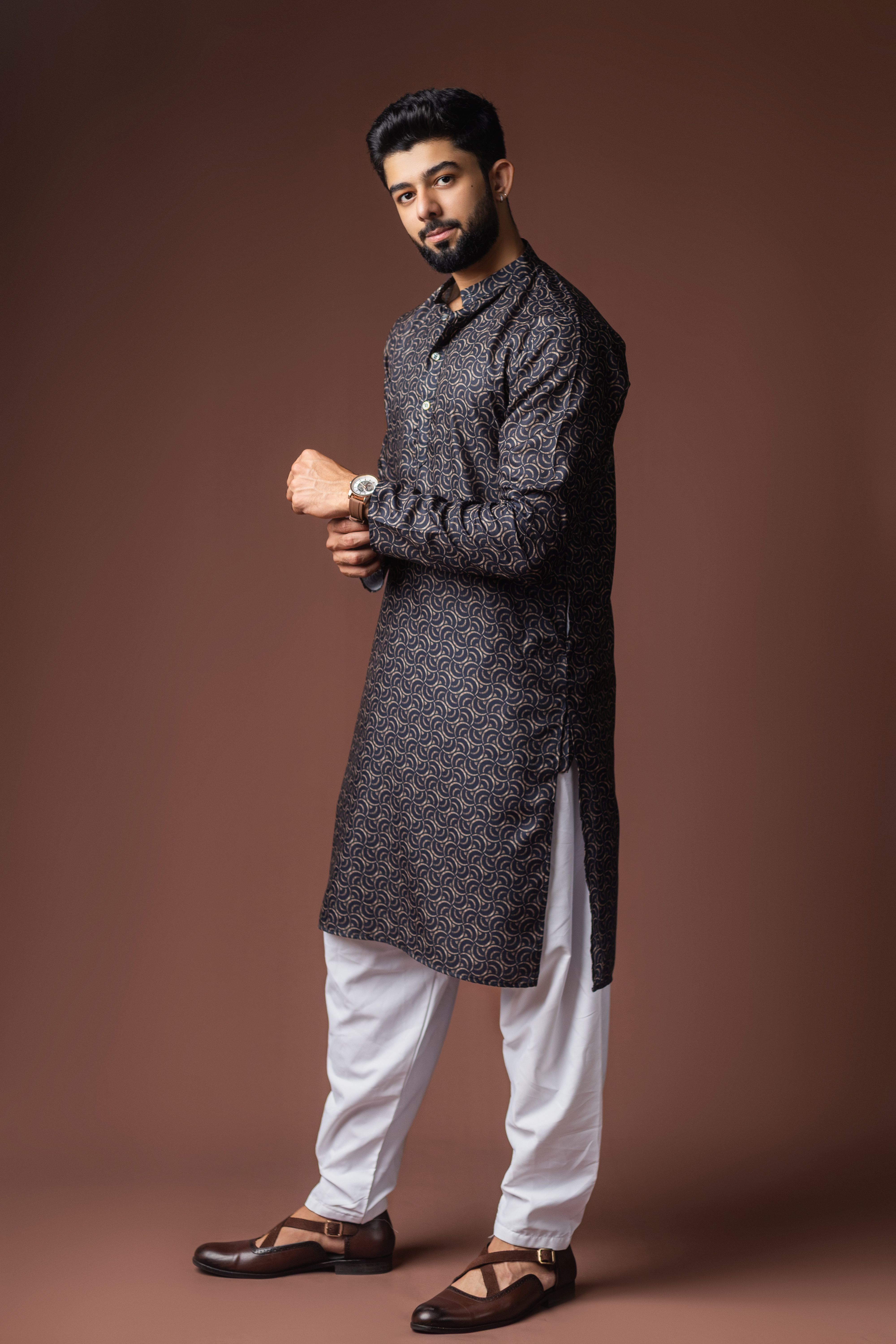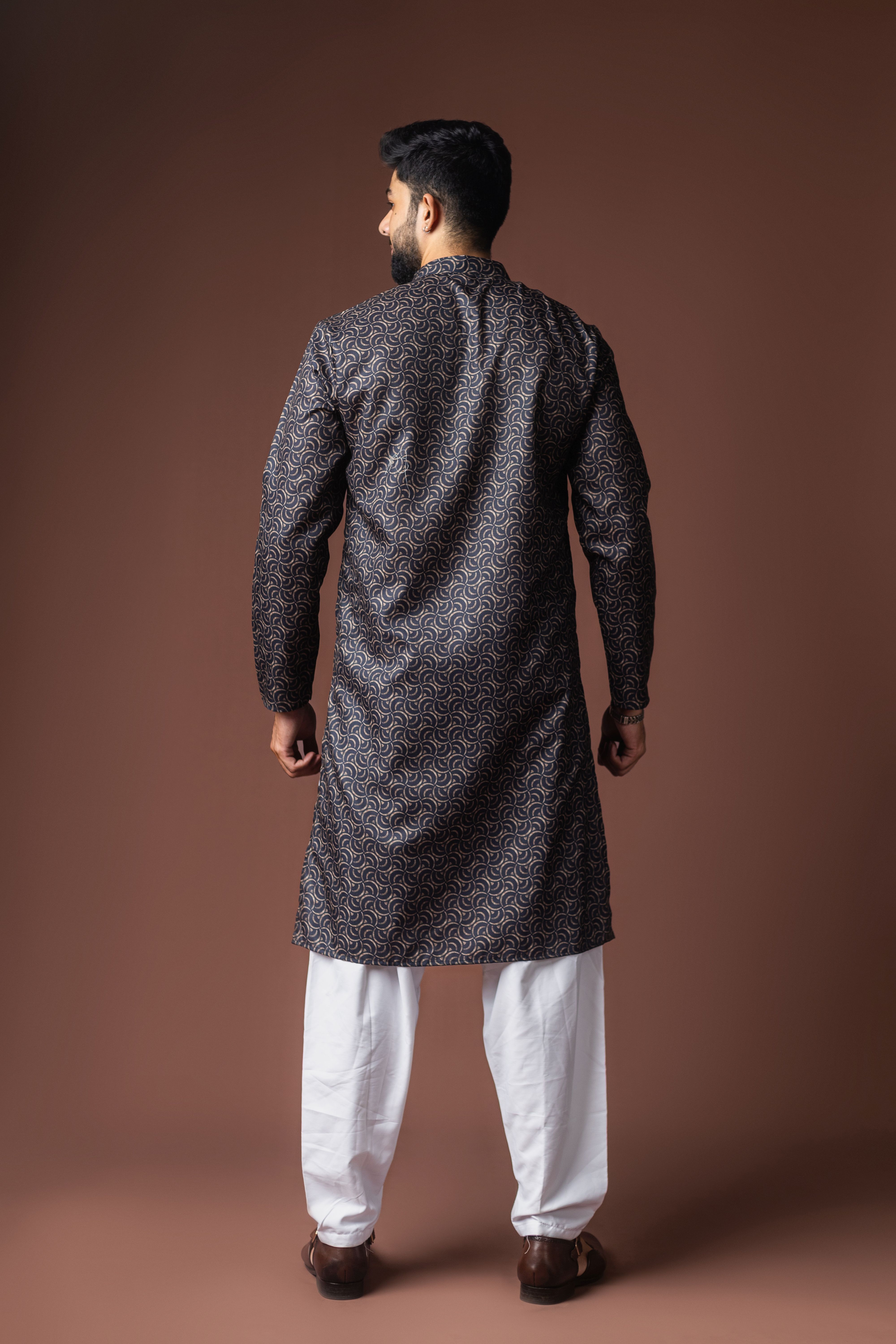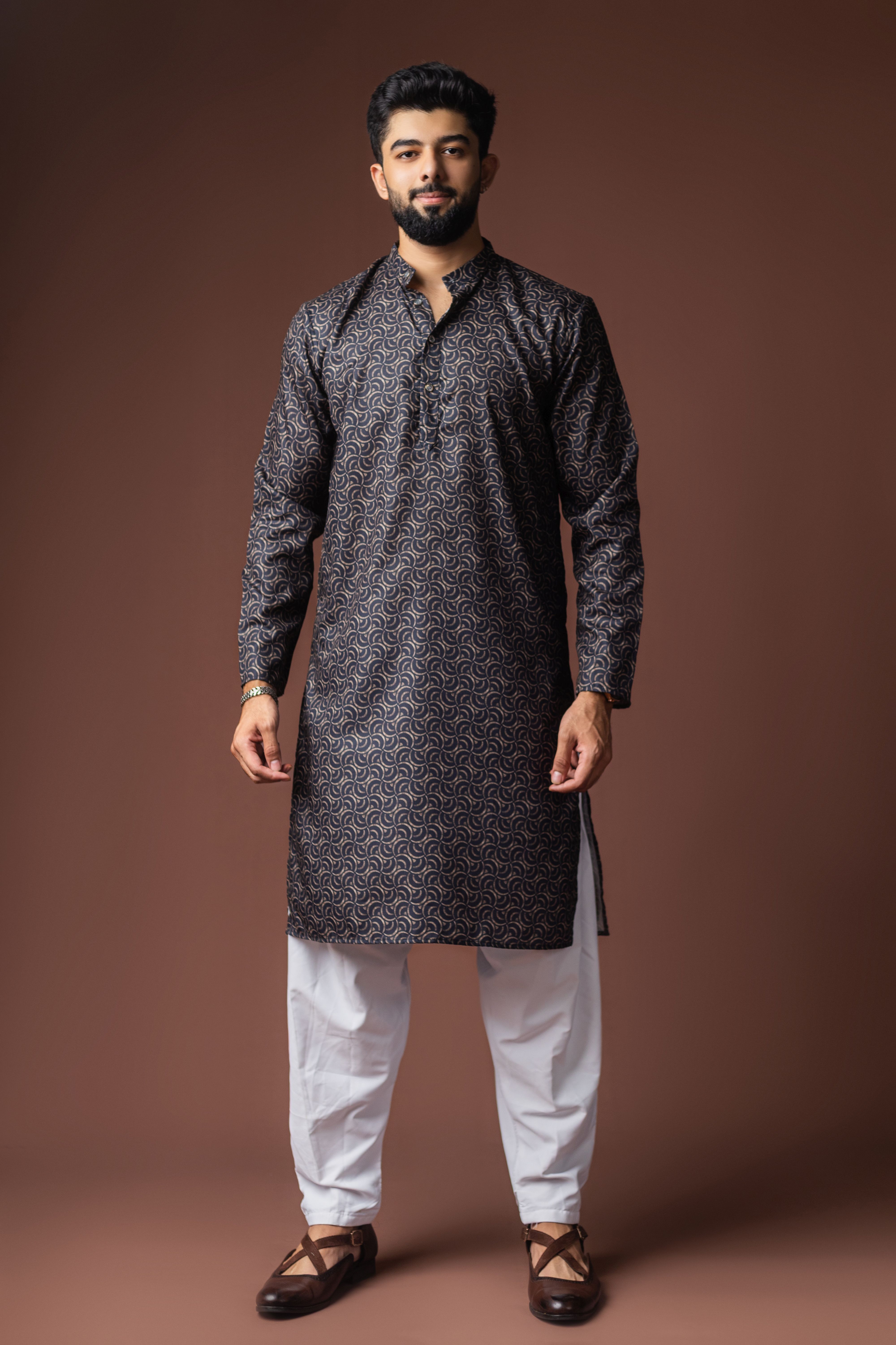 Black Color Blended Linen Fabric Designer Printed Festive Wear Men's Kurta Payjama