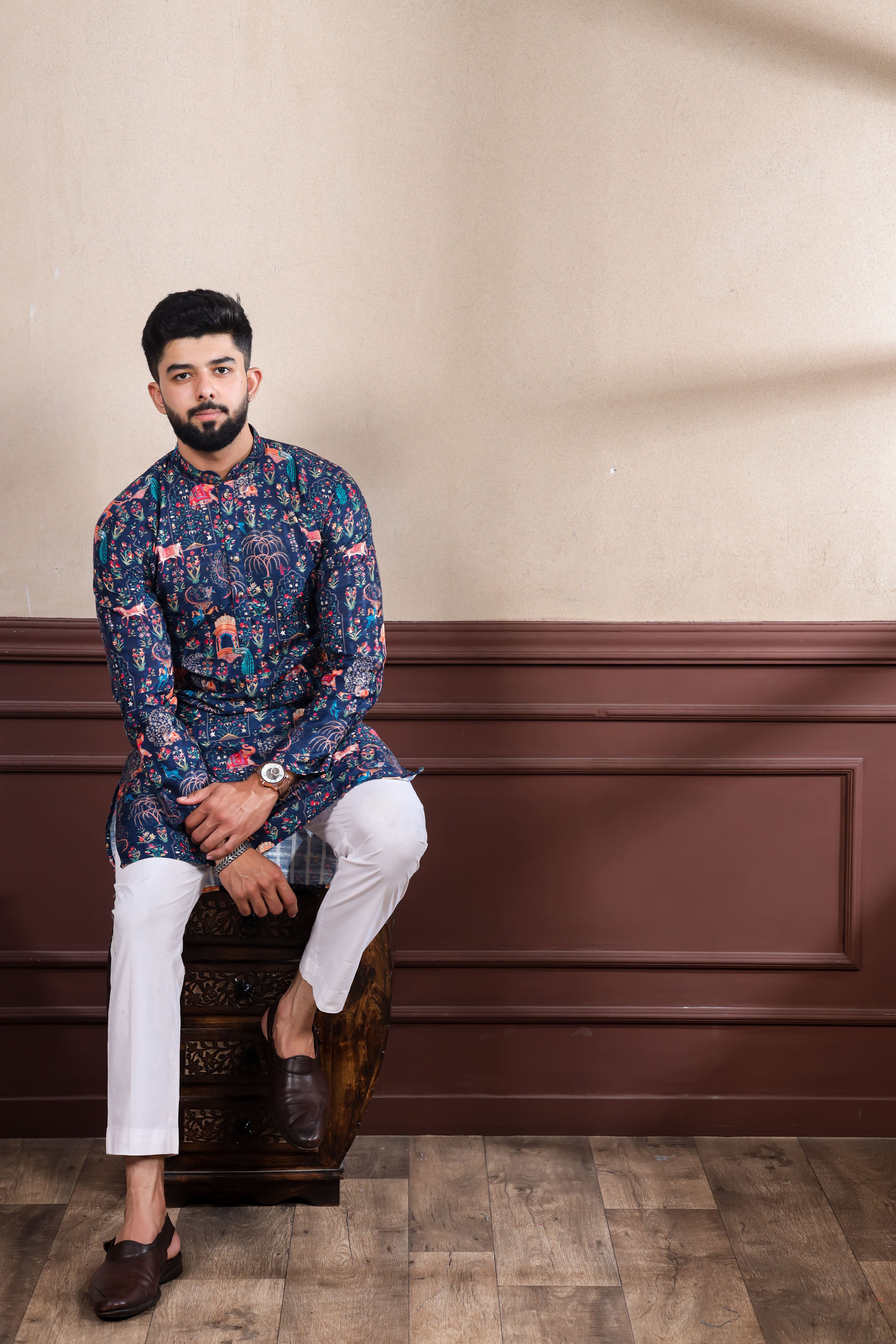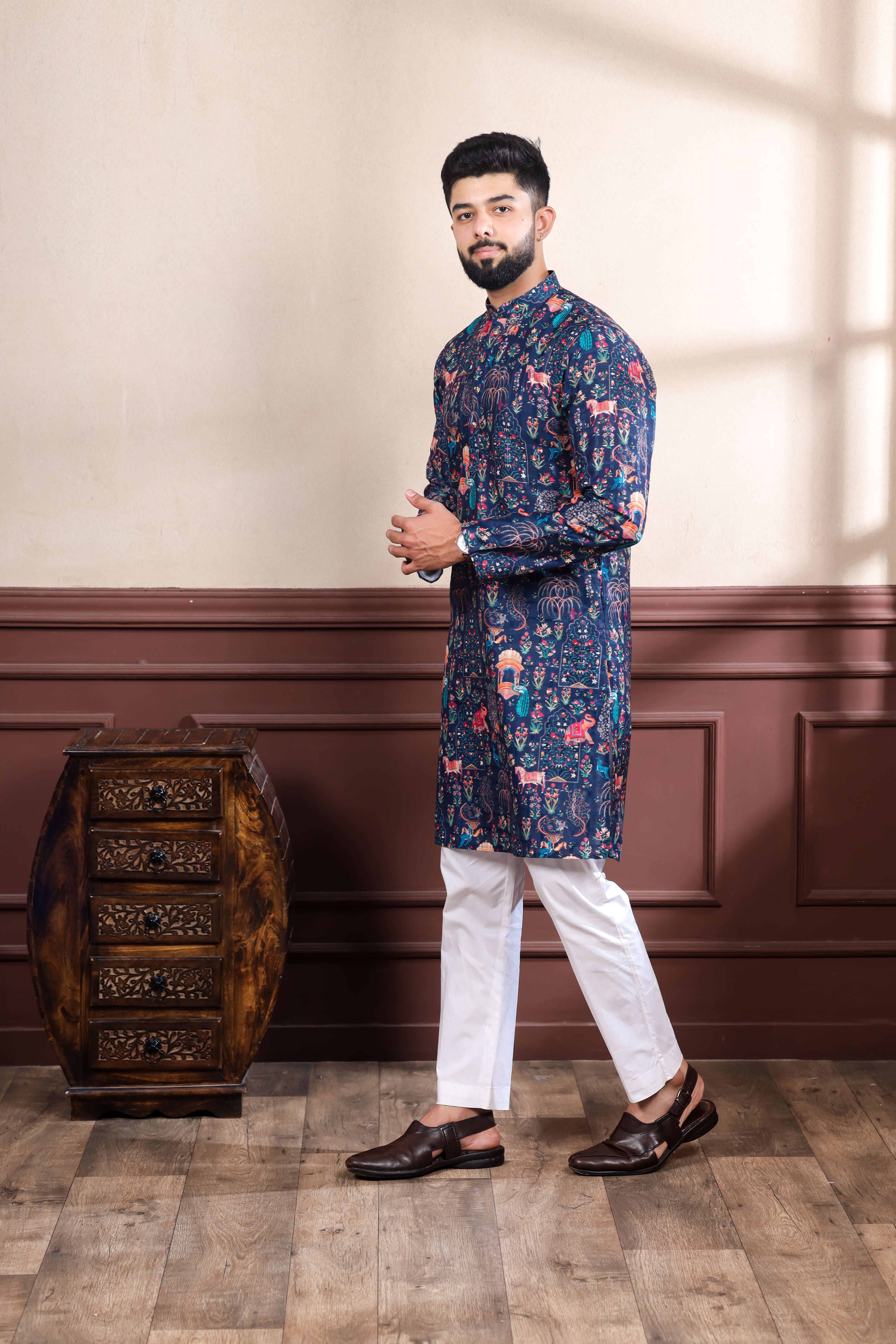 Blue Color Ethnic Woven Patta With Digital Printed Ceremonial Kurta Payjama For Men's