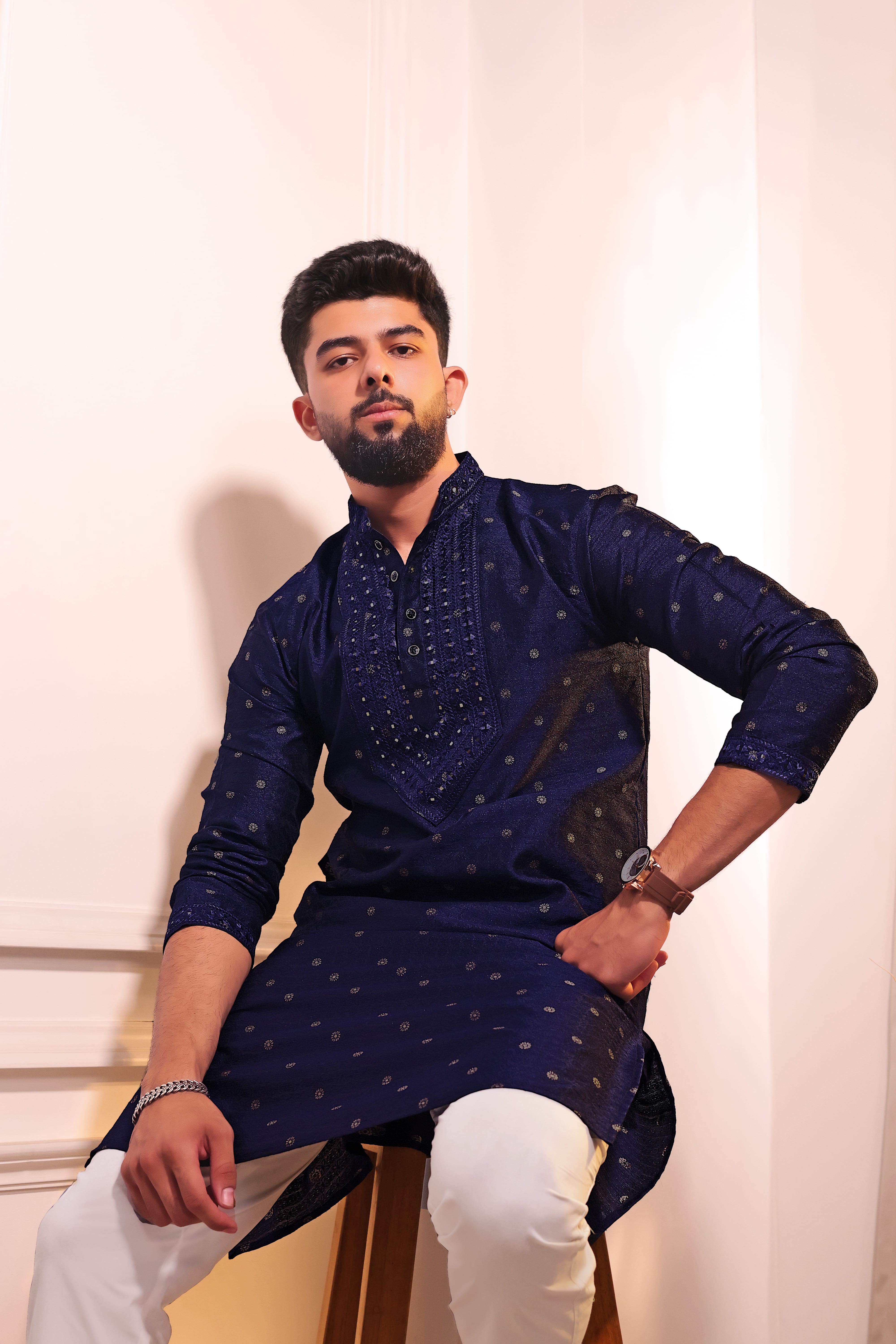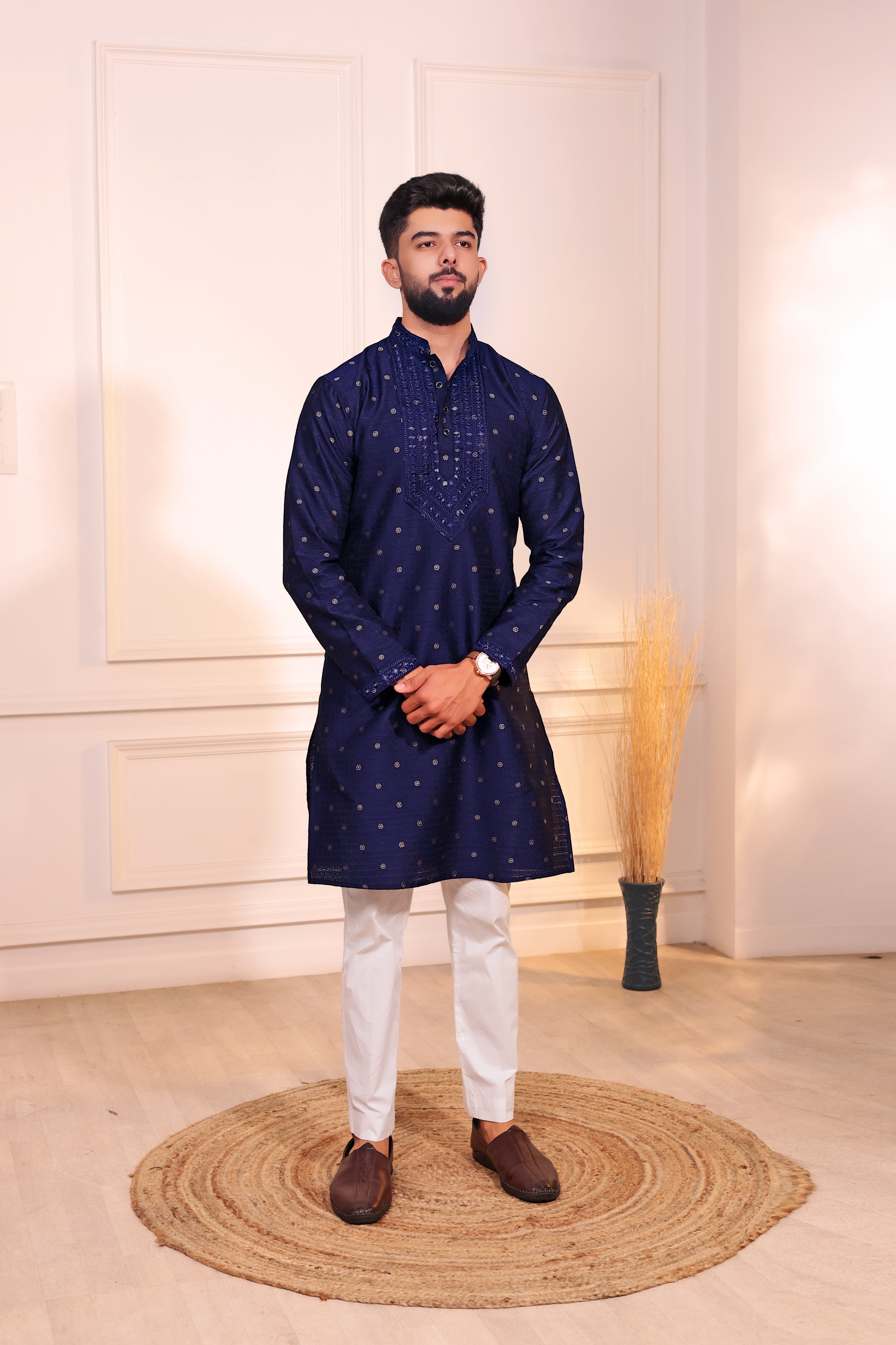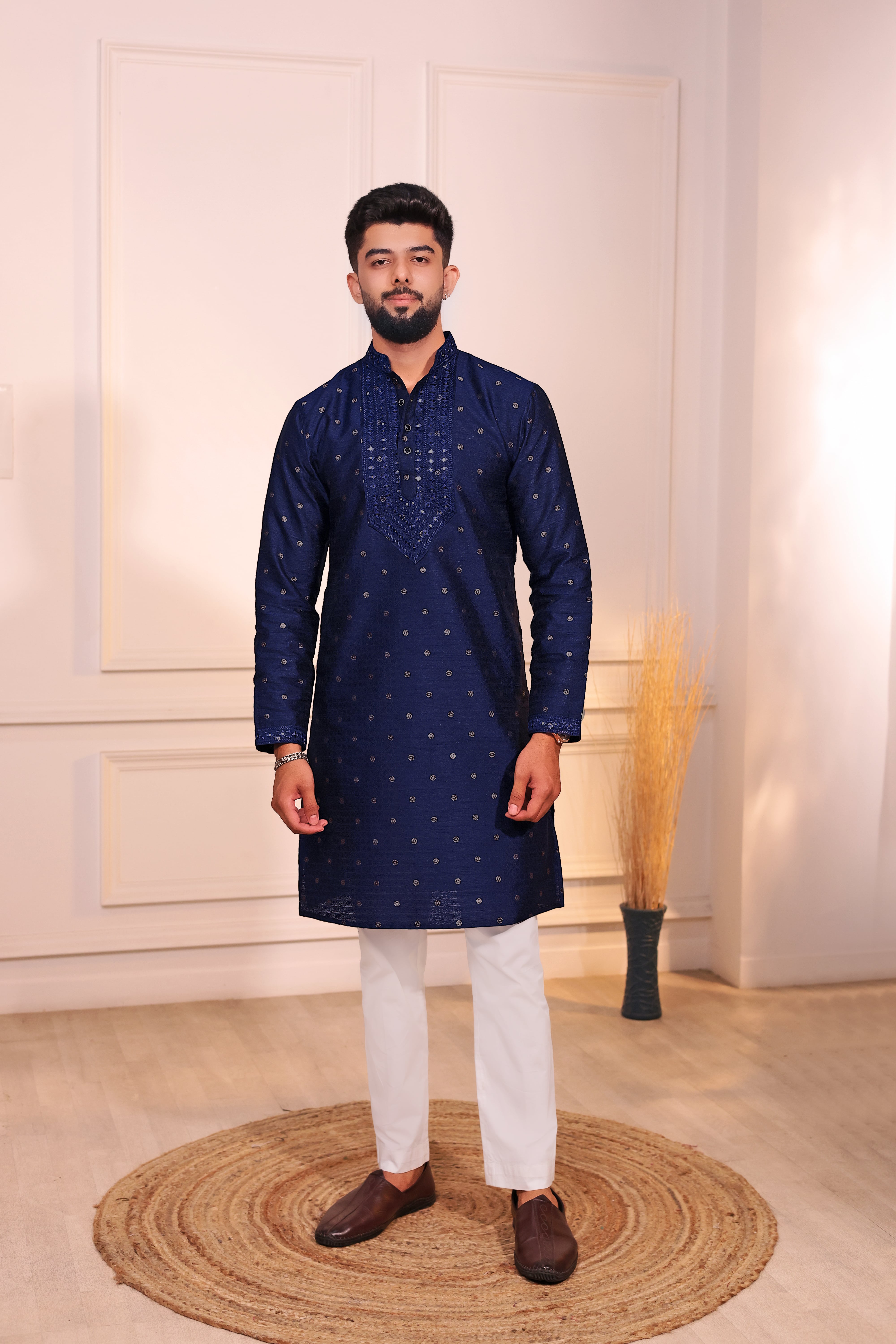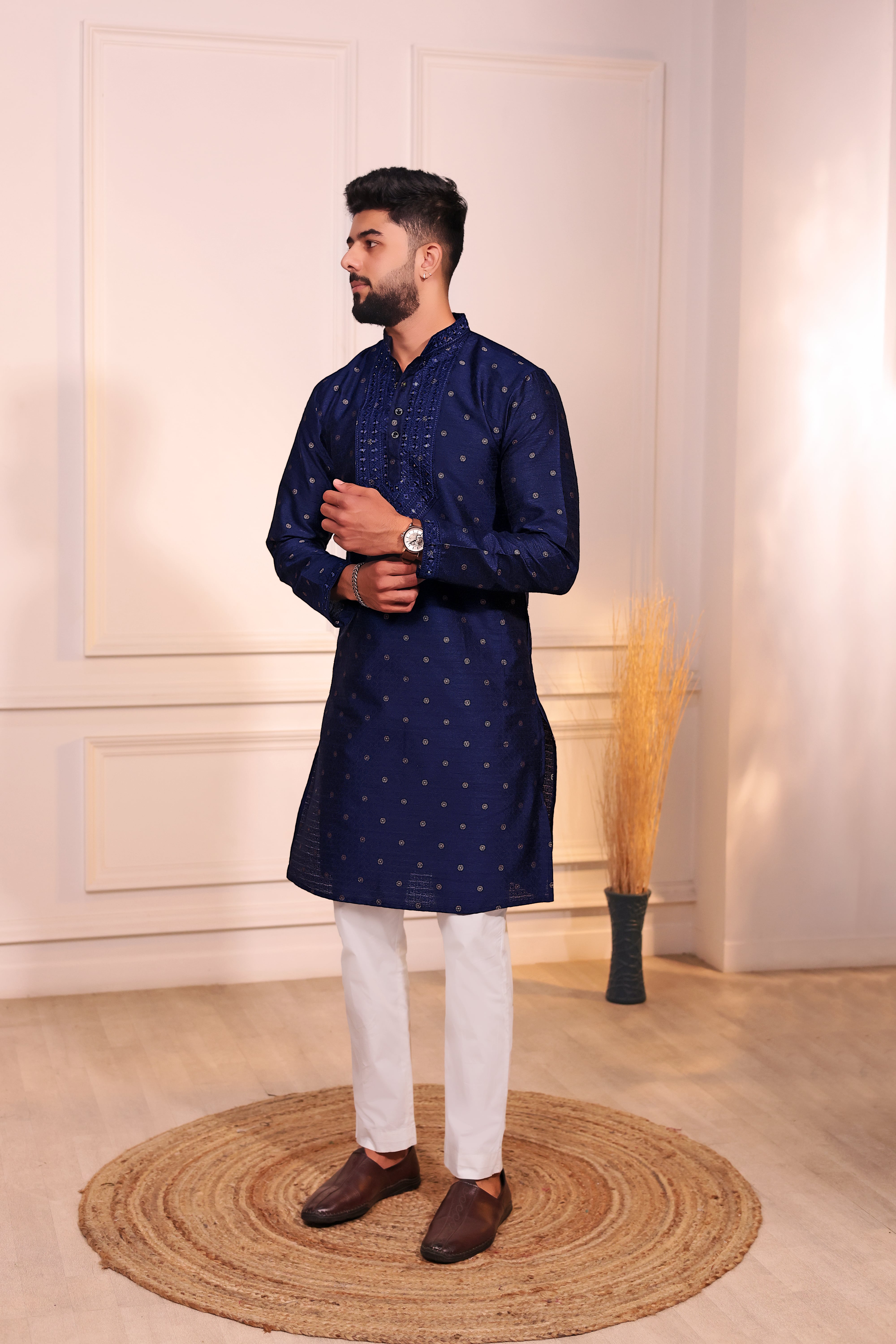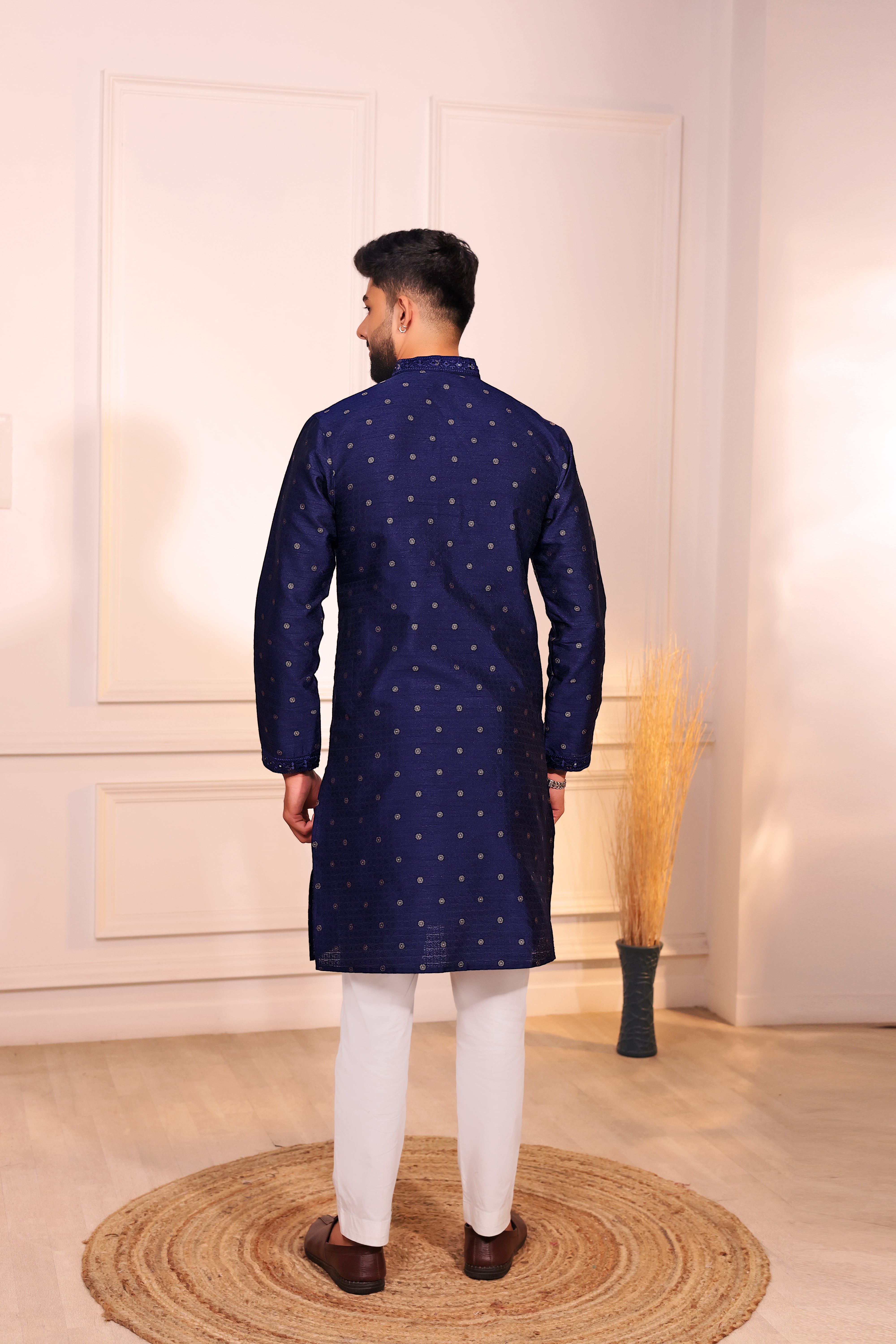 Blue Color Jacquard Silk Fabric Designer Embroidered Kurta Payjama For Men's