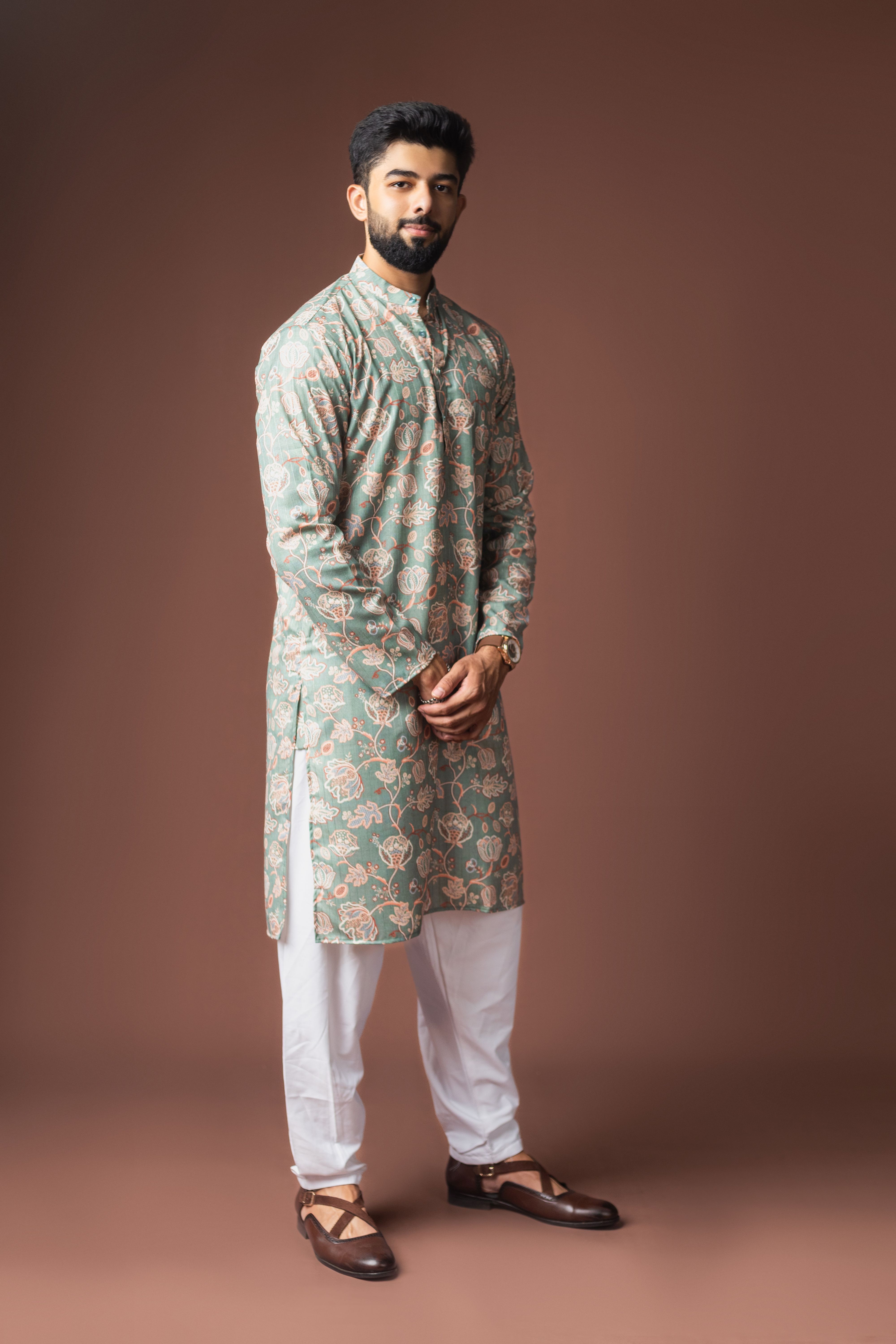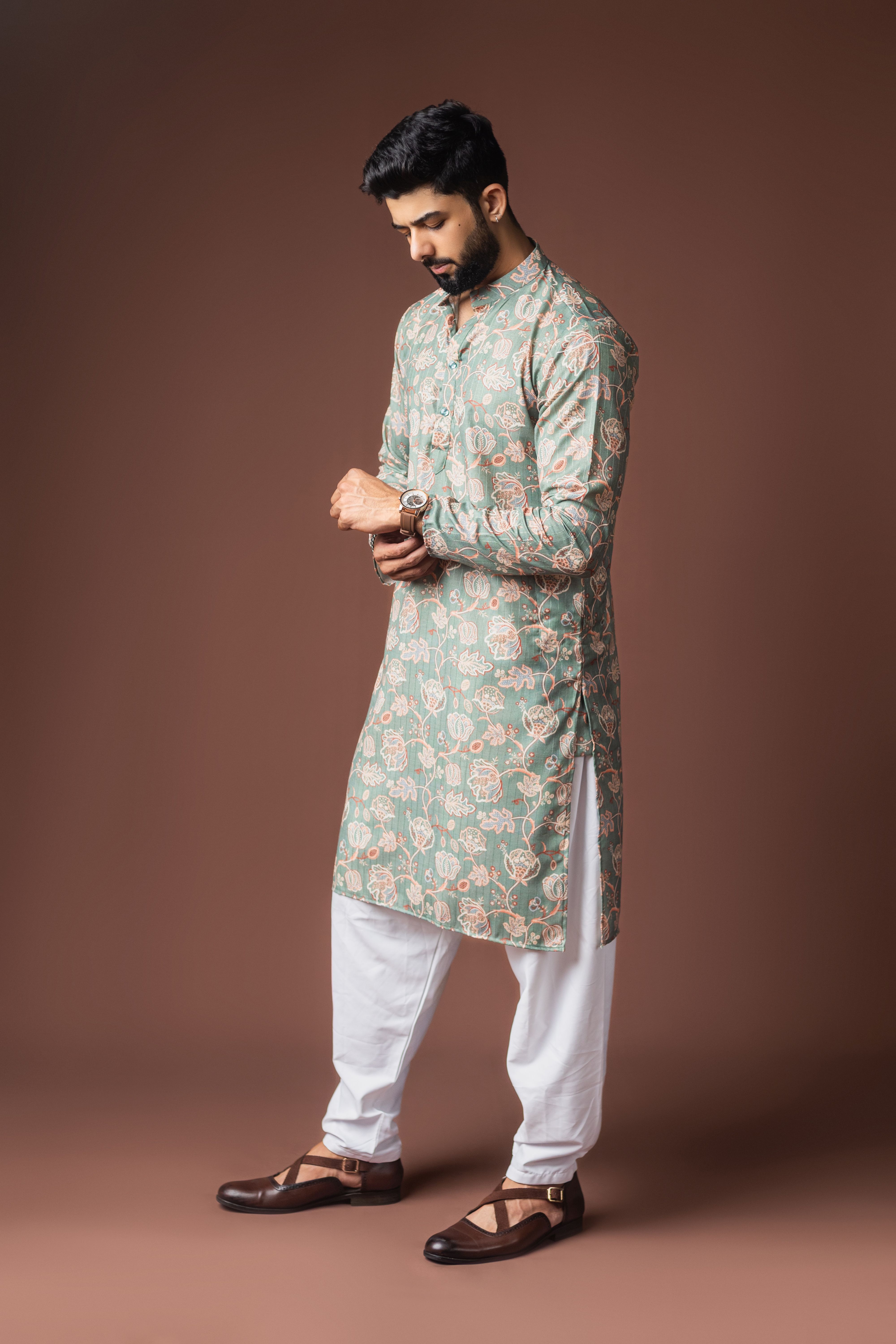 Greenish Blue Color Blended Linen Fabric Designer Printed Festive Wear Men's Kurta Payjama