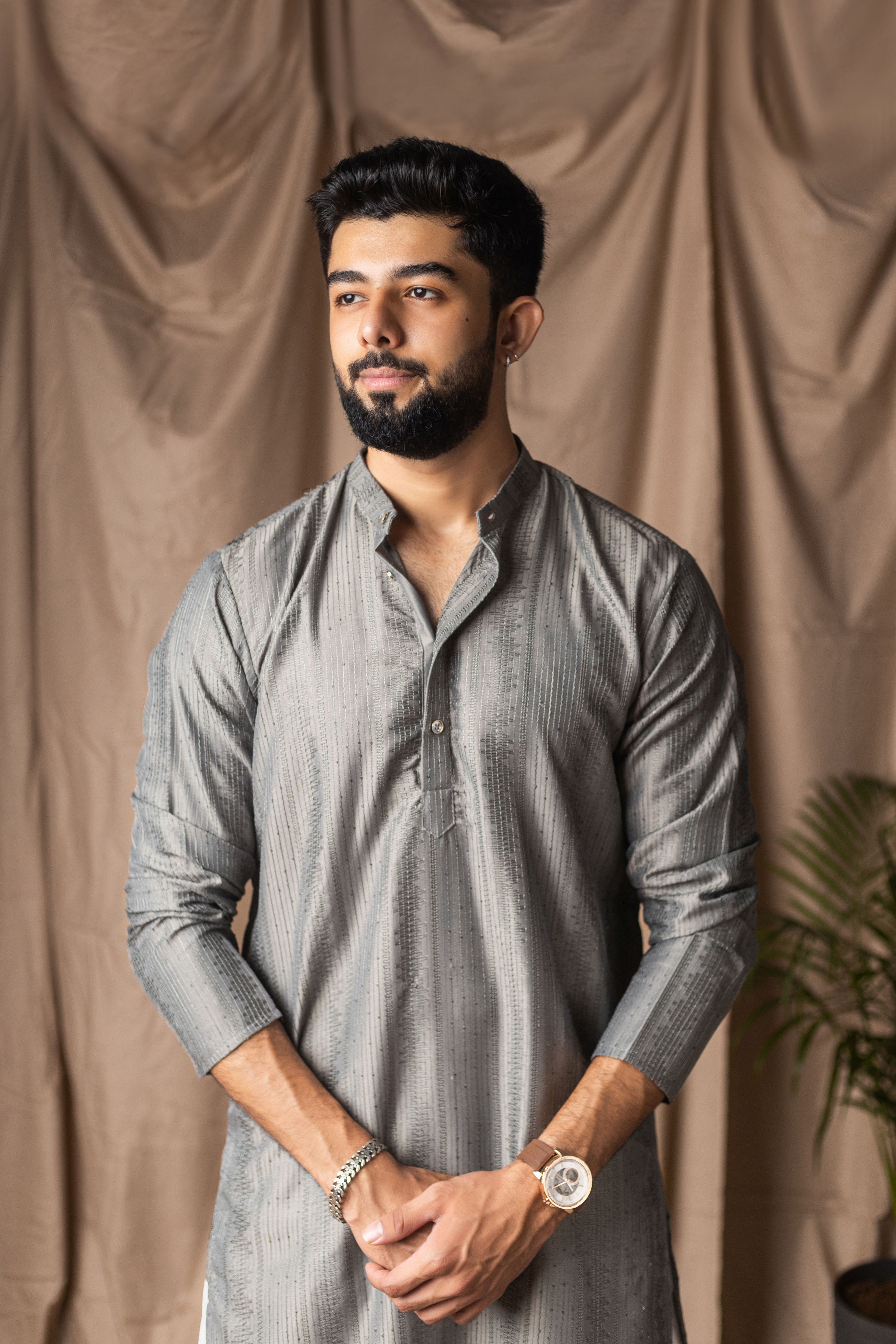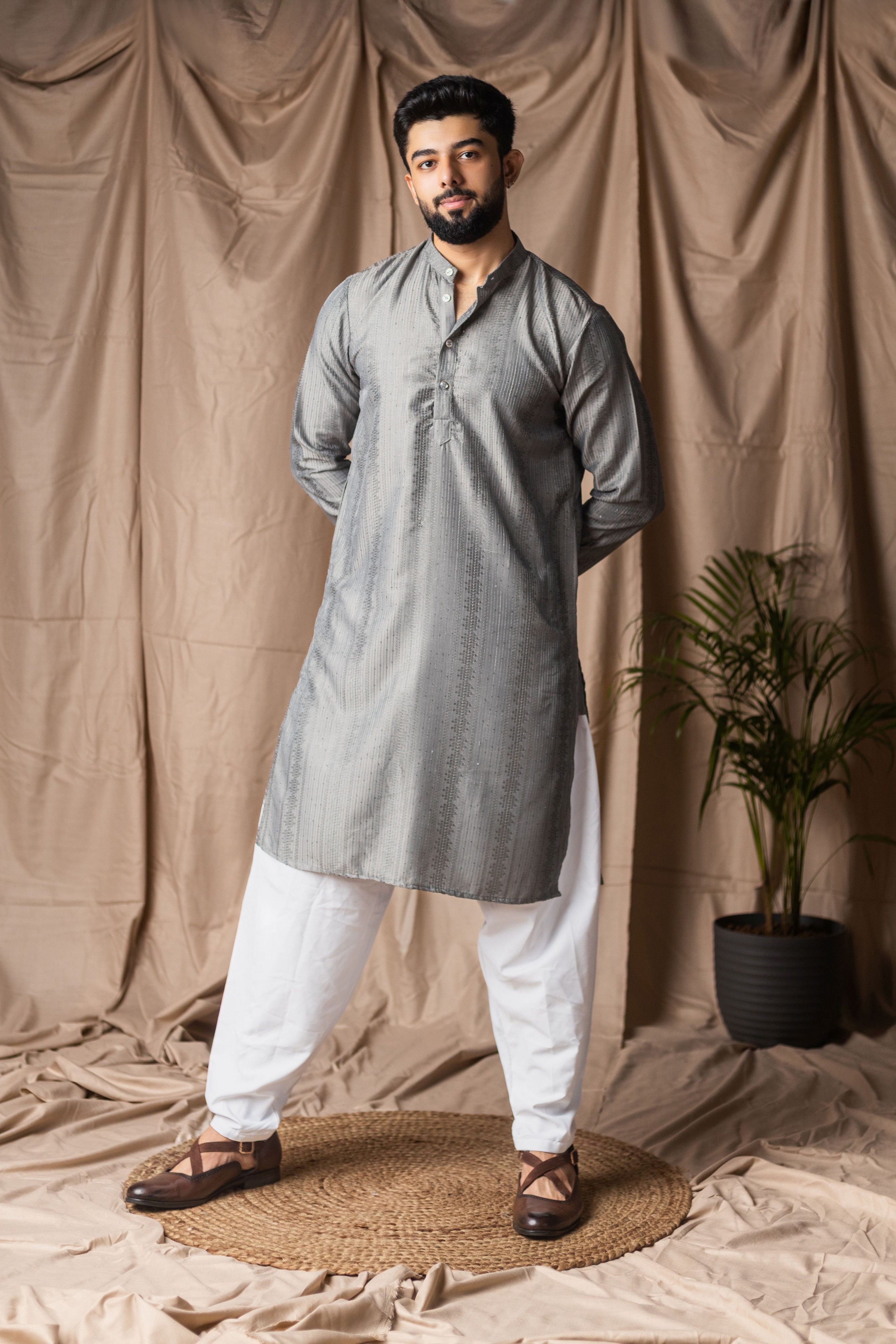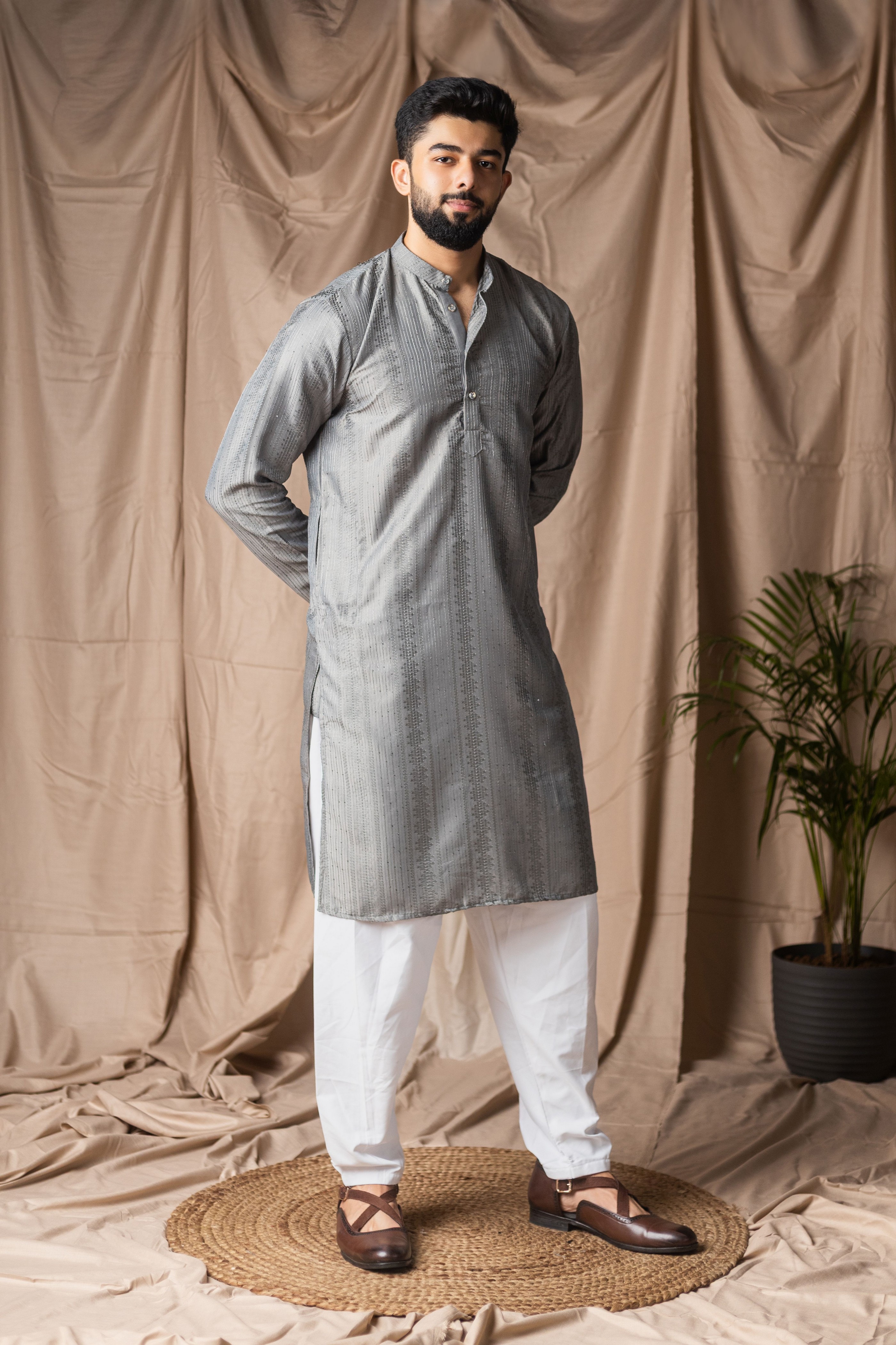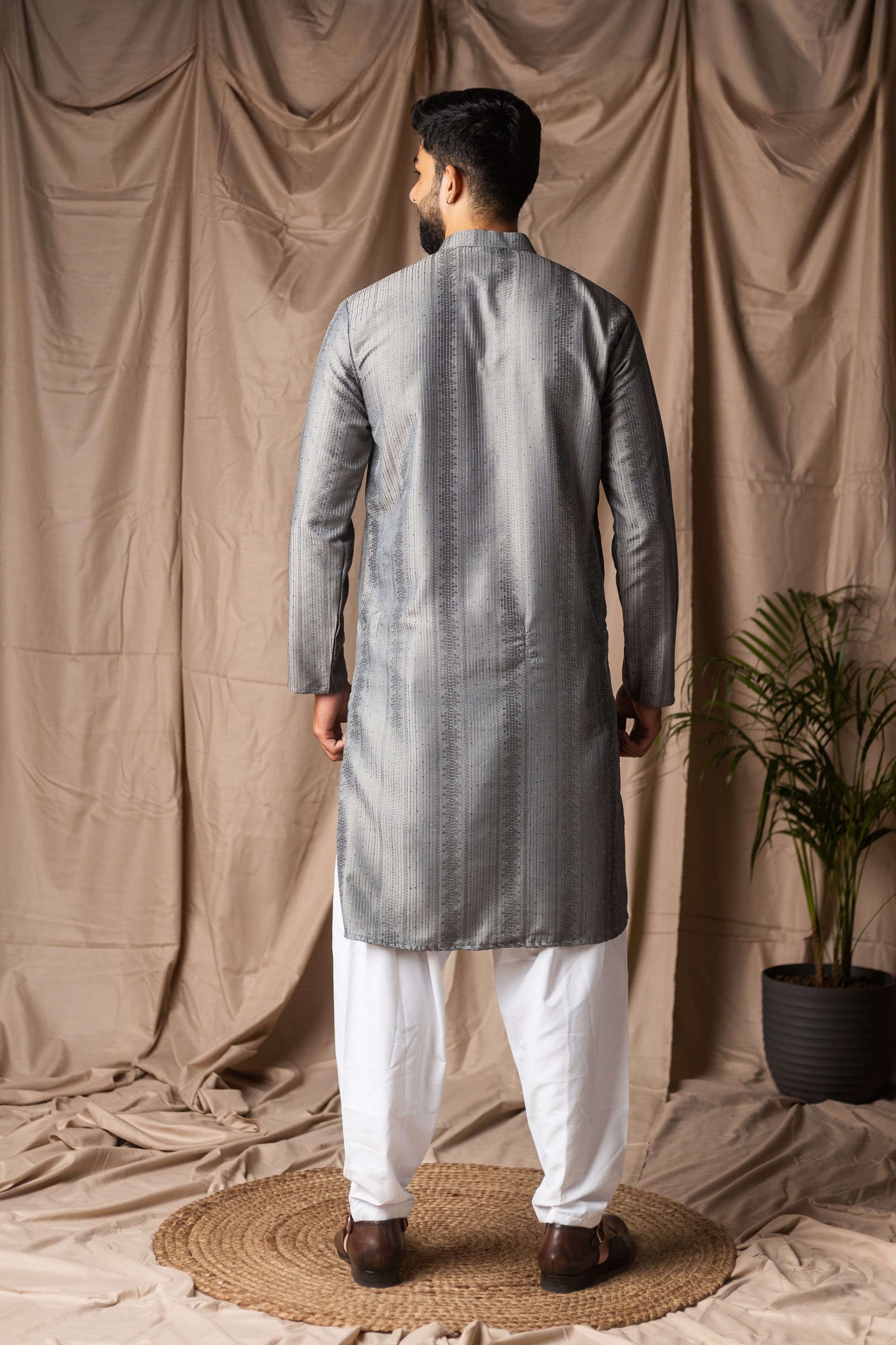 Grey Color Rayon Fabric Festive Wear Ethnic Men's Embroidered Kurta Payjama