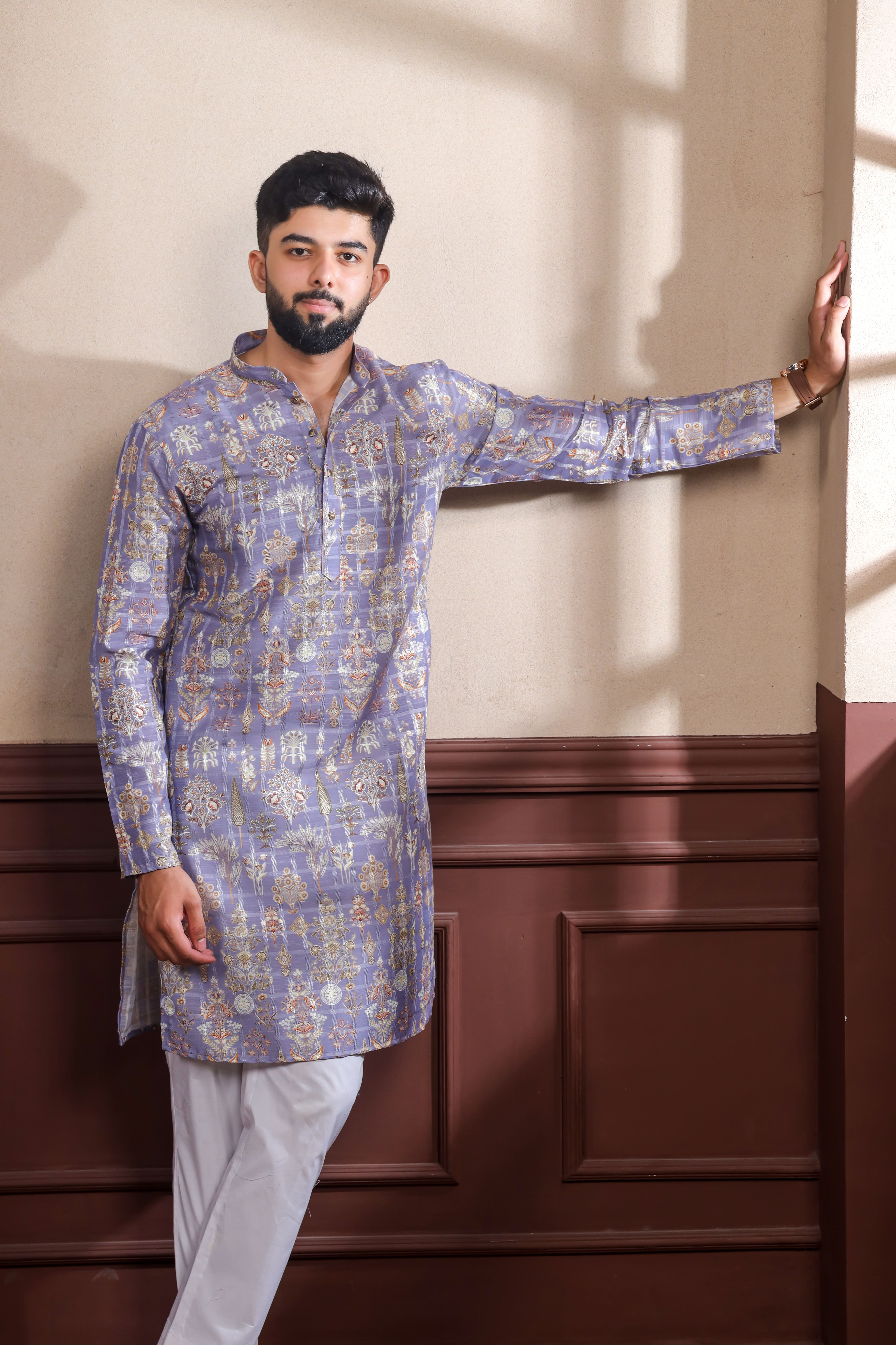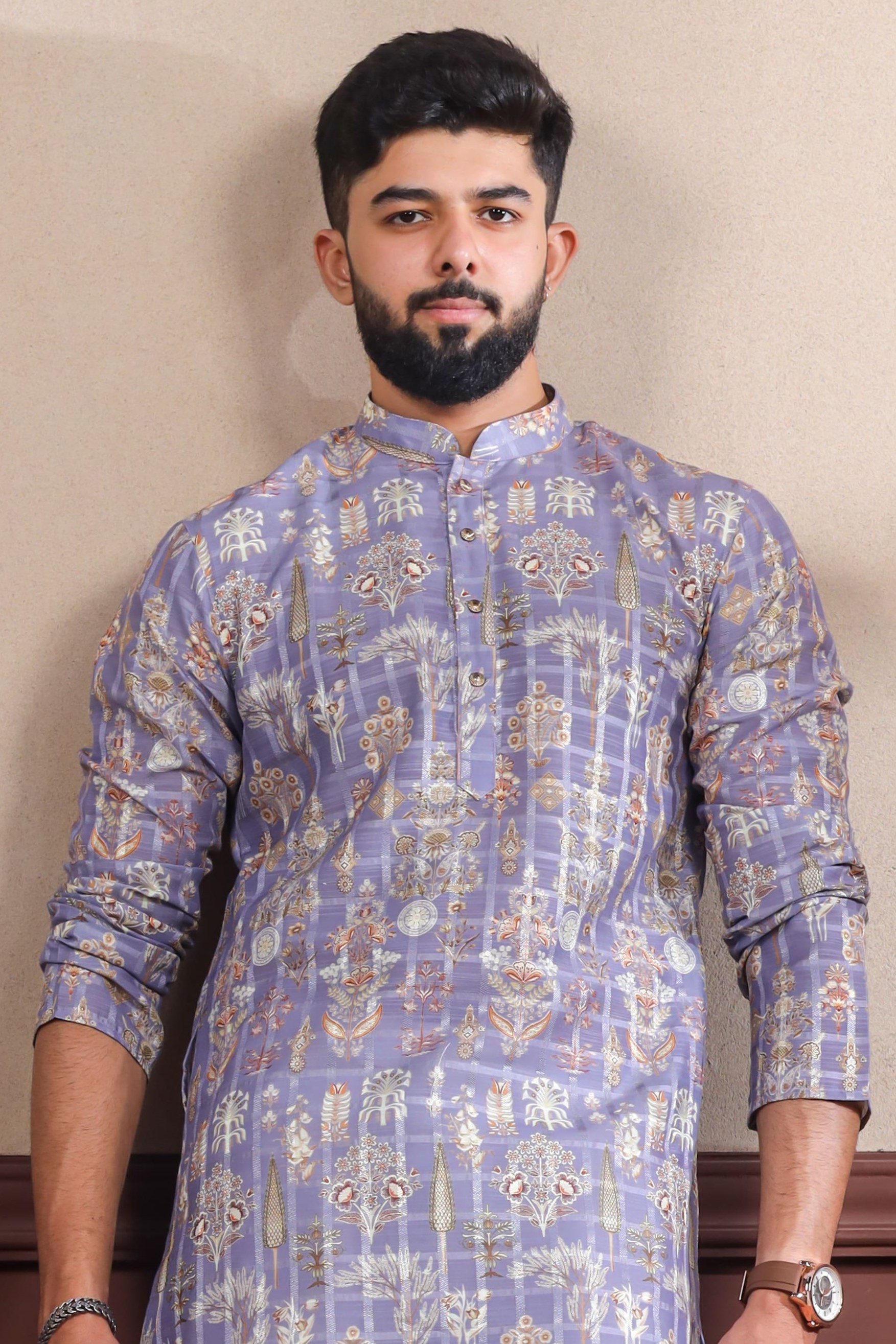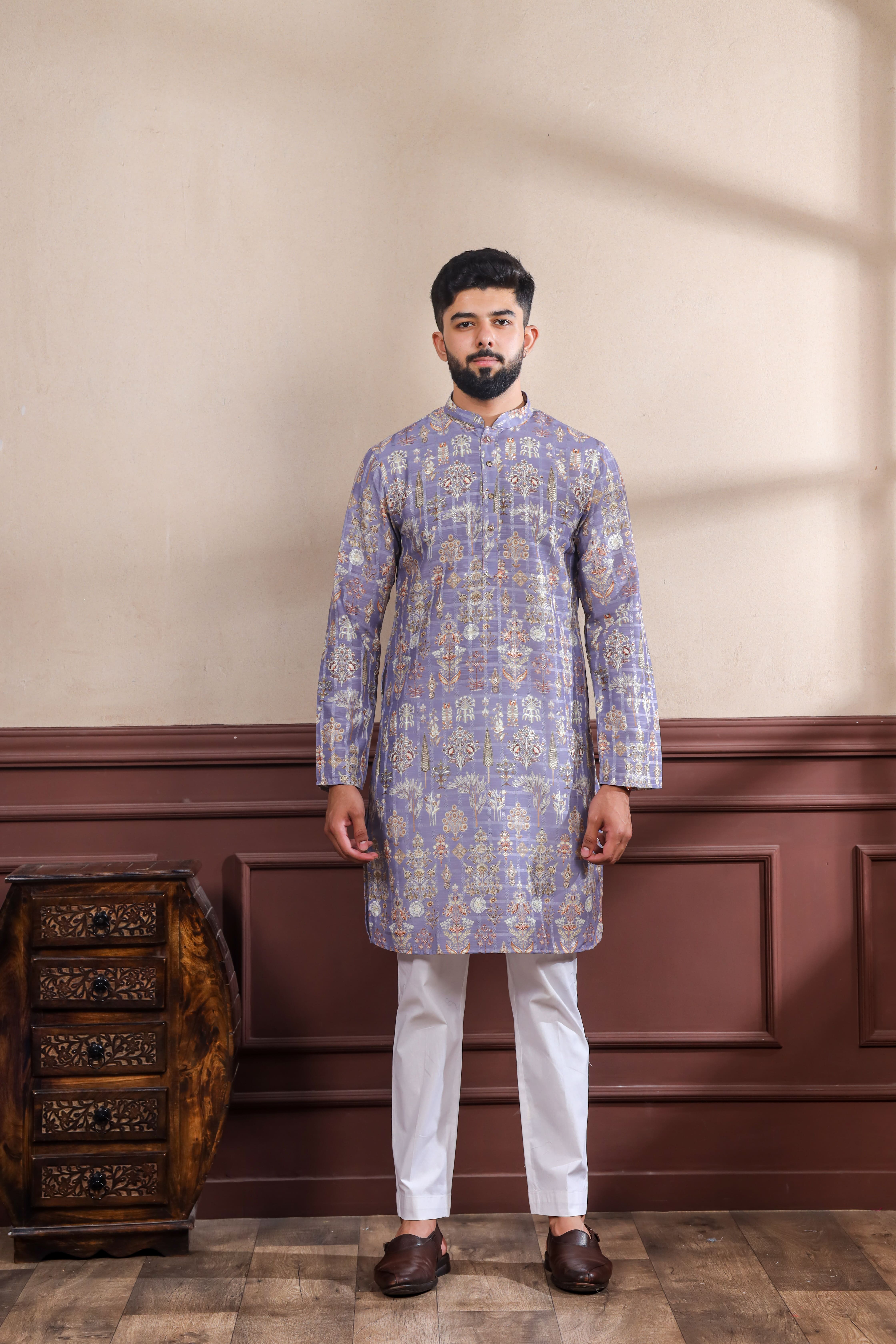 Lavender Color Ethnic Woven Patta With Digital Printed Ceremonial Kurta Payjama For Men's