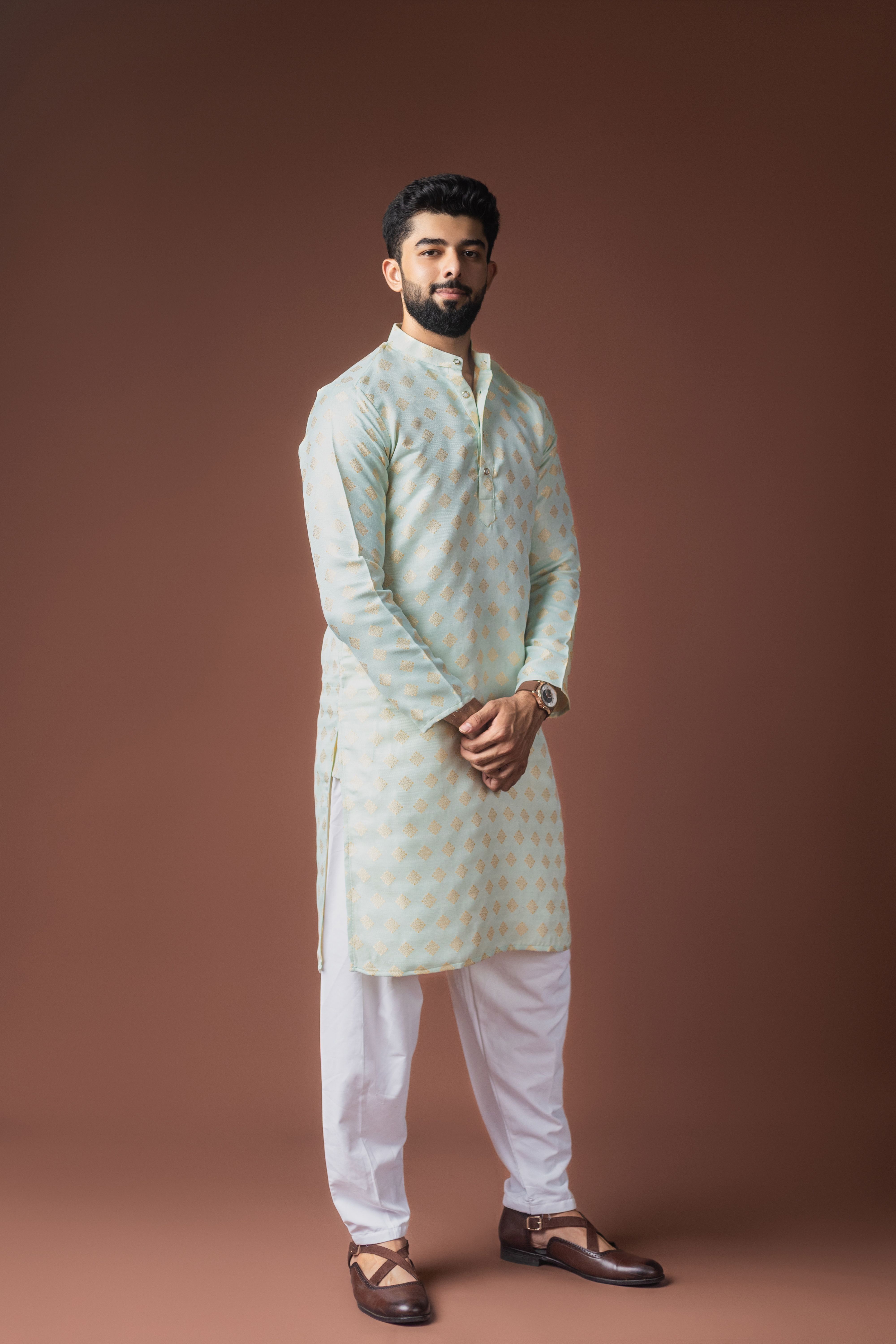 Light Green Color Jacquard Designer Ethnic Men's Kurta Payjama For Festive Looks