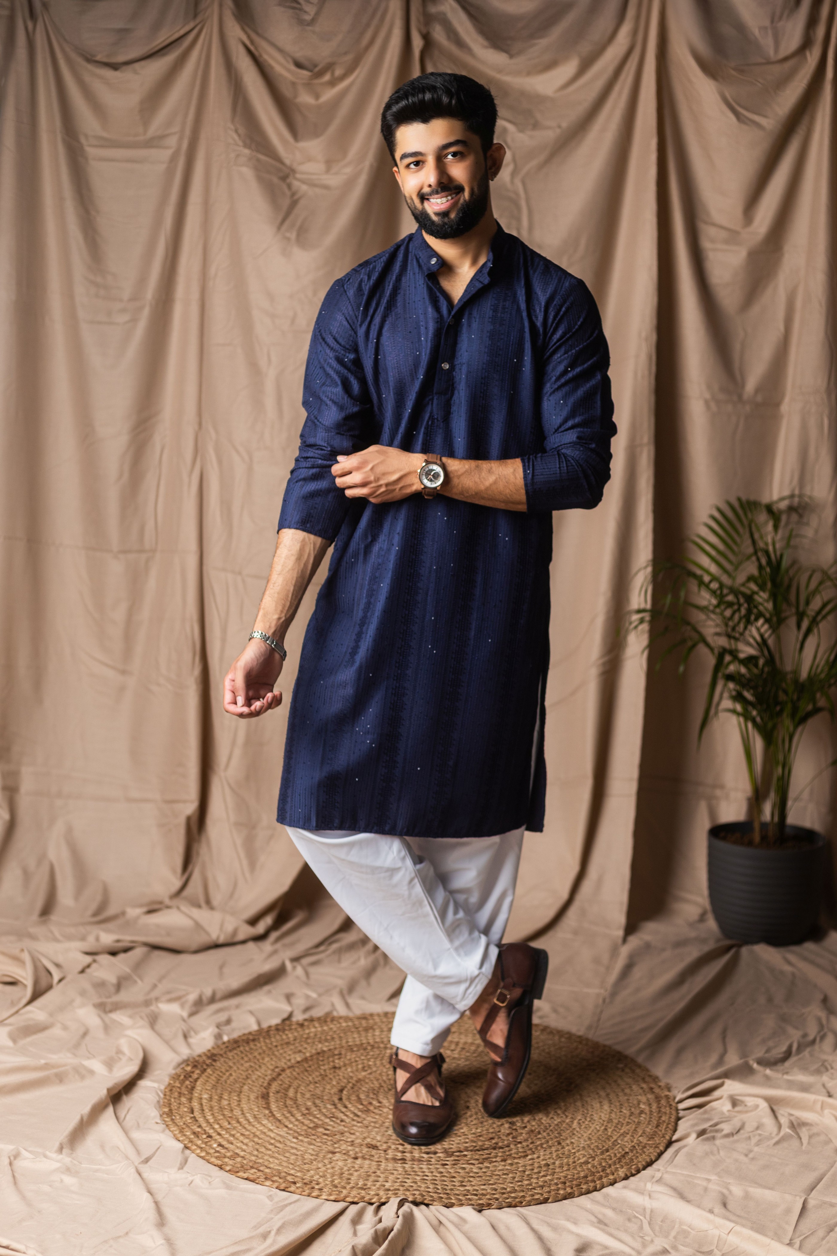 Navy Blue Color Rayon Fabric Festive Wear Ethnic Men's Embroidered Kurta Payjama
