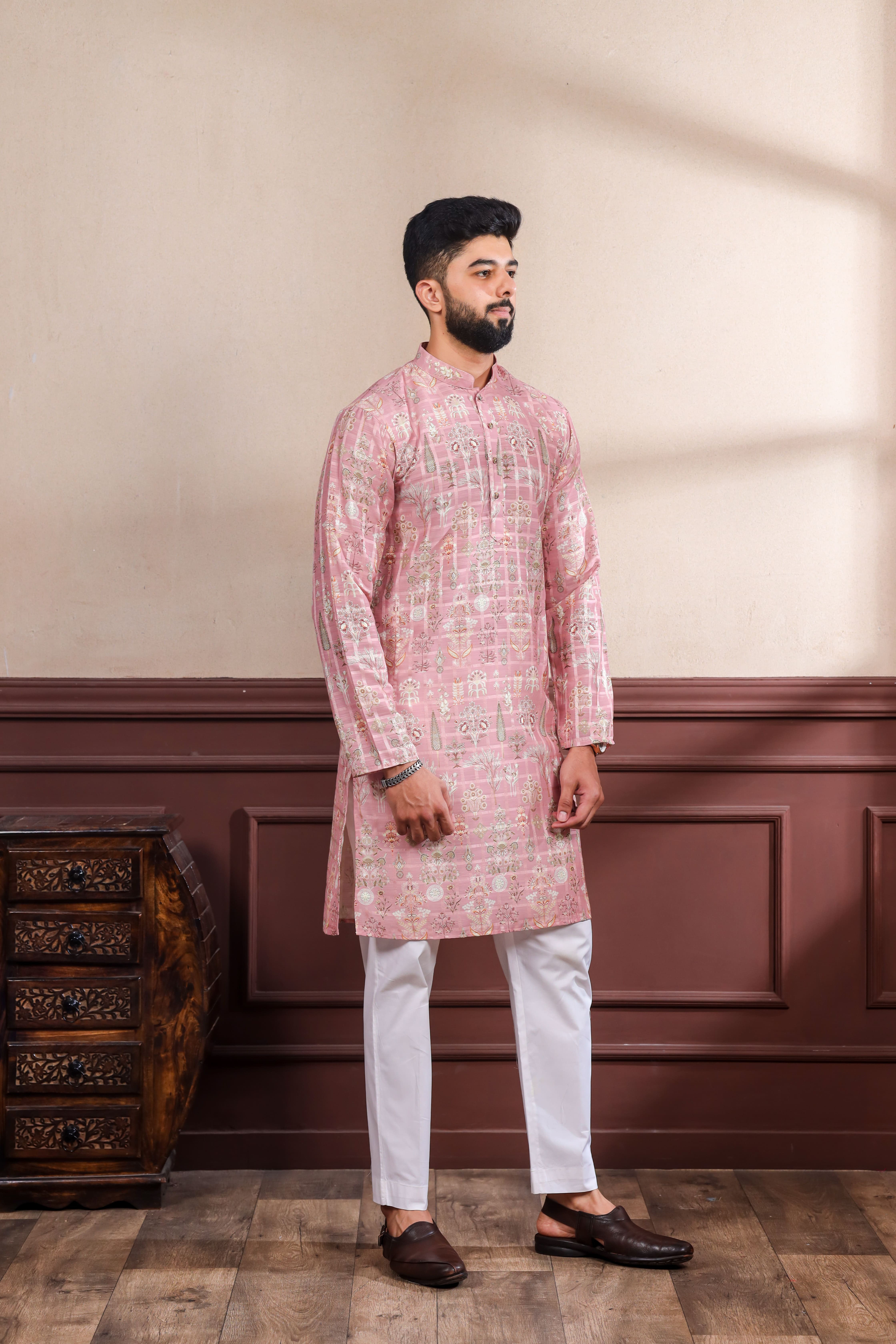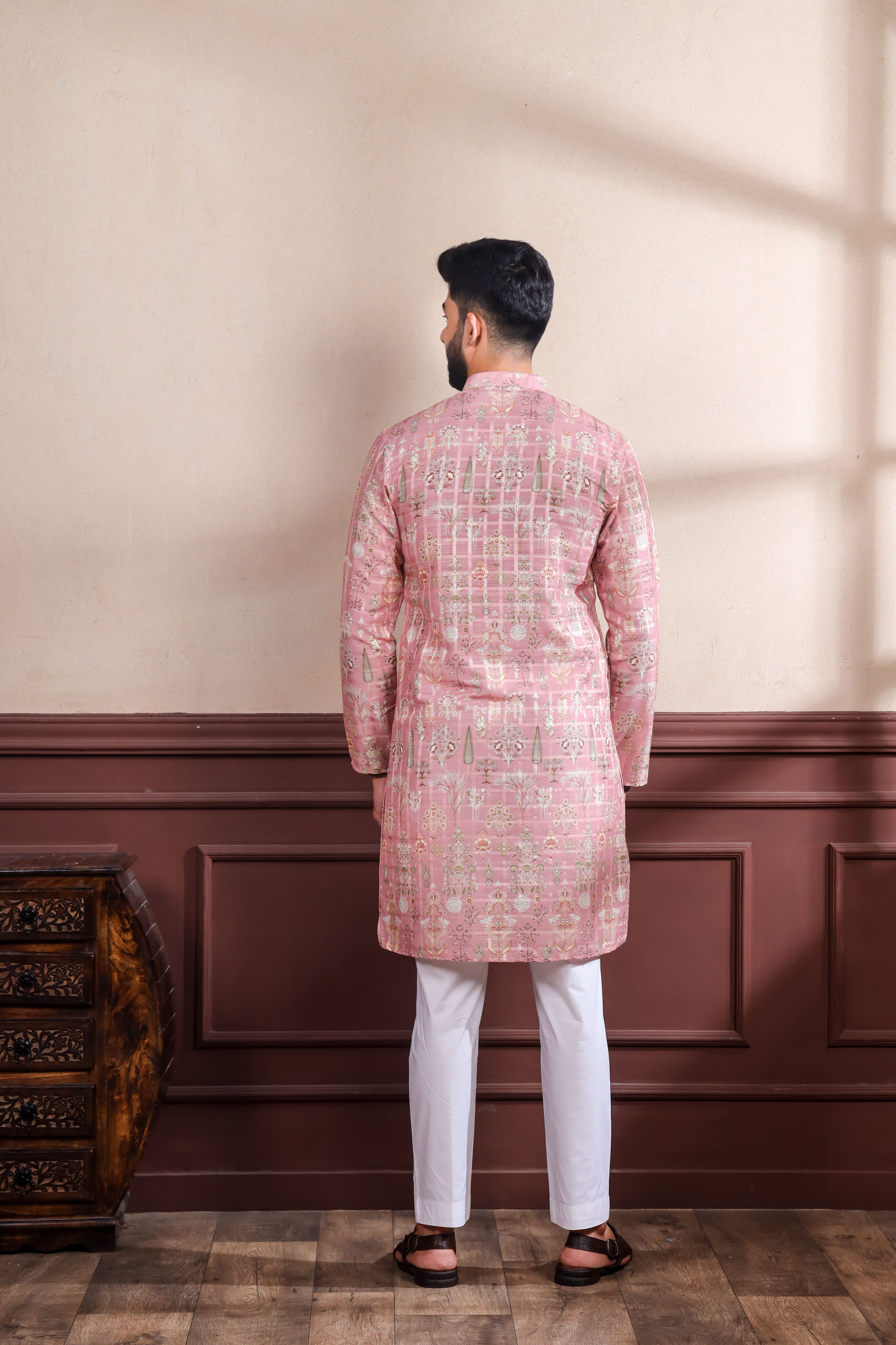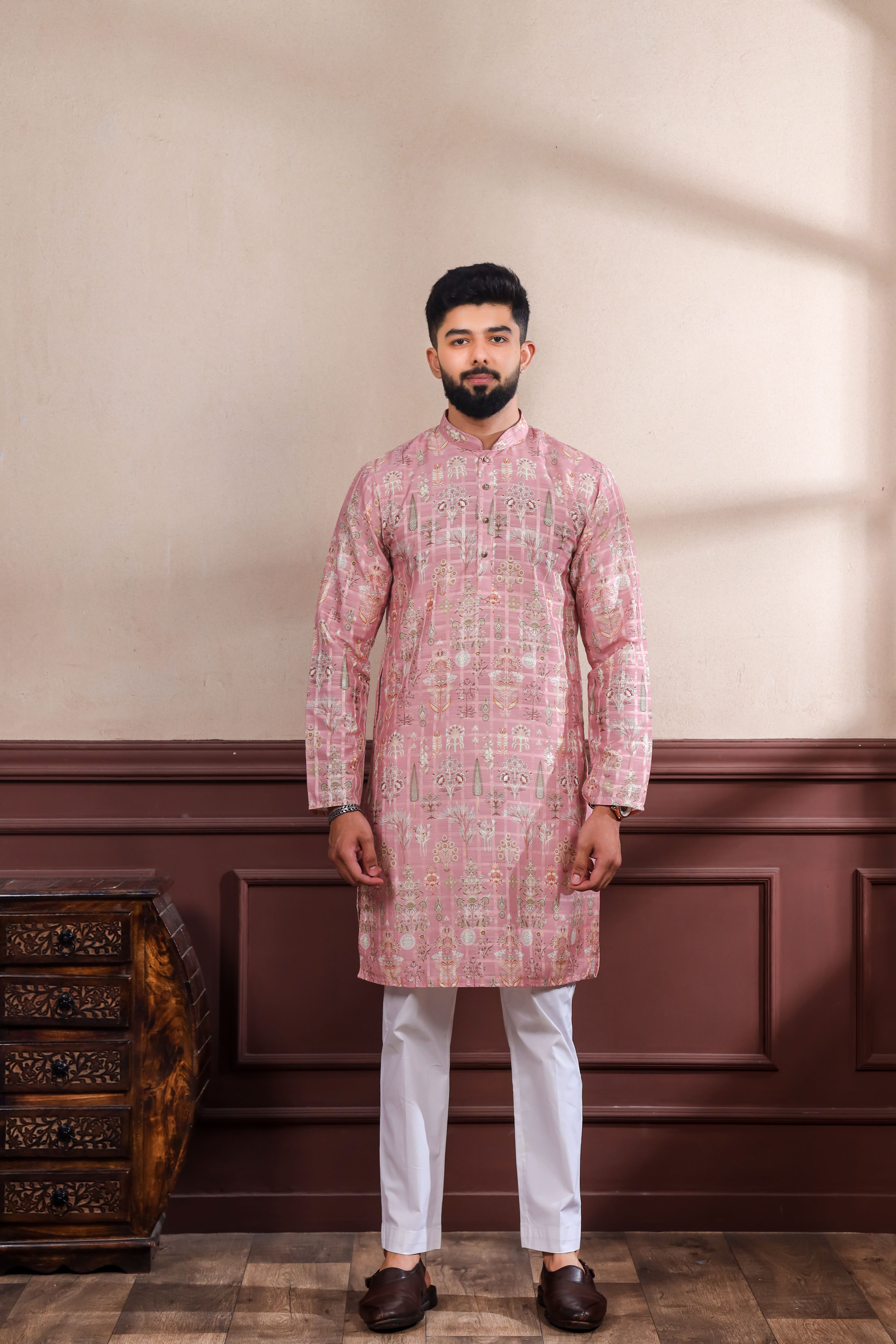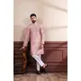 Pink Color Ethnic Woven Patta With Digital Printed Ceremonial Kurta Payjama For Men's