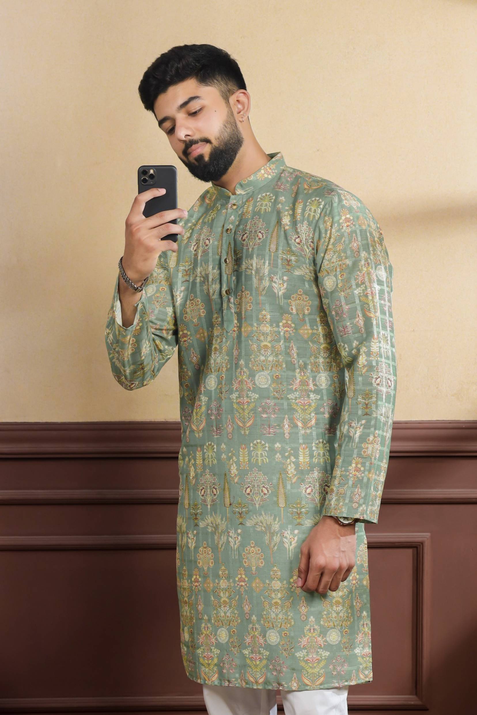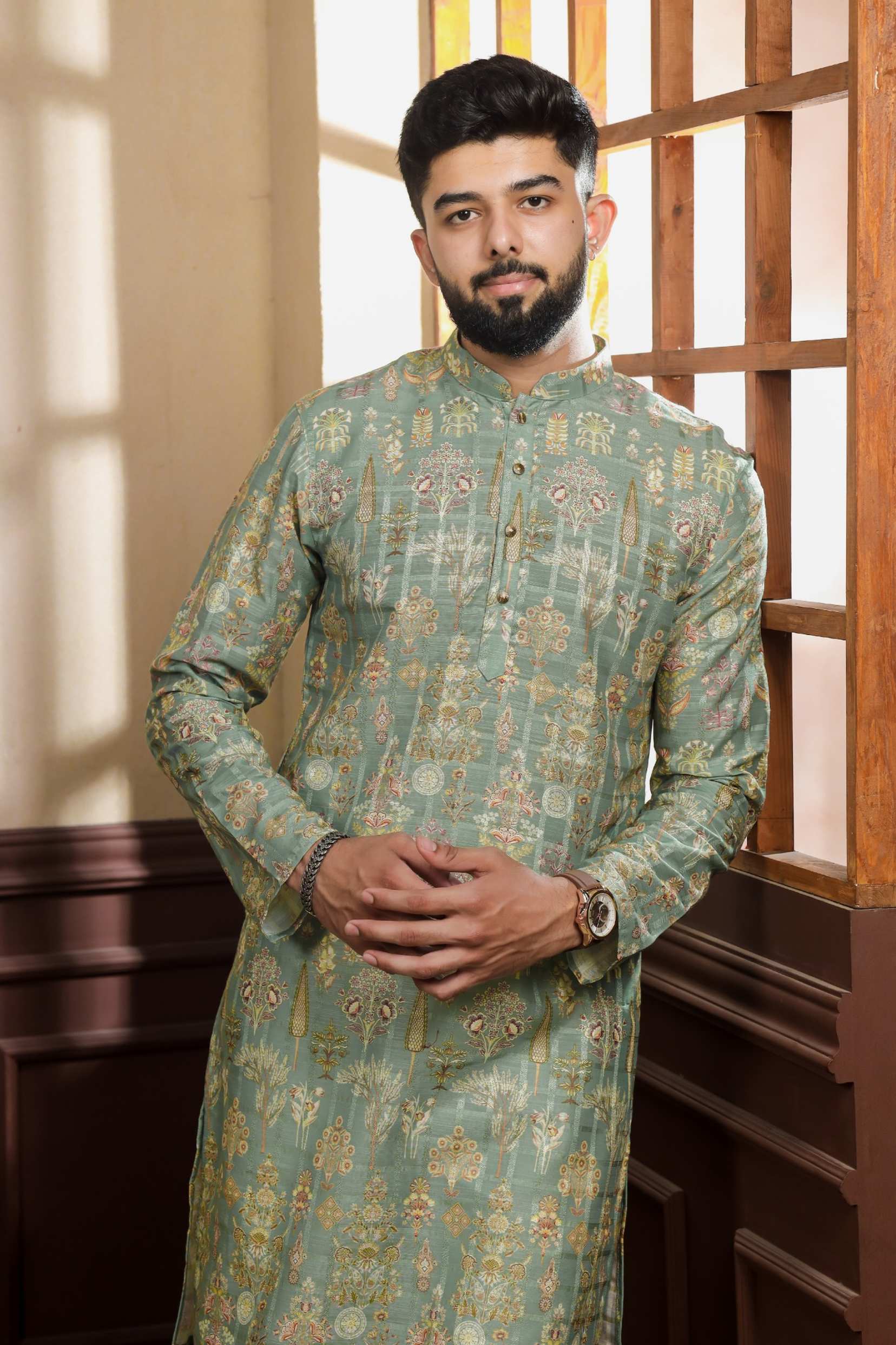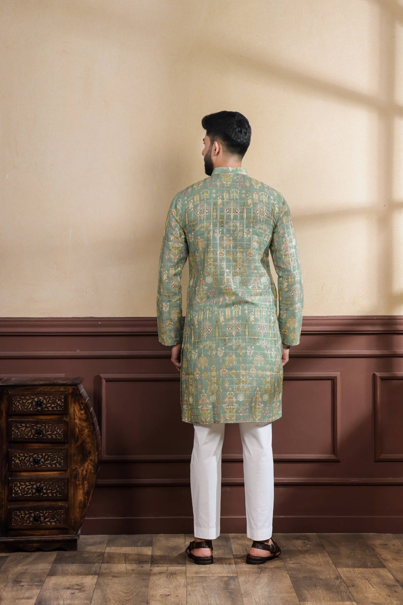 Pista Color Ethnic Woven Patta With Digital Printed Ceremonial Kurta Payjama For Men's
