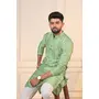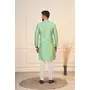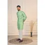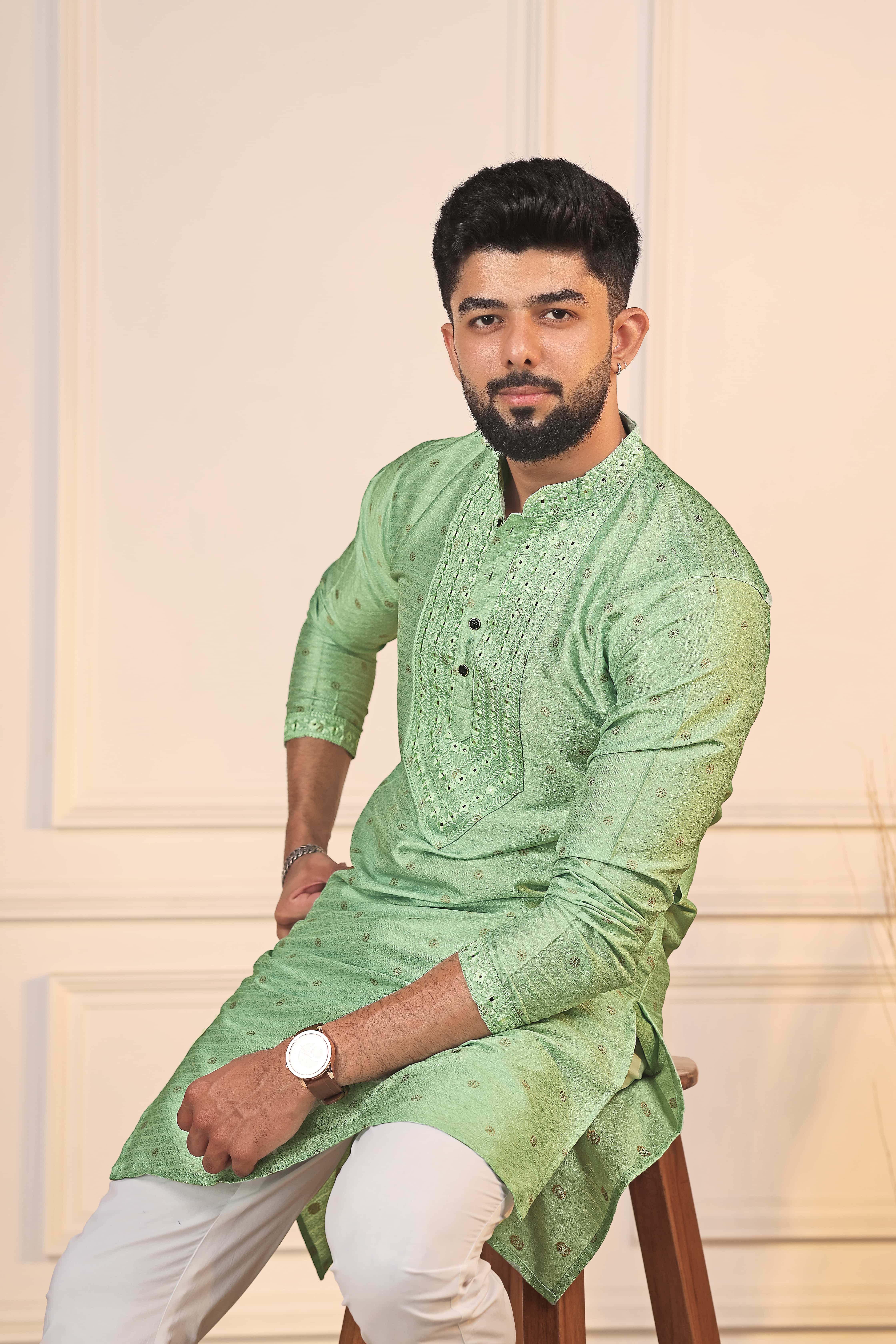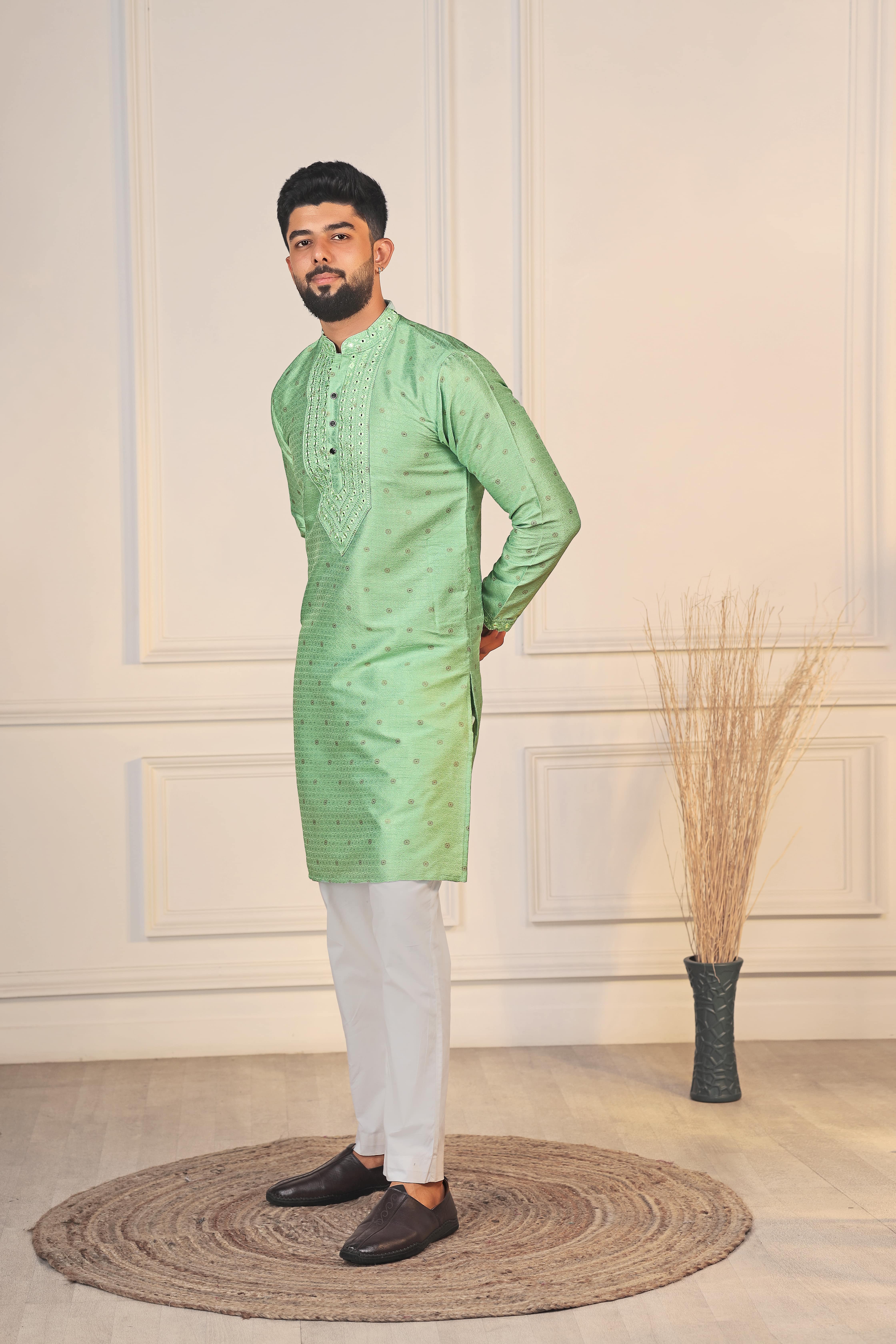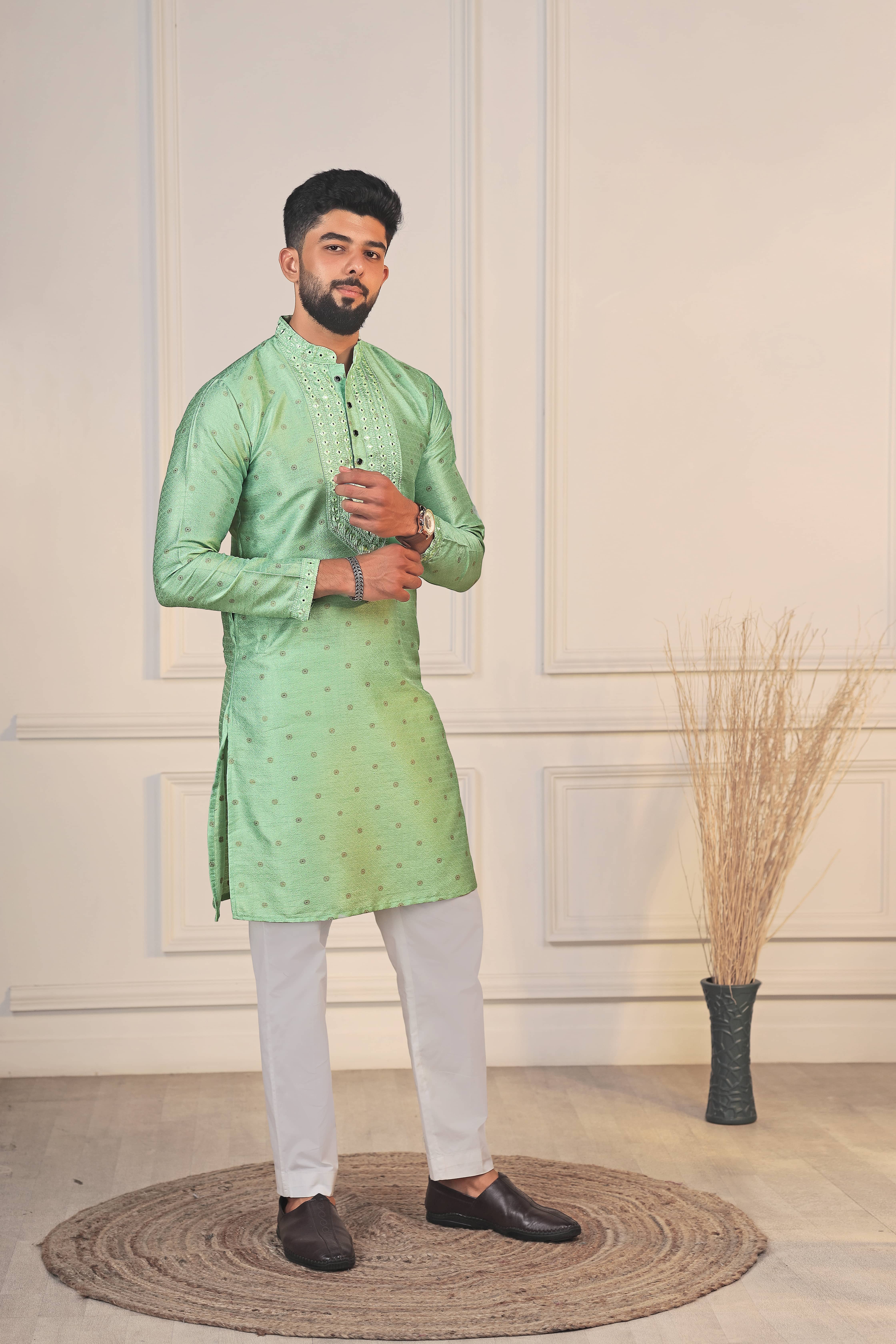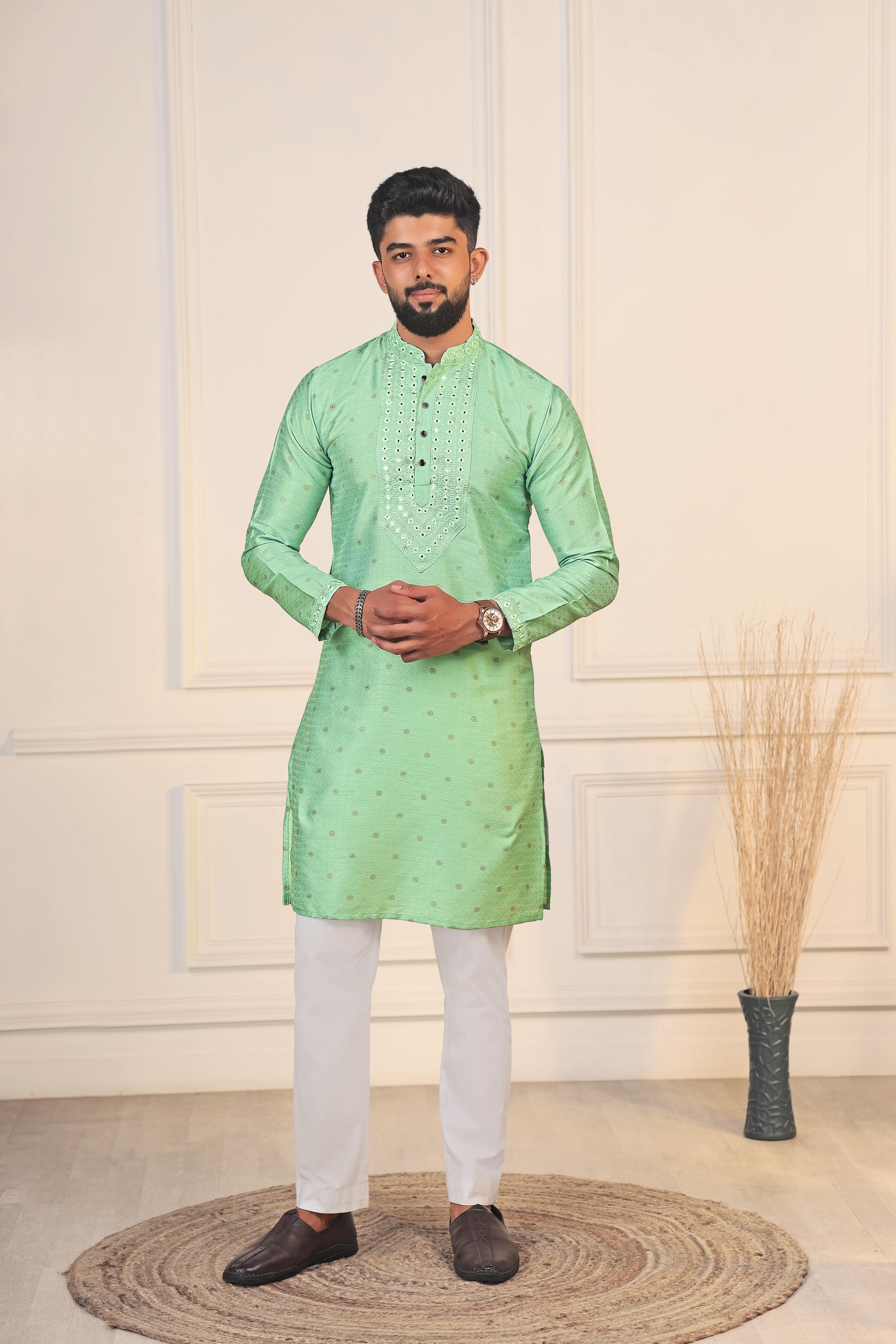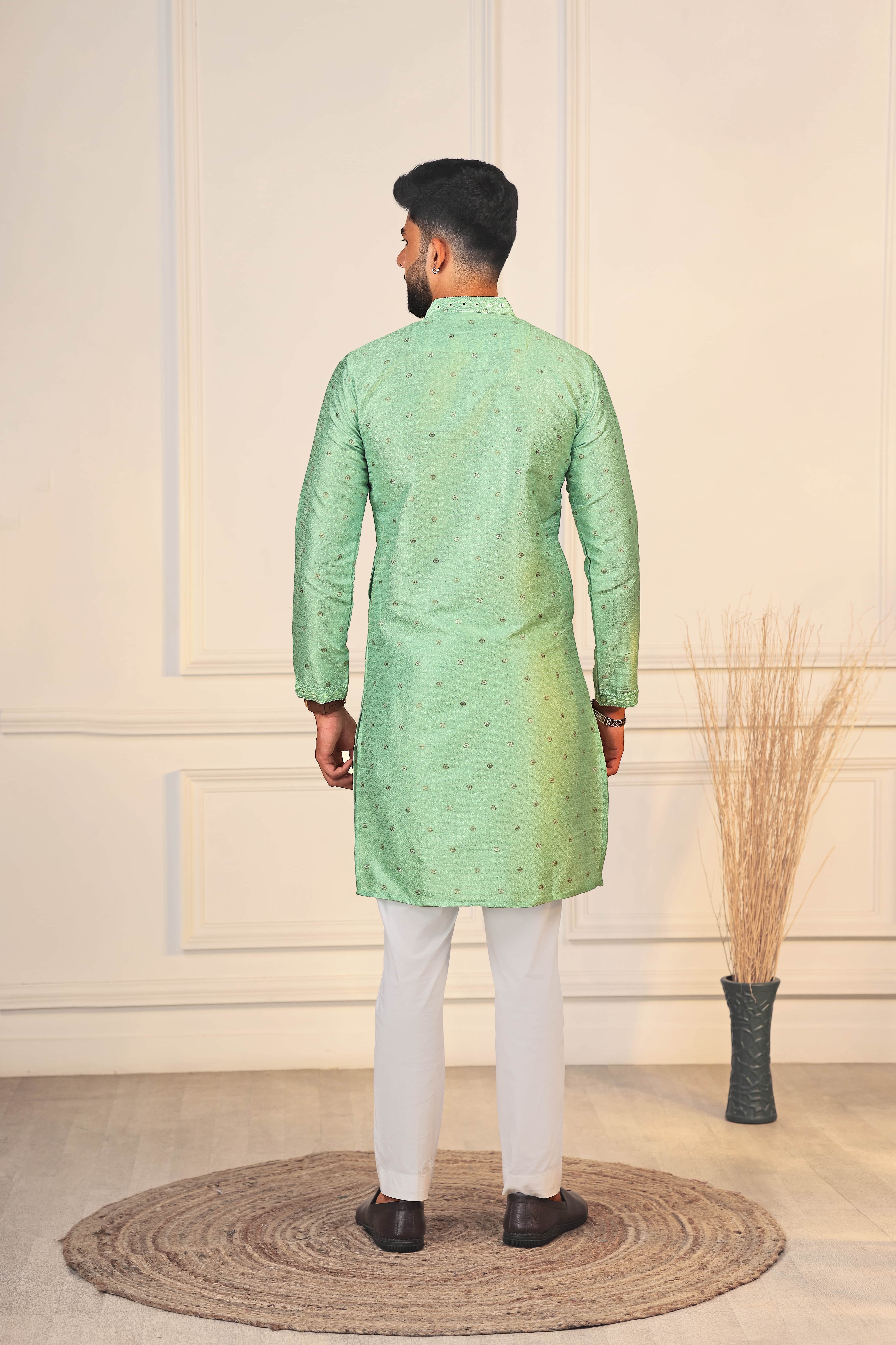 Pista Color Jacquard Silk Fabric Designer Embroidered Kurta Payjama For Men's