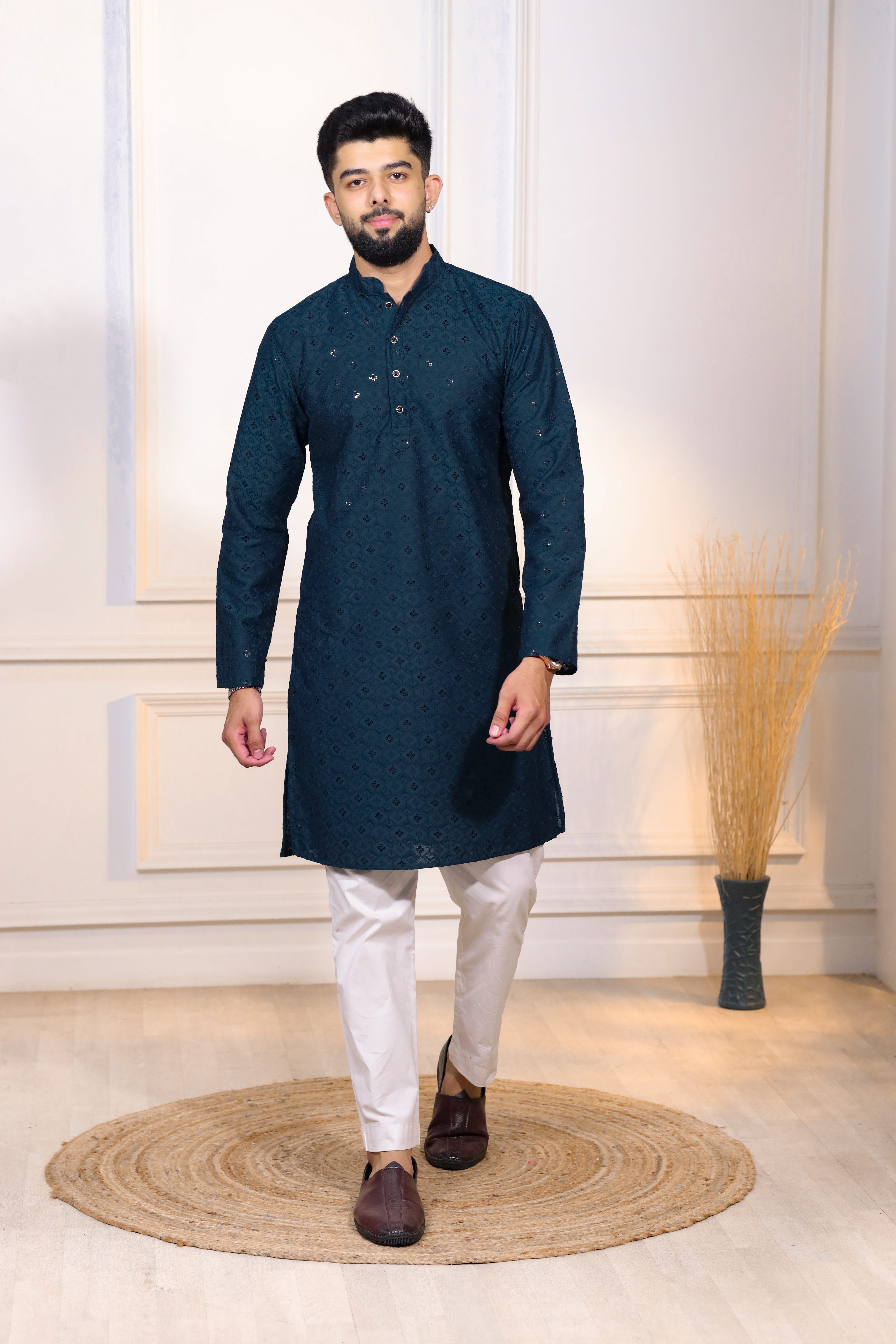 Teal Color Designer Embroidery Work Ceremonial Ethnic Kurta Payjama For Men's