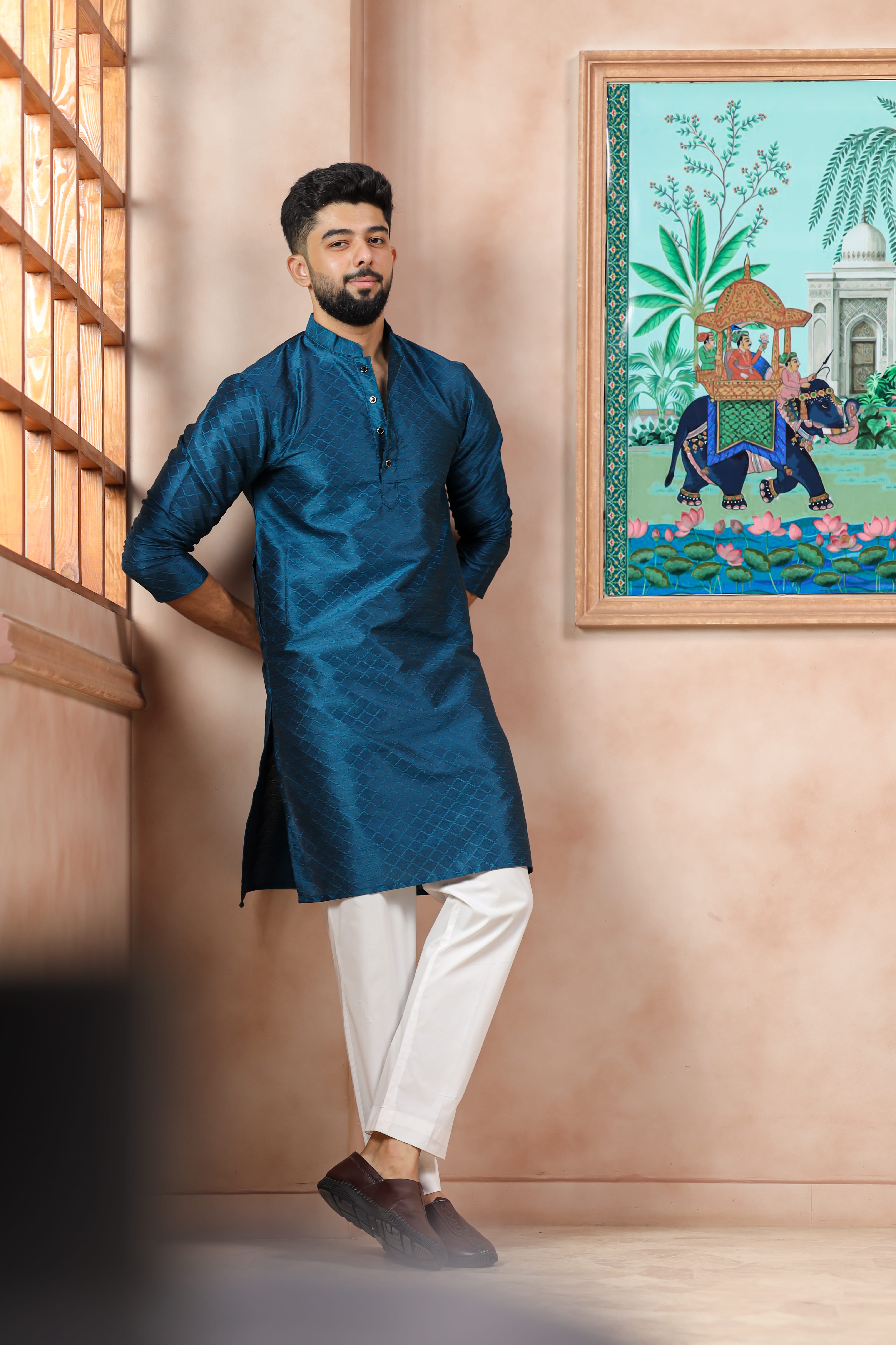Teal Color Graceful Partywear Kurta Payjama For Mens Ceremonial Looks