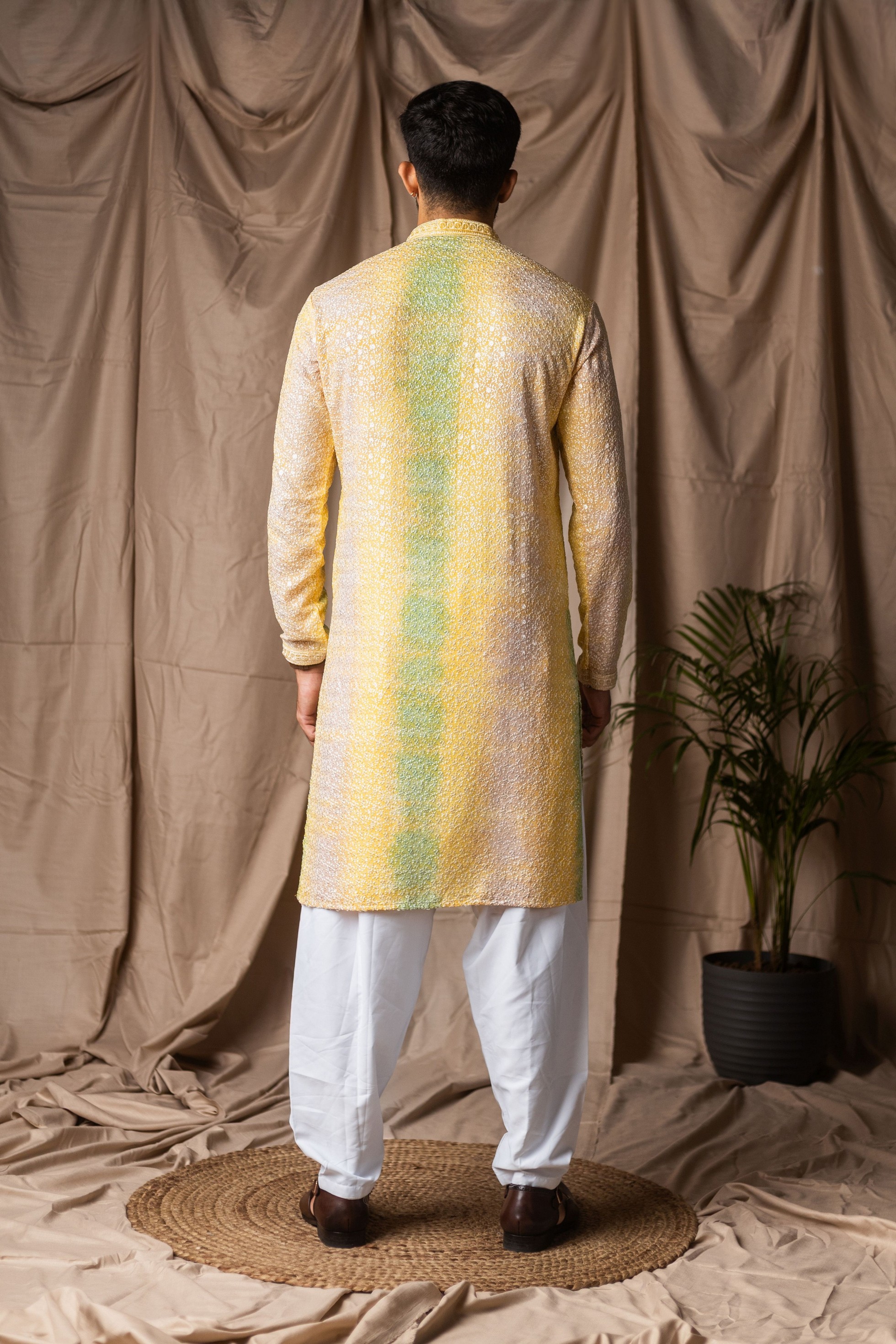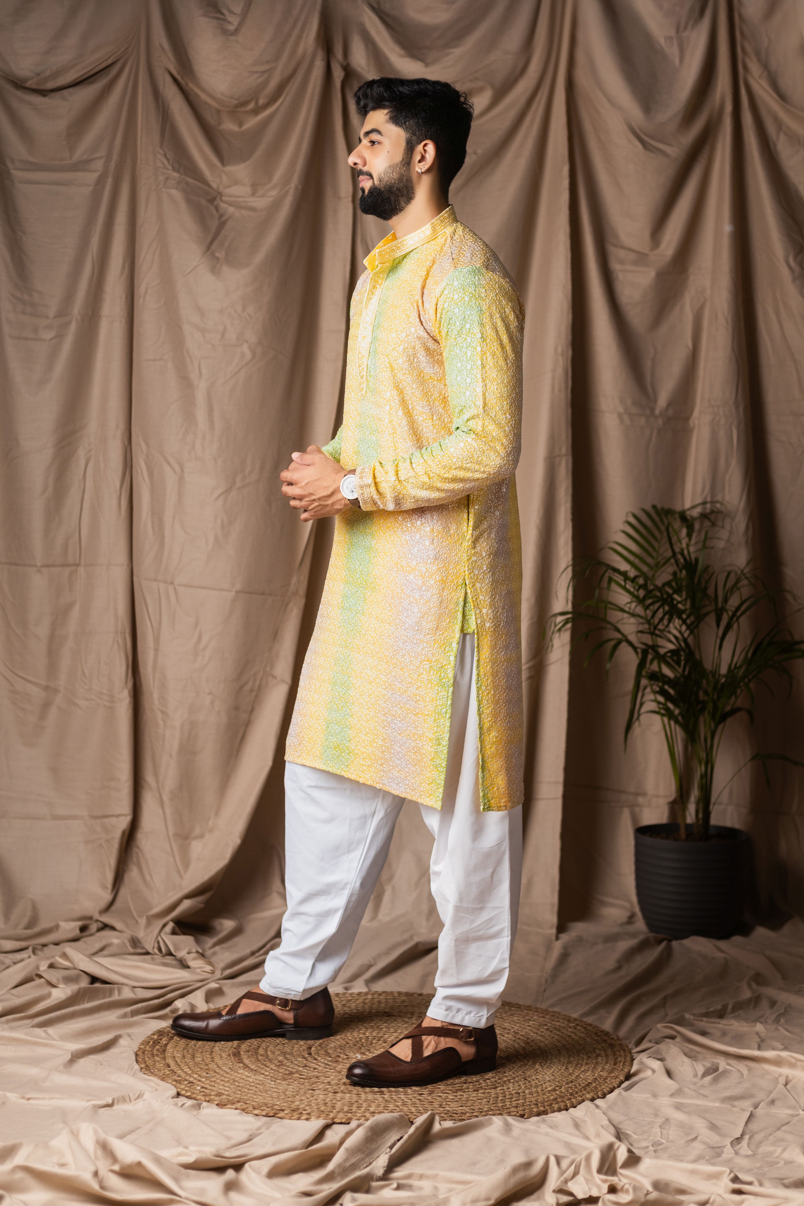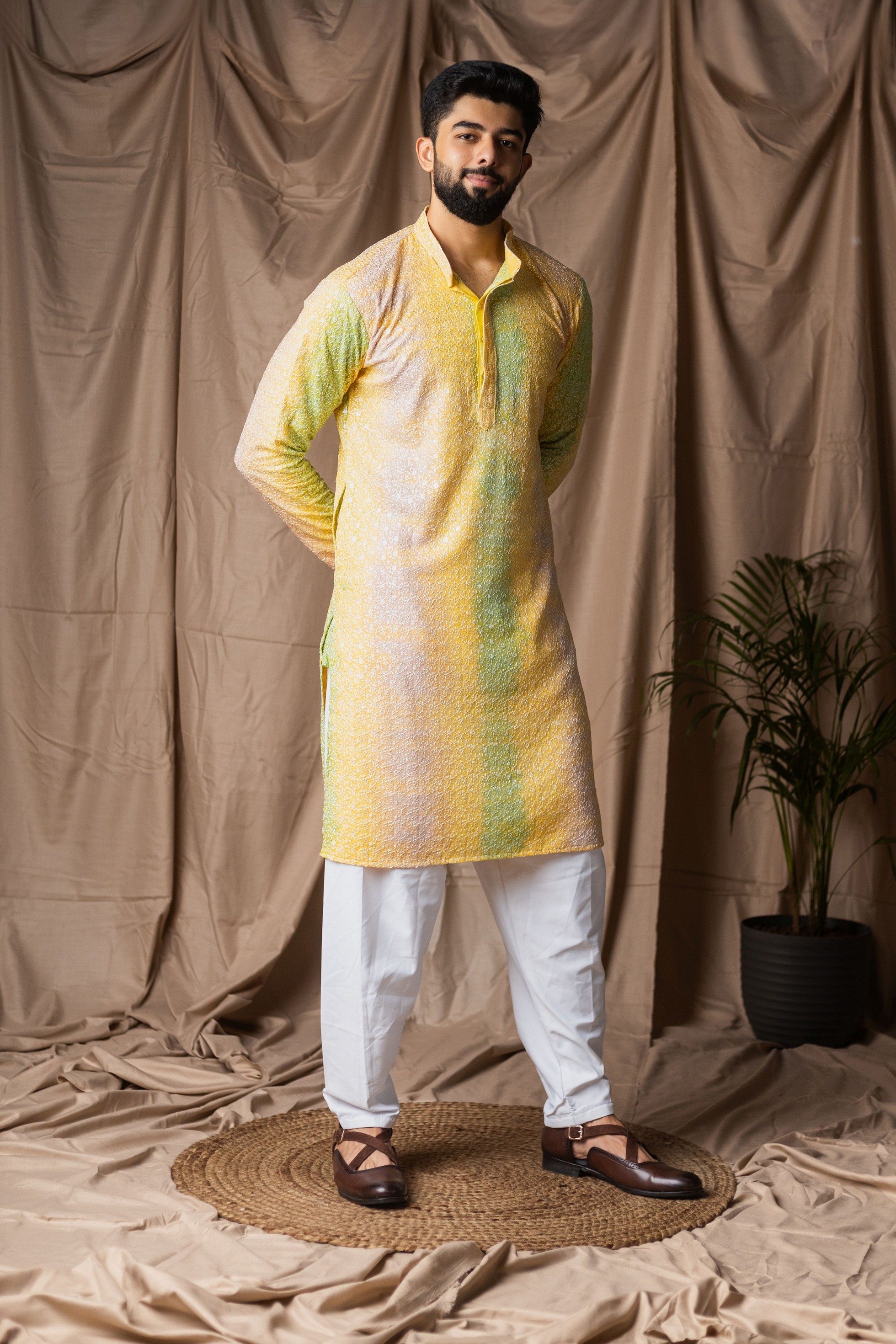 Yellow Color Rayon Fabric Festive Wear Ethnic Men's Embroidered Kurta Payjama