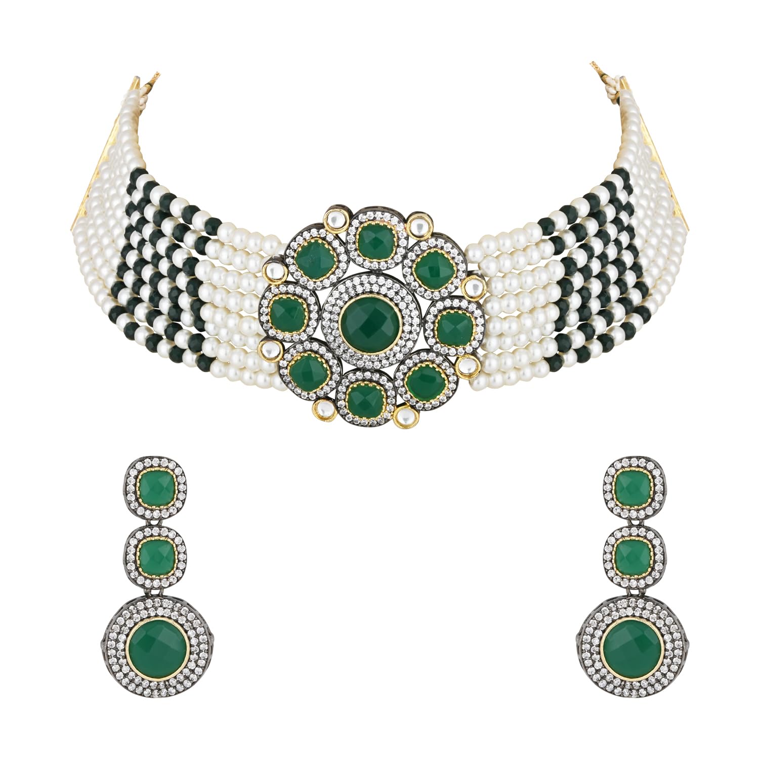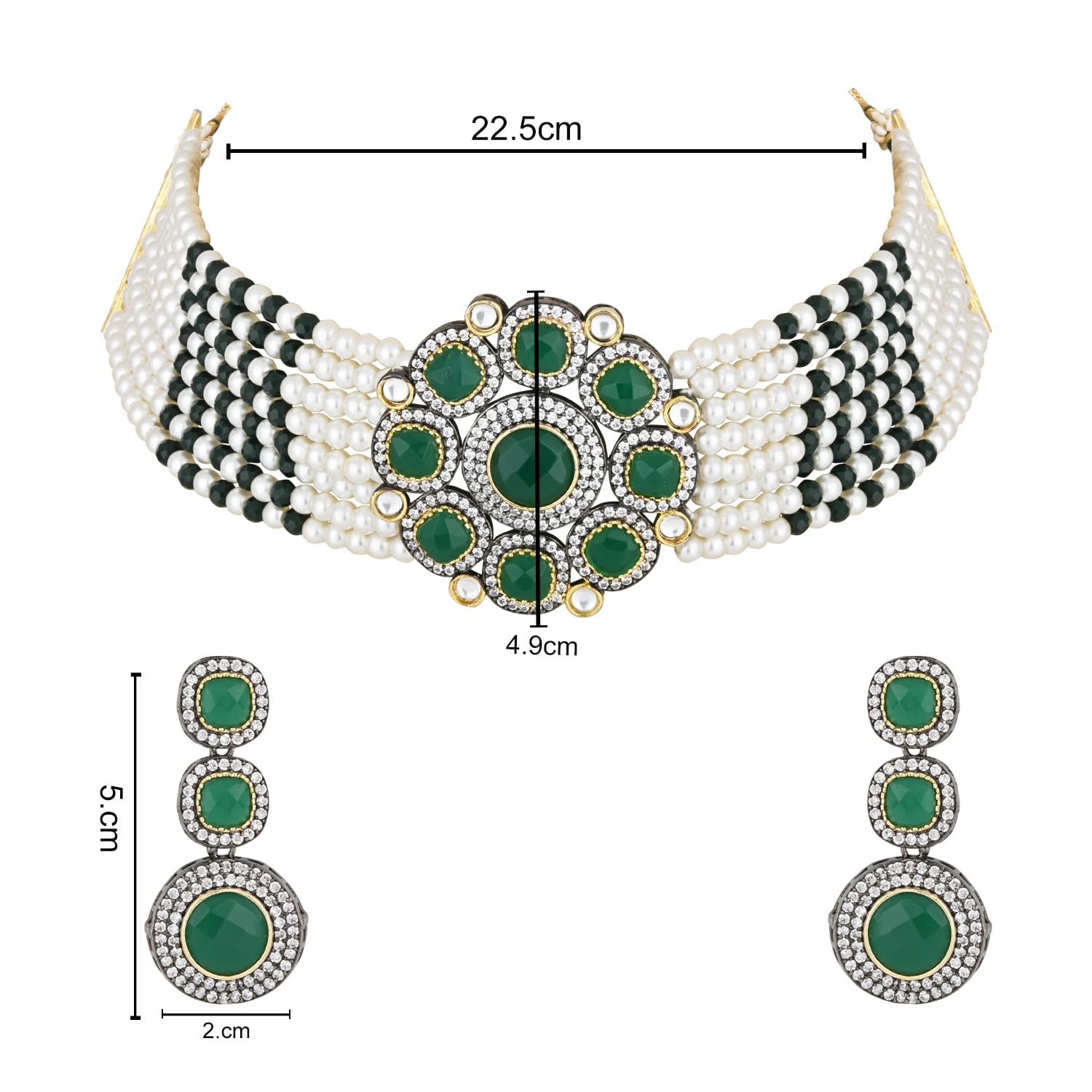 HomeFashionNecklaceI Jewels Traditional Royal Kundan Pearl Stone Multistrand Design Green Choker Necklace Jewellery Set With Earrings For Women (ML336WG)