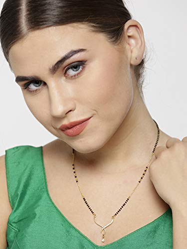 Attractive Design & Style: This manra is crafted in a V-shaped design featuring an -studded wave-like figure with a tiny drop at the bottom. The gold-tone and black beads in this gold manra () hold great importance in Indian tradition as they symbolize Go