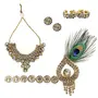 Package contains 1 Mala 1 Mukut 2 Earings 2 Hanth Phool / Kadhe 1 Morpankh Bansoori.
