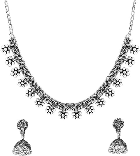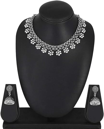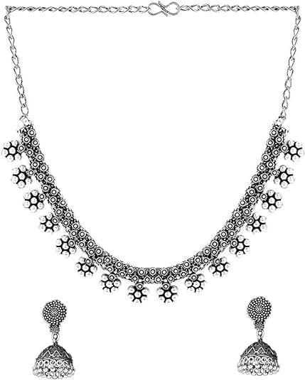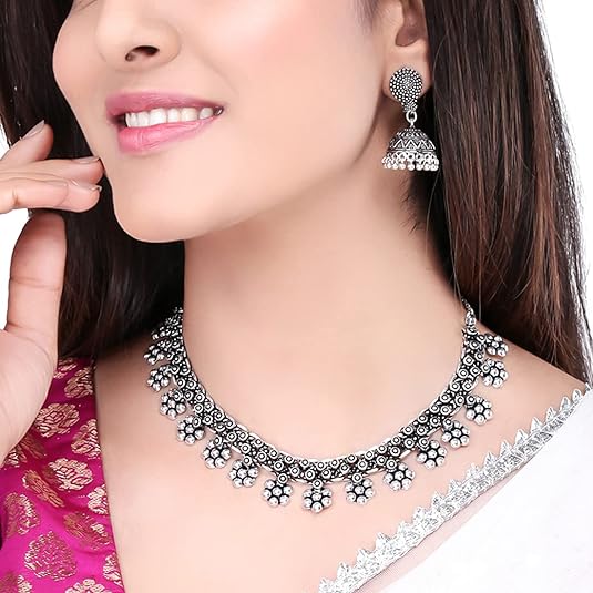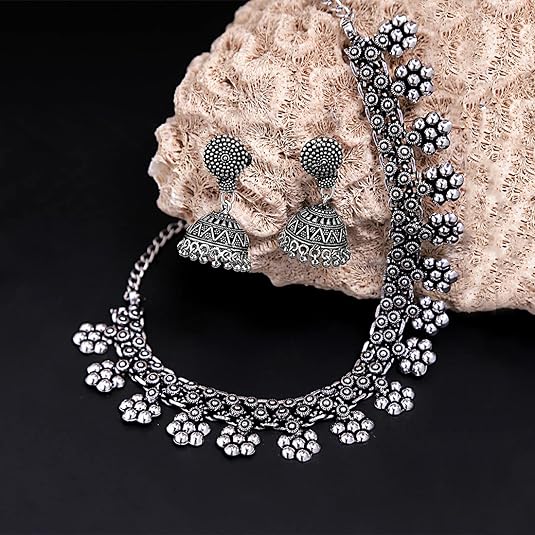 Modern yet Ethnic Looks- German Silver Oxidized Necklace set for women representing a classic fusion of exquisite craftsmanship and feminine elegance Peacock choker Necklace set with earrings which is stylish contemporary fringe celebrity Style.Our Produc