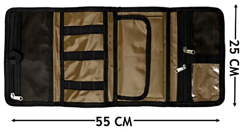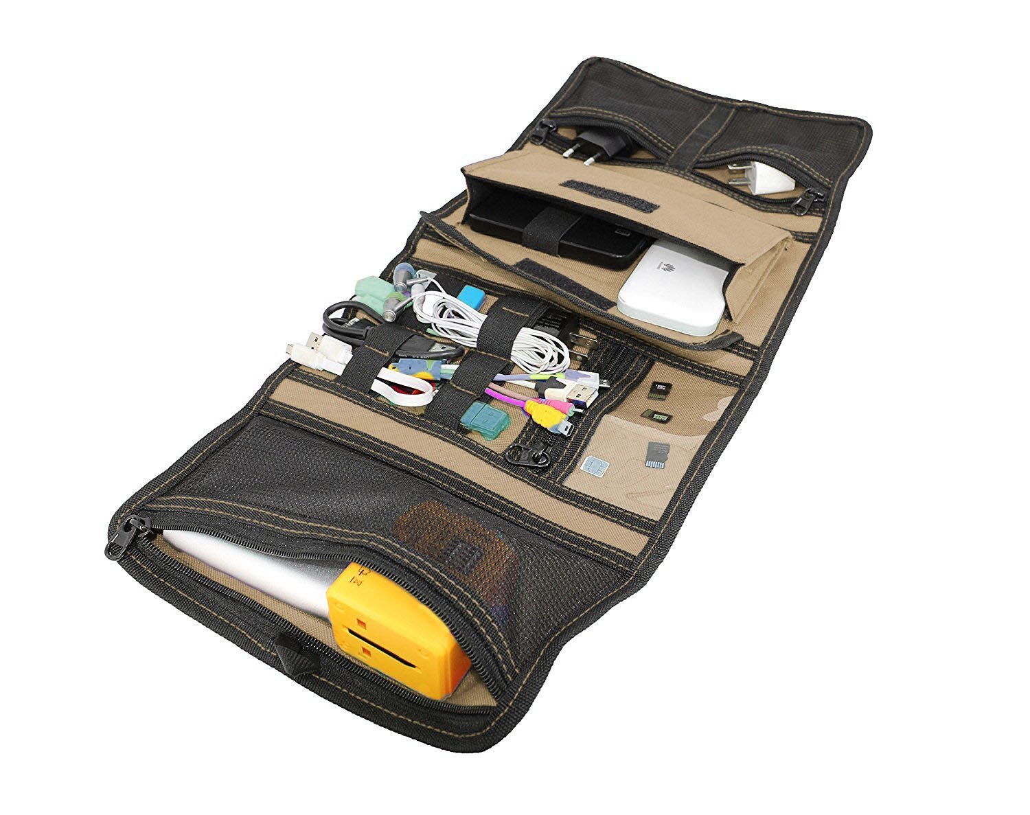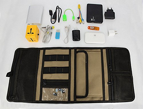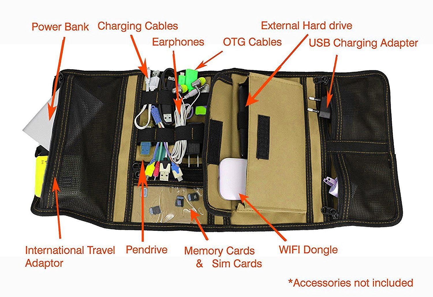 Compartments: 4 large & 8 small elastic organizer to hold various items like cables pens drive and tools etc. 2 small 1 large mesh pocket with zipper for external hardisk power bank 1 small mesh pocket with Velcro closure for memory & sim cards 2 addition