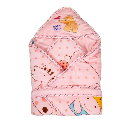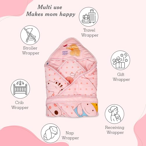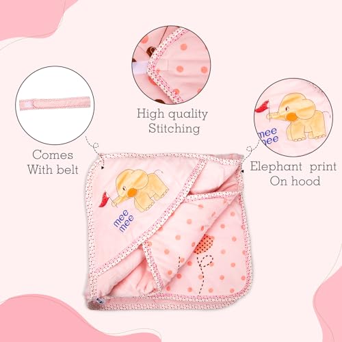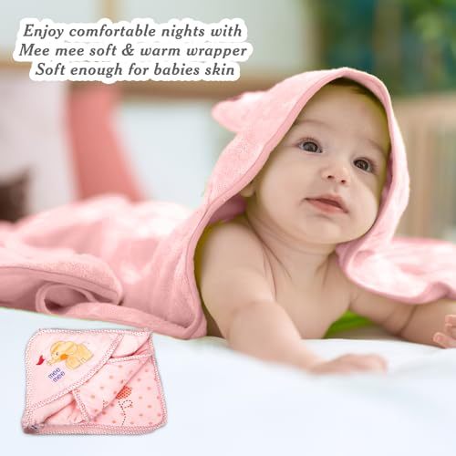 Mee Mee 100% Soft Cotton Hooded Baby Wrapper Cum Warmer, Blanket with Hood for New Born Baby 0 to 6 Months (Pink Printed)