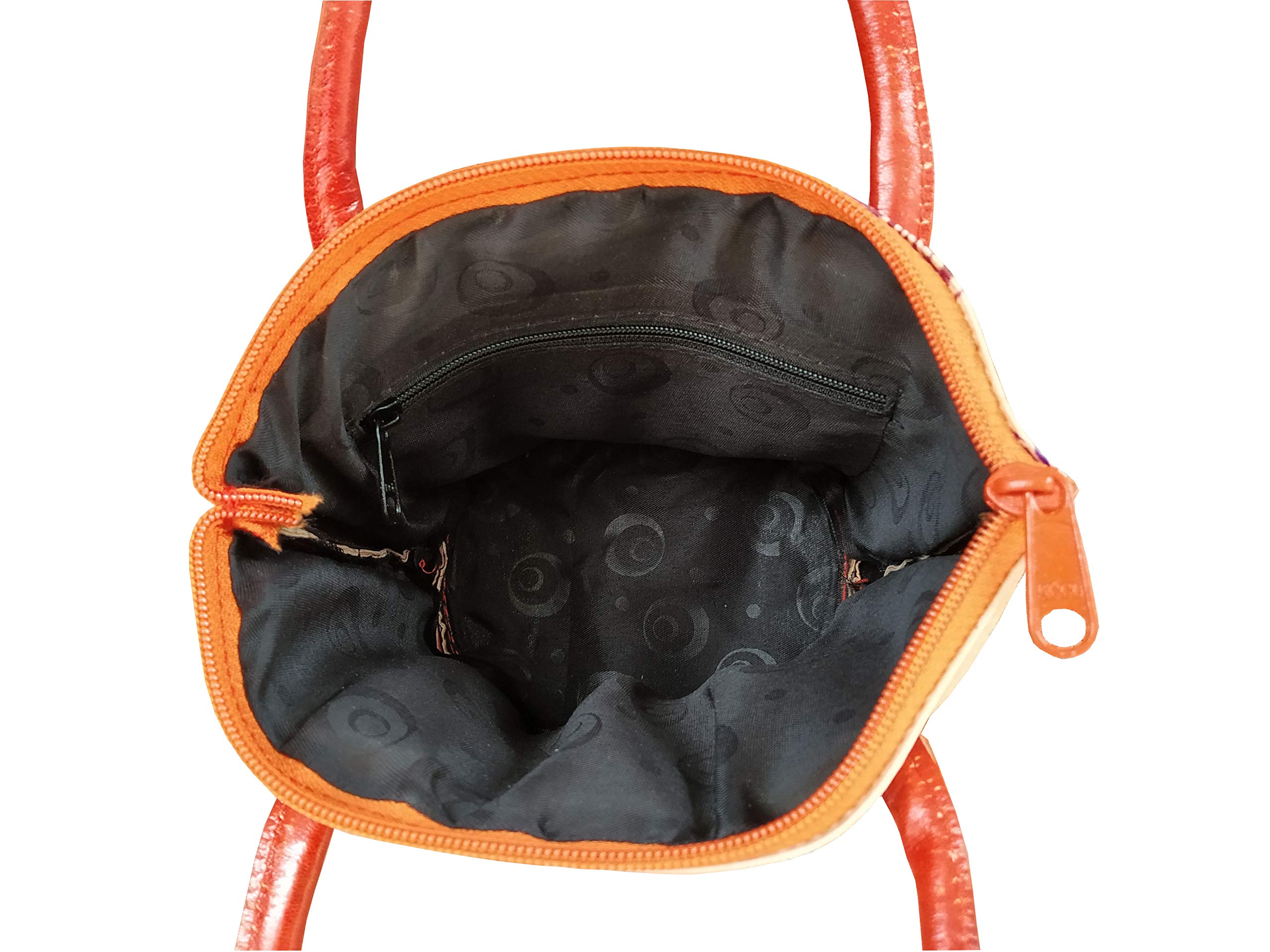 Design on Both Sides Double Handle One Main compartment and One Cell phone compartment Inside. Closes fully with zip.