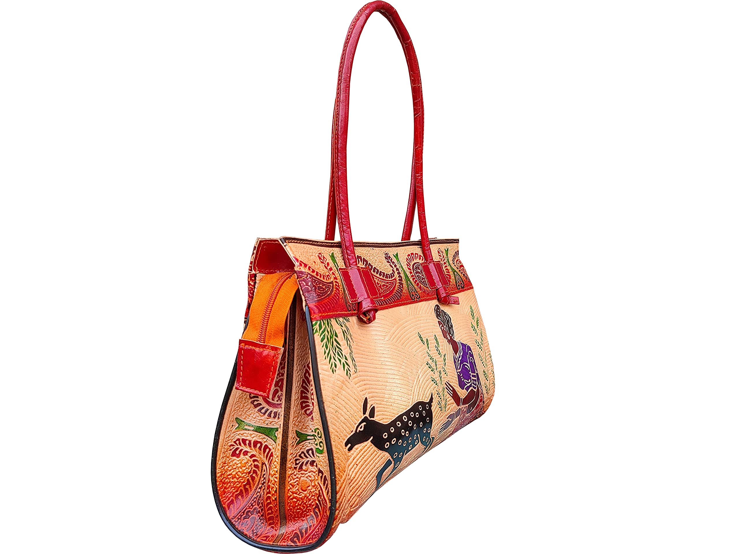 SHANTINIKETAN EMBOSSED LEATHER PRODUCTS Shantiniketan Pure Leather Block Printed Shoulder Bag Purse for Women (Orange)