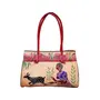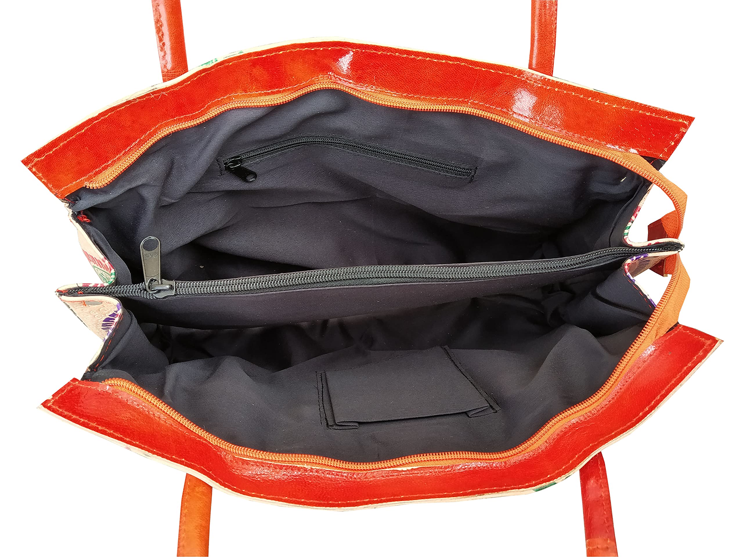 Design on Both Sides Double Shoulder Tote Handle One Main Zipper compartment One Zipper pocket in Back and Three Compartments inside Two zipper and One open cell phone compartment. Closes fully with zip. Weight :-- 336g.