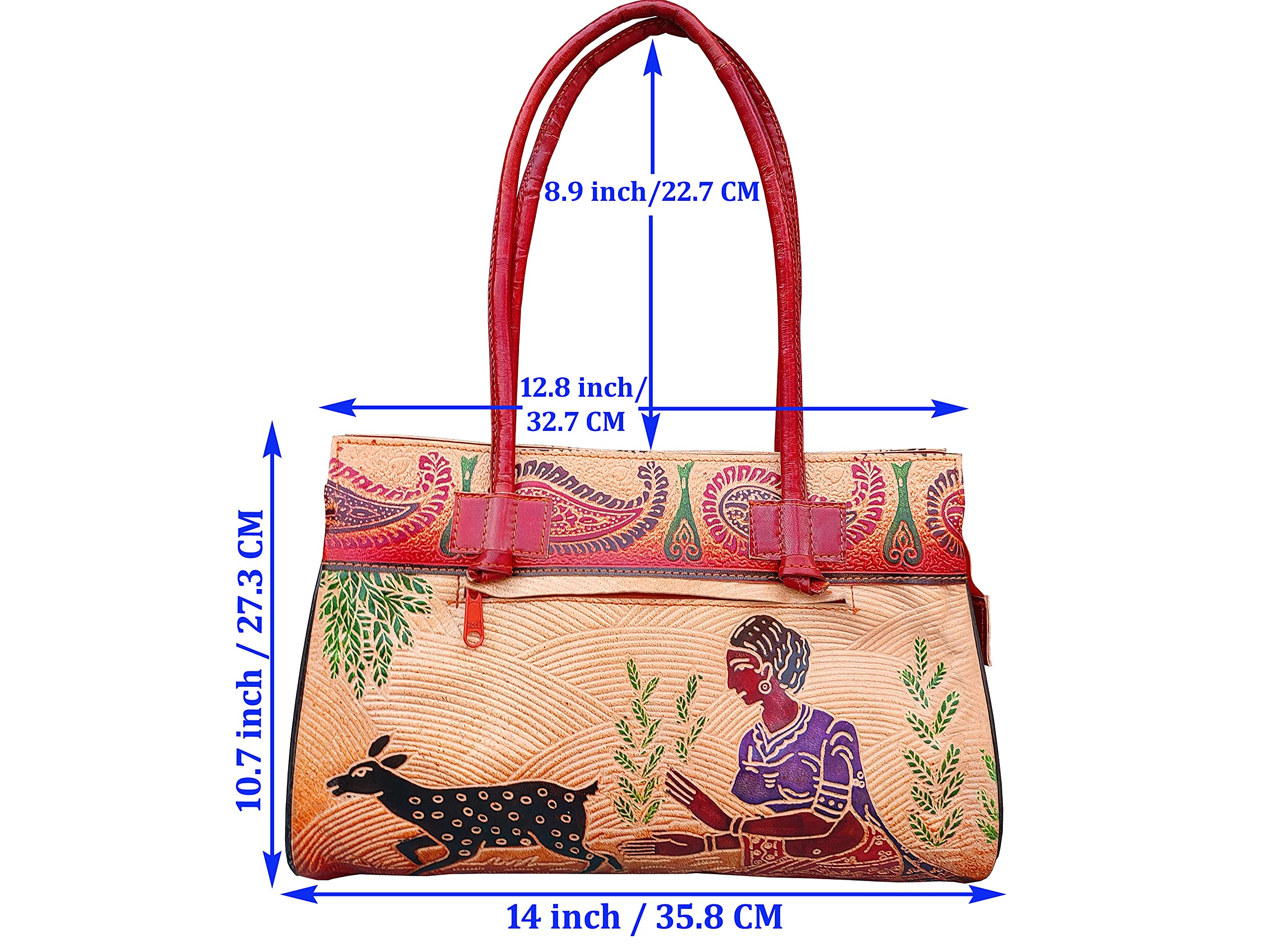 Dimension: - Height: 10.7 inch / 27.3 cm Width at Base: 14 inch / 35.8 cm Width at Top: 12.8 inch / 32.7 cm Shoulder Strap : 8.9 inch / 22.7 CM Outer Material Leather Traditional Block printed. Care Instruction: Clean it with dry Cloth.